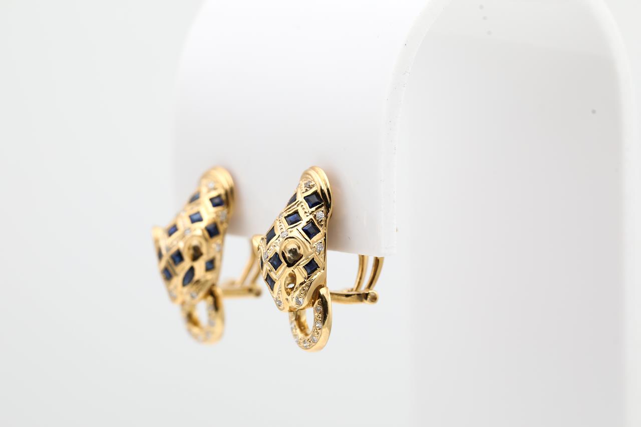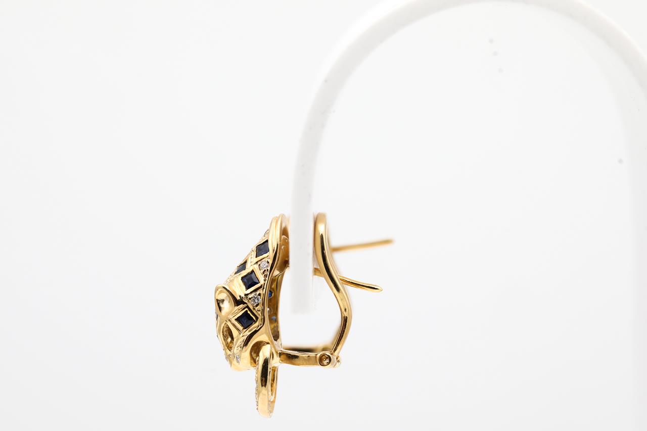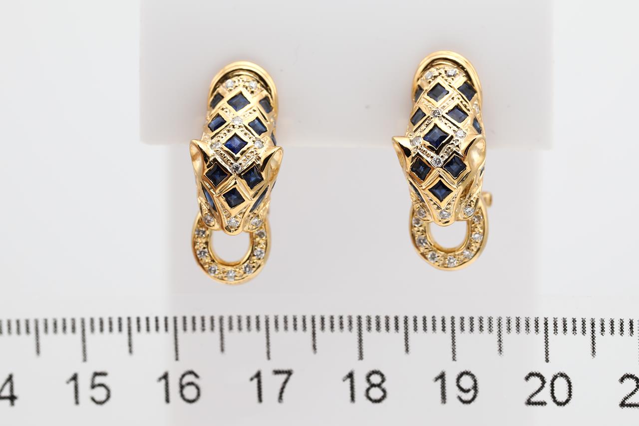 Sapphire and Diamond Leopard design clip-on earrings (for pierced and non pierced ears - foldable post) with blue sapphires (note 1 missing) and Diamonds totalling approximately 0.20cts. 18ct yellow gold. Weight 10.4g. (Pre-owned)