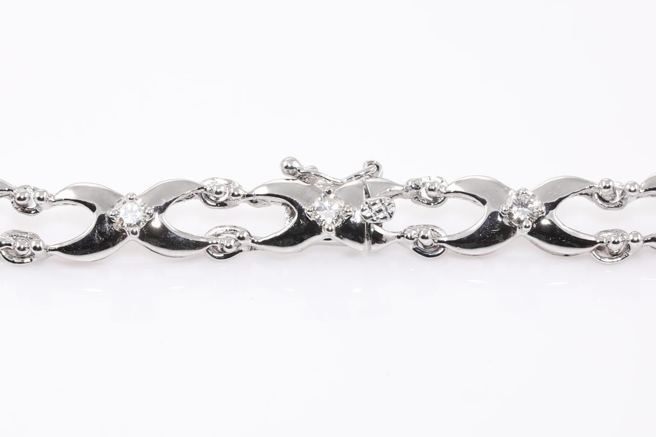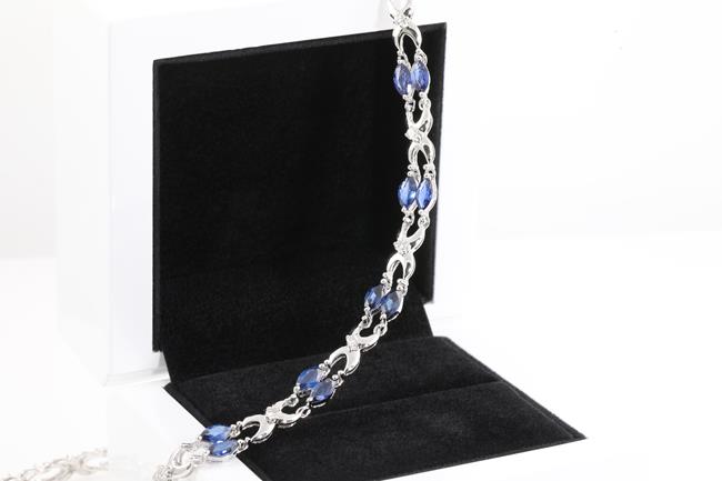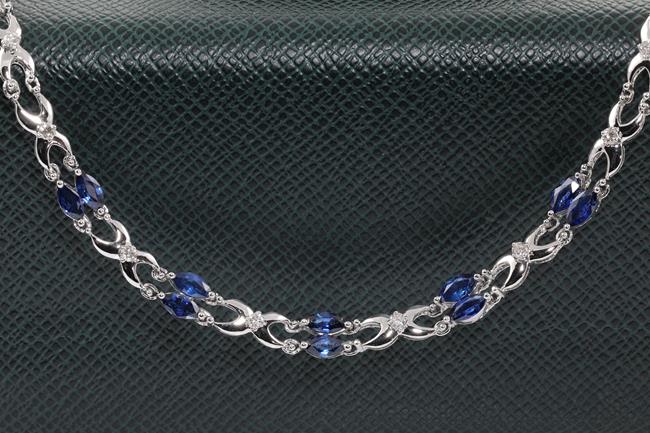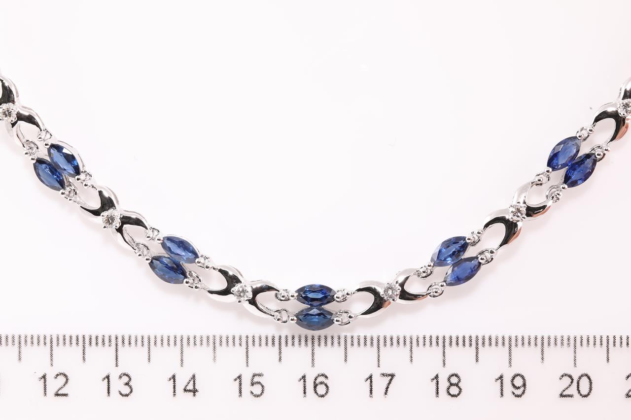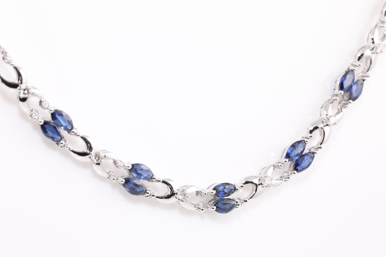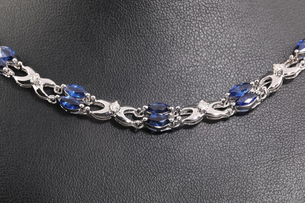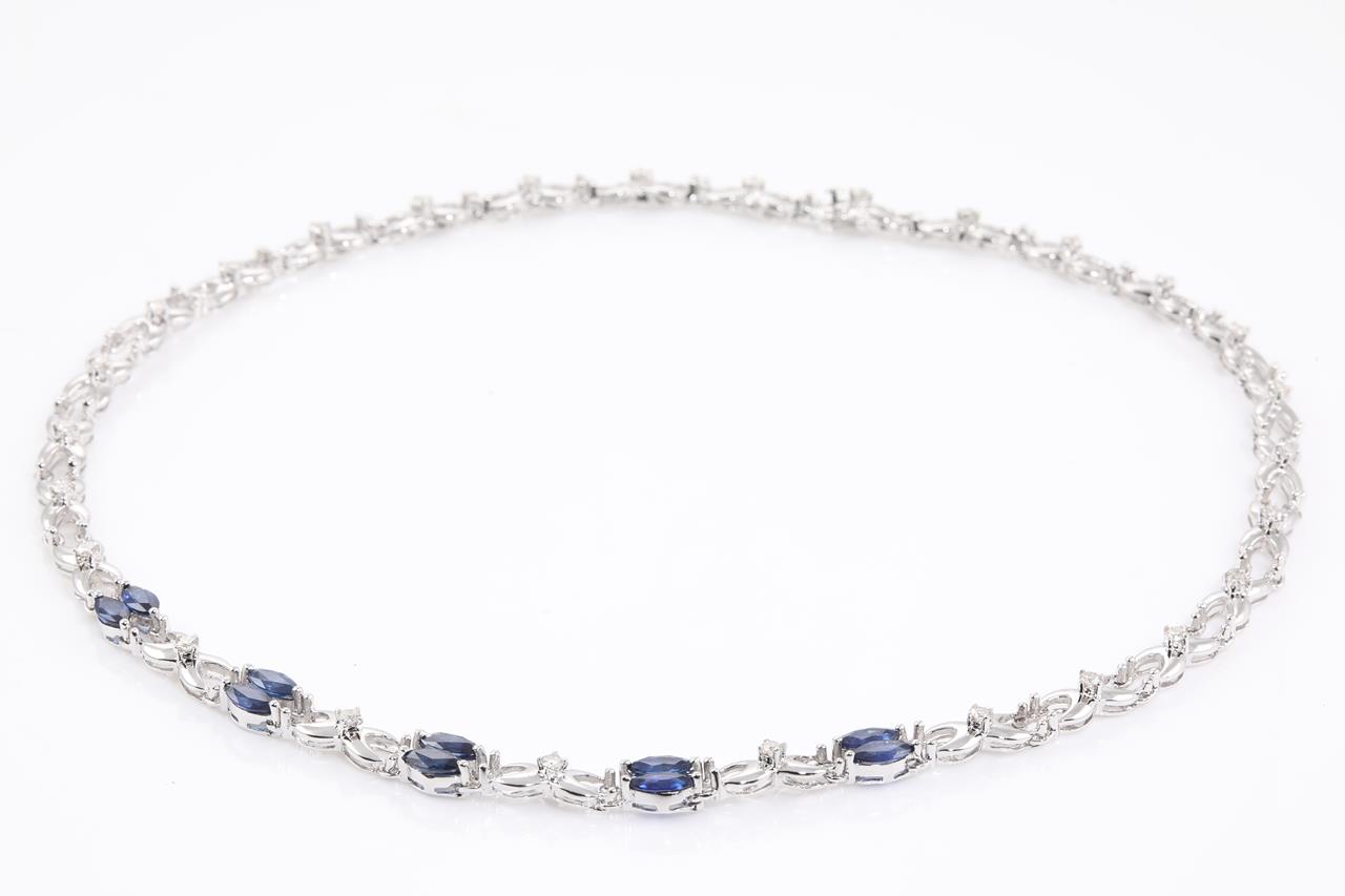 Sapphire and Diamond necklace with marquise cut blue Sapphires totalling 4.50cts and Diamonds totalling 1.55cts (Estimated grading: H-I SI). 18ct white gold. Length: 45cm. Weight: 29.3g. With certificate #414648. (Pre-owned)