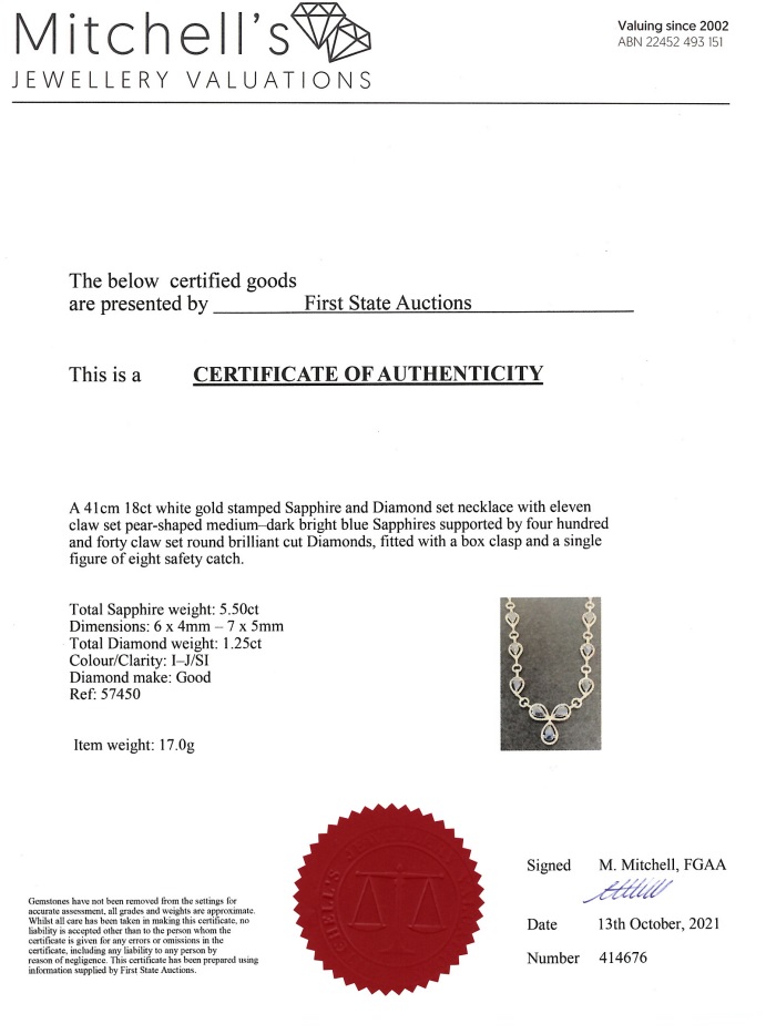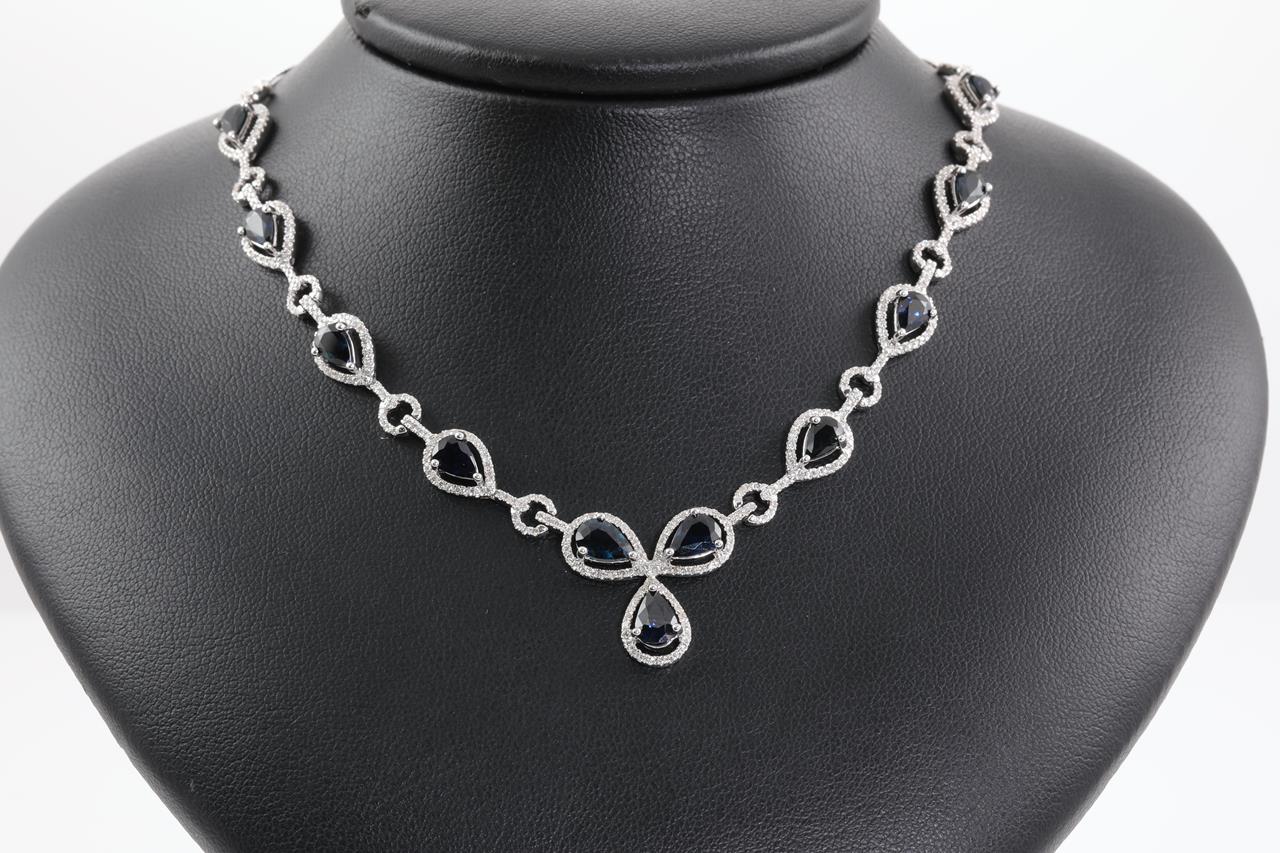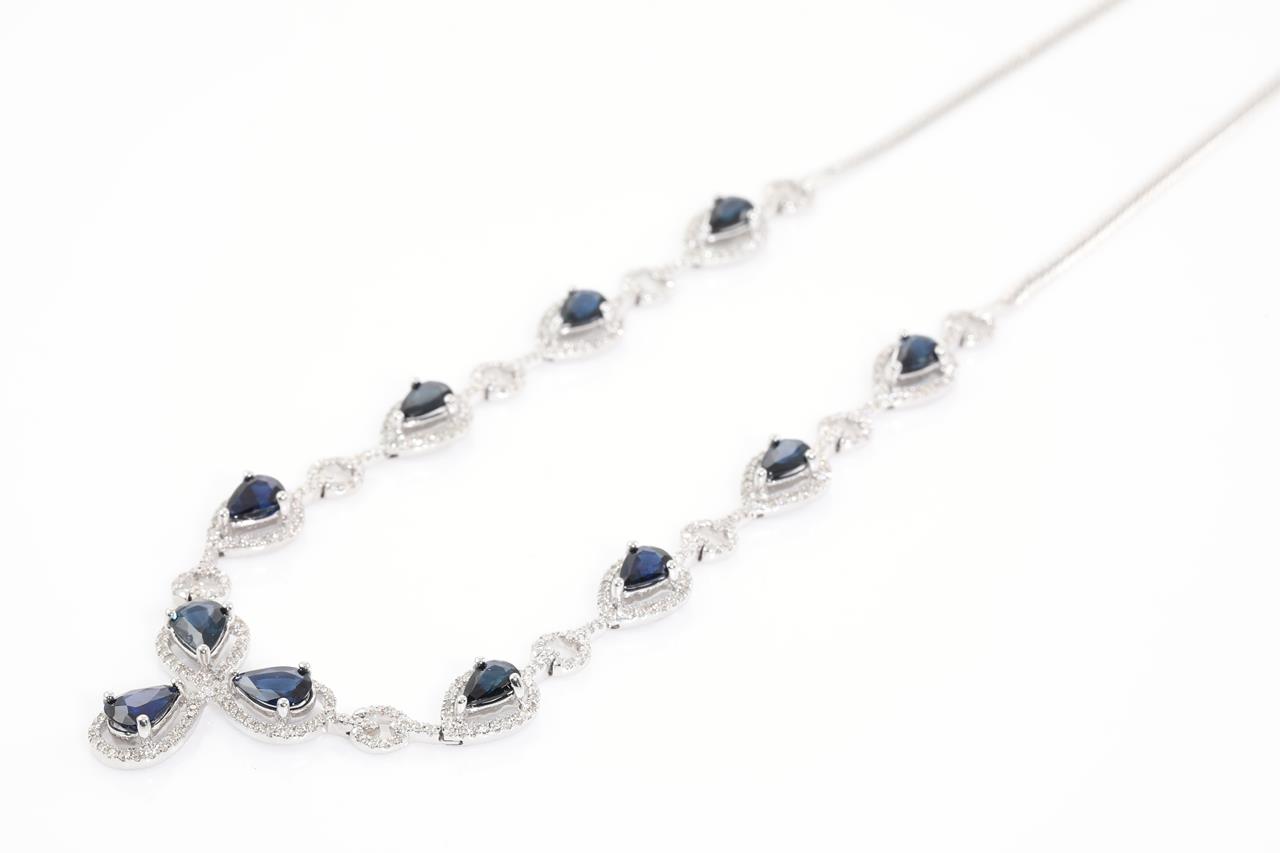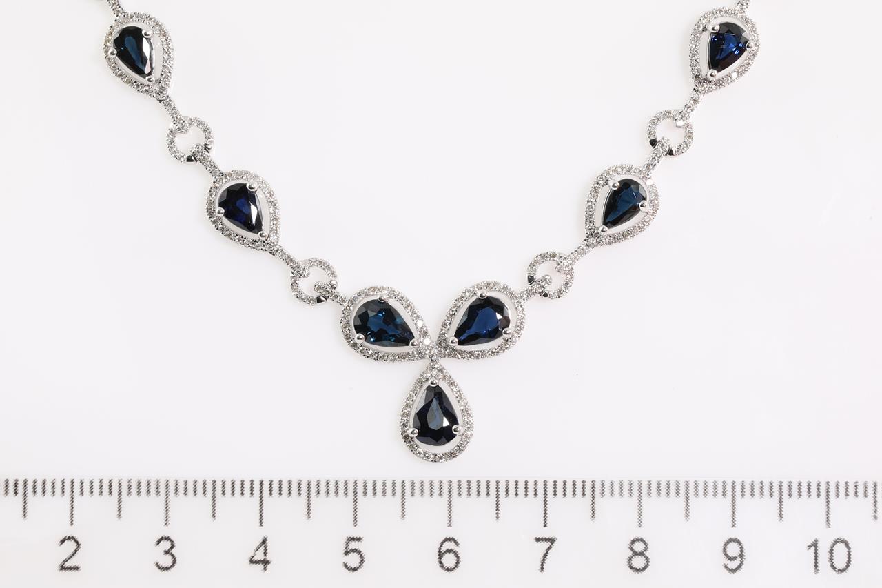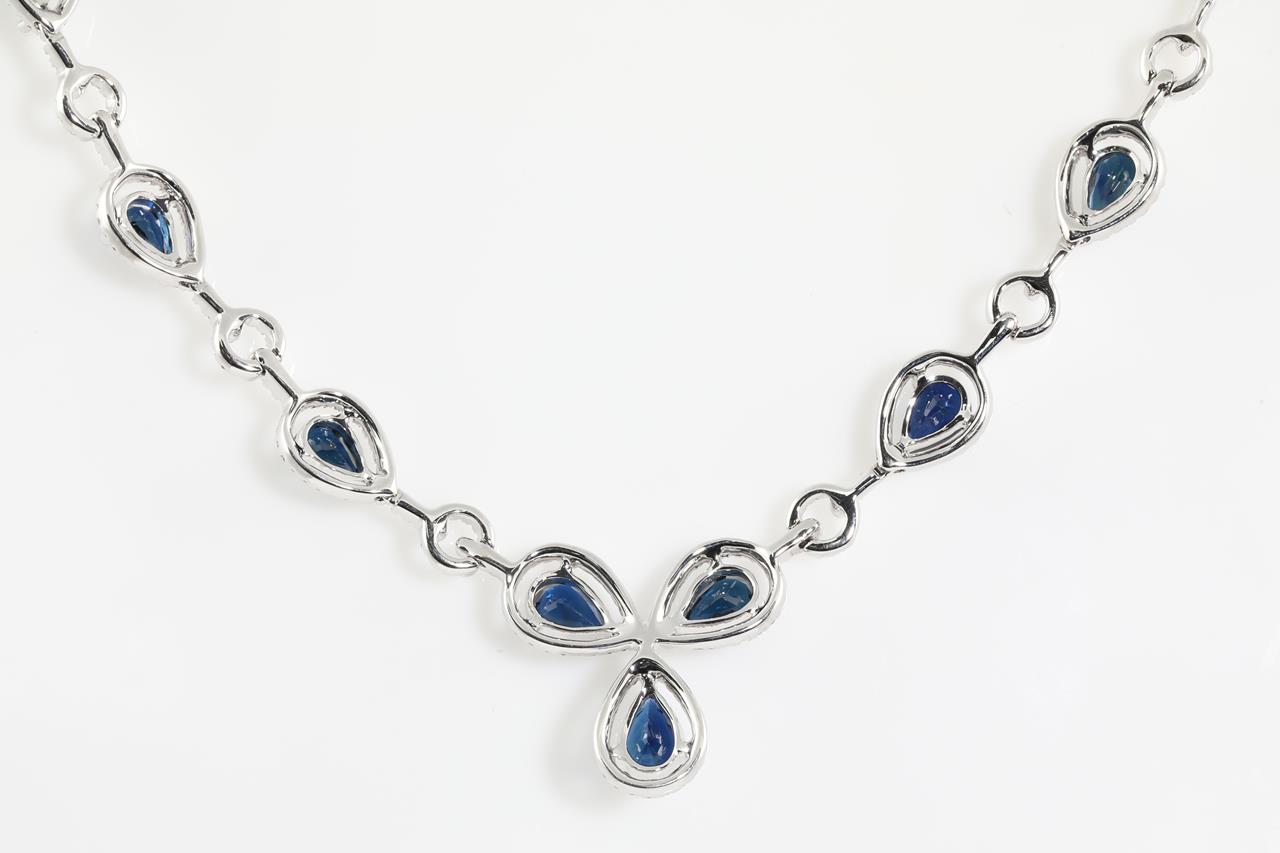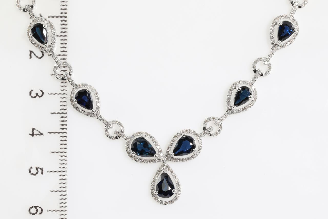 Sapphire and Diamond necklace with pear shape dark blue Sapphires totalling 5.50cts and Diamonds totalling 1.25cts (Estimated grading: I-J SI). 18ct white gold. Length: 41cm. Weight: 17g. With certificate #414676. (Pre-owned)