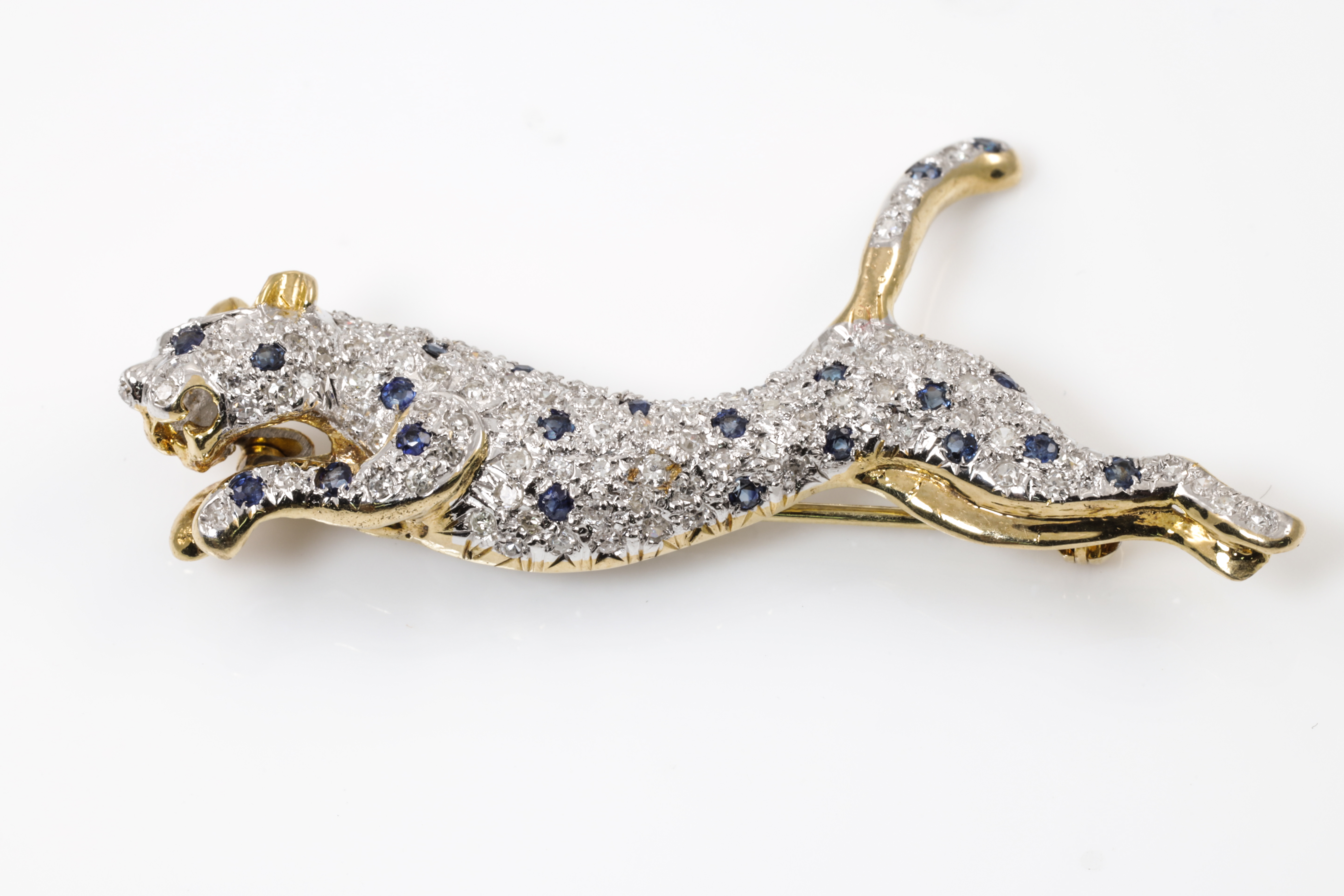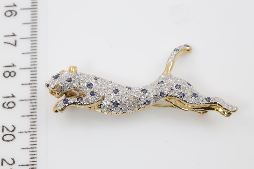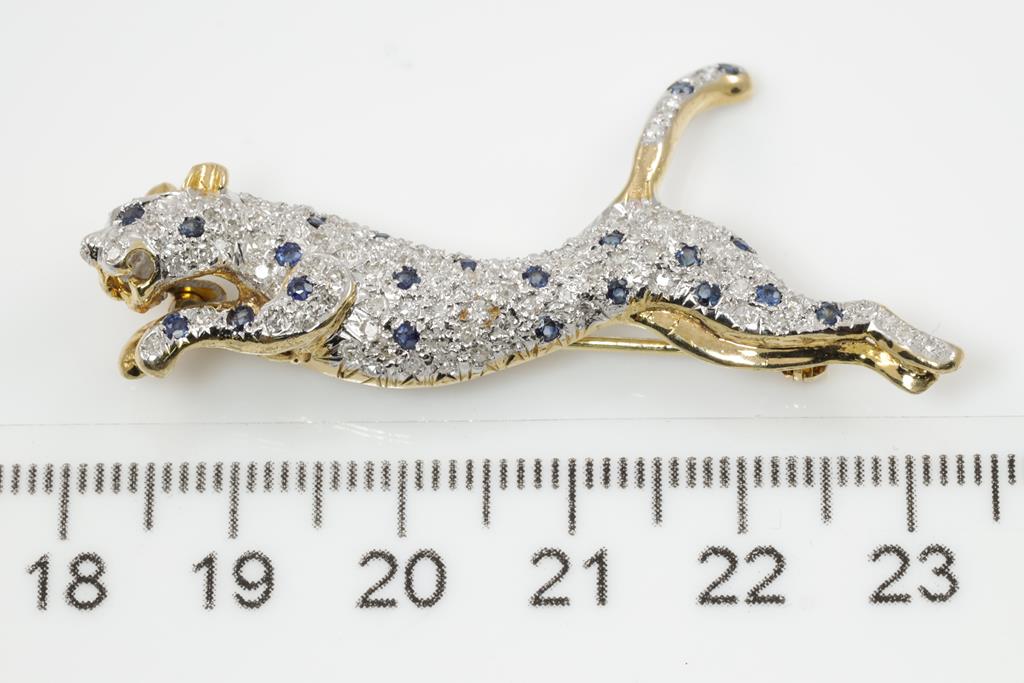 Panther design brooch with round cut blue Sapphires totalling approximately 0.37cts and round cut Diamonds totalling approximately 1.00cts (Estimated grading: G SI). 14ct yellow & white gold. Weight: 8.2g. (Pre-owned)