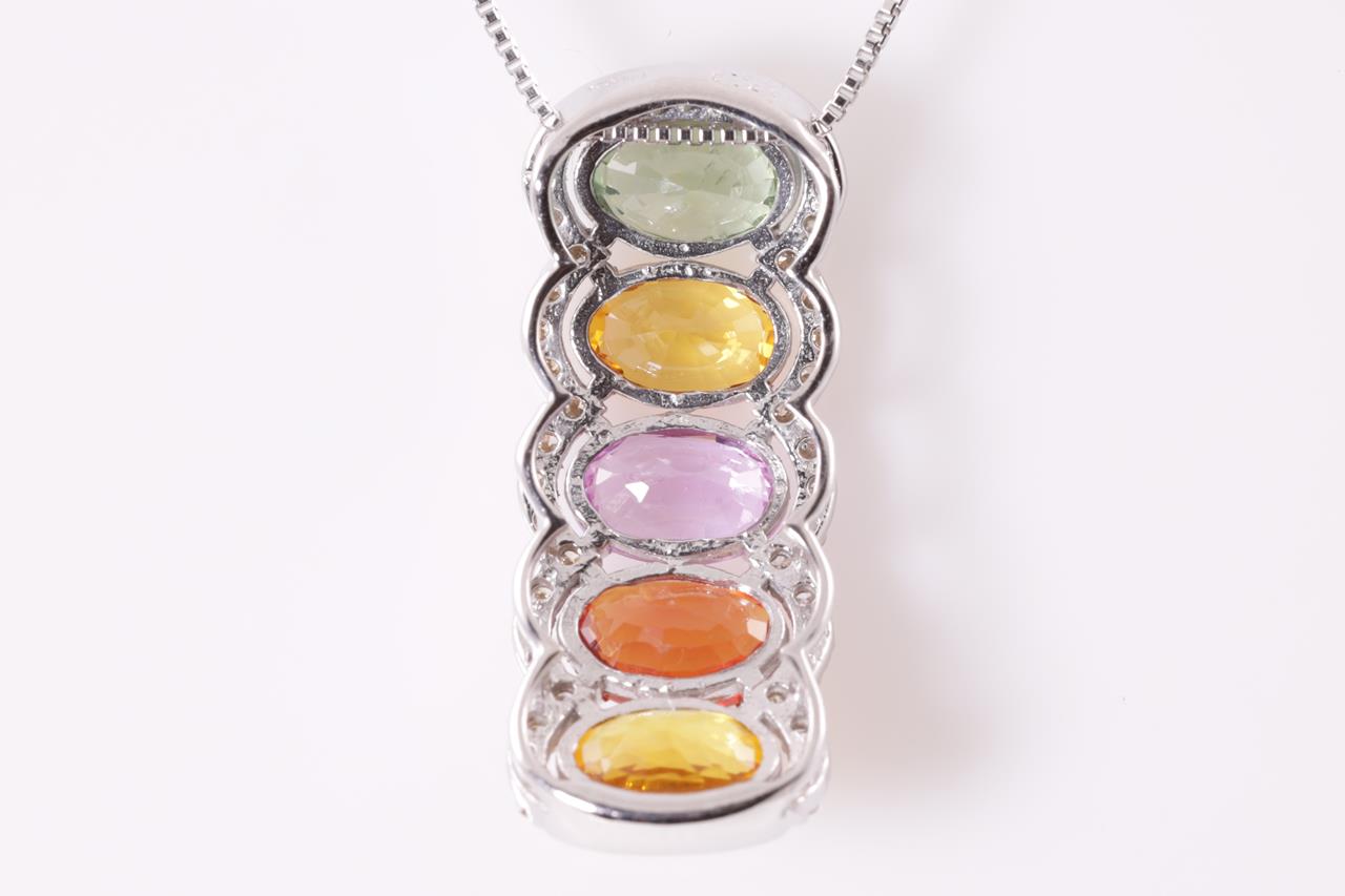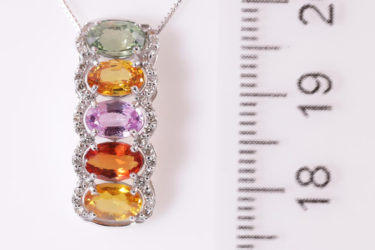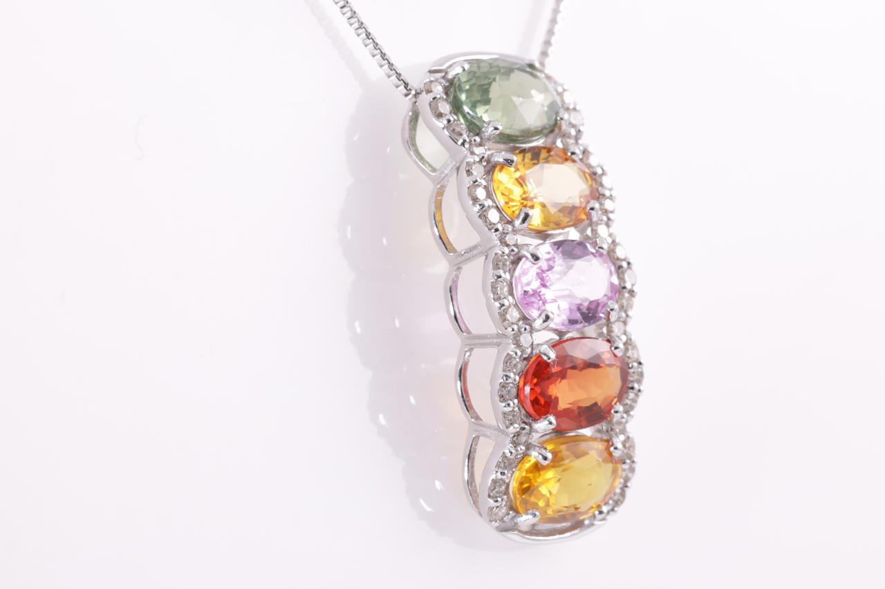 Sapphire and Diamod pendant with multi-colour oval shape Sapphires totalling 3.00cts and Diamonds totalling 0.20cts. 18ct white gold with 44cm adjustable chain. Weight: 3.4g. (pre-owned)