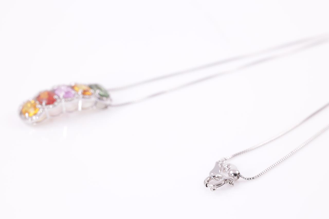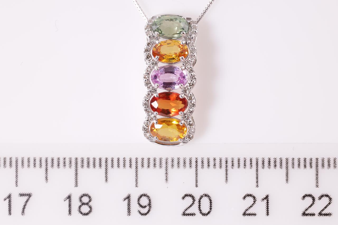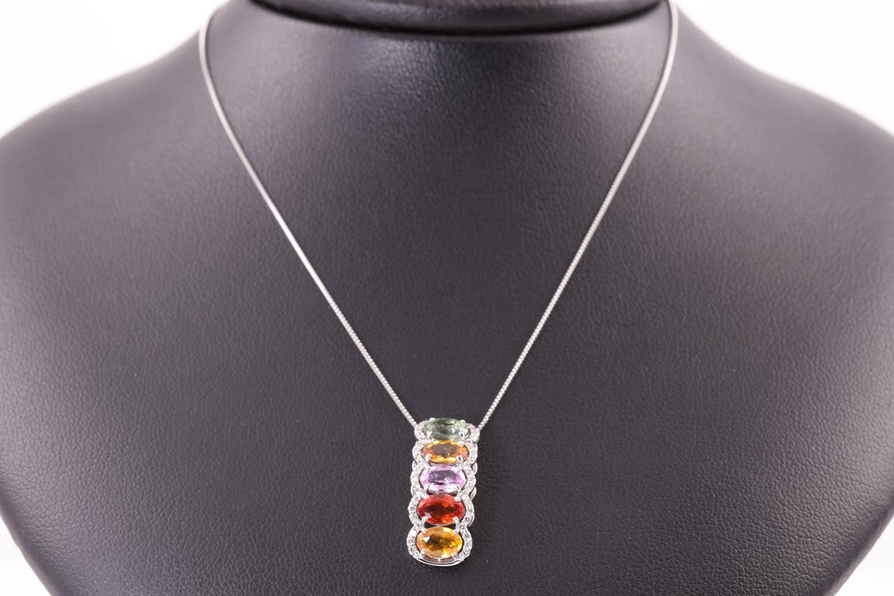 Sapphire and Diamod pendant with multi-colour oval shape Sapphires totalling 3.00cts and Diamonds totalling 0.20cts. 18ct white gold with 44cm adjustable chain. Weight: 3.4g. (pre-owned)