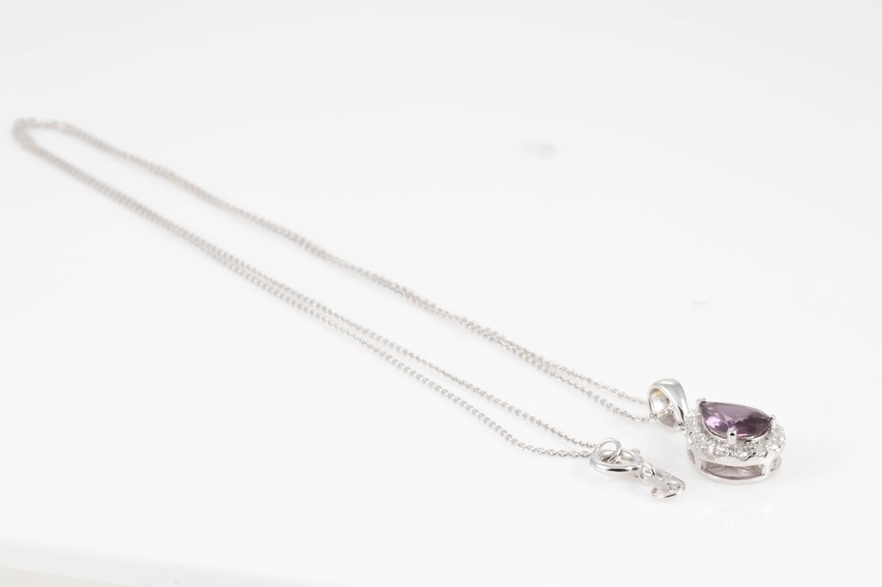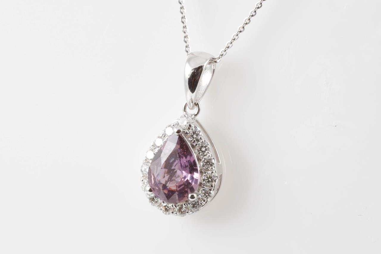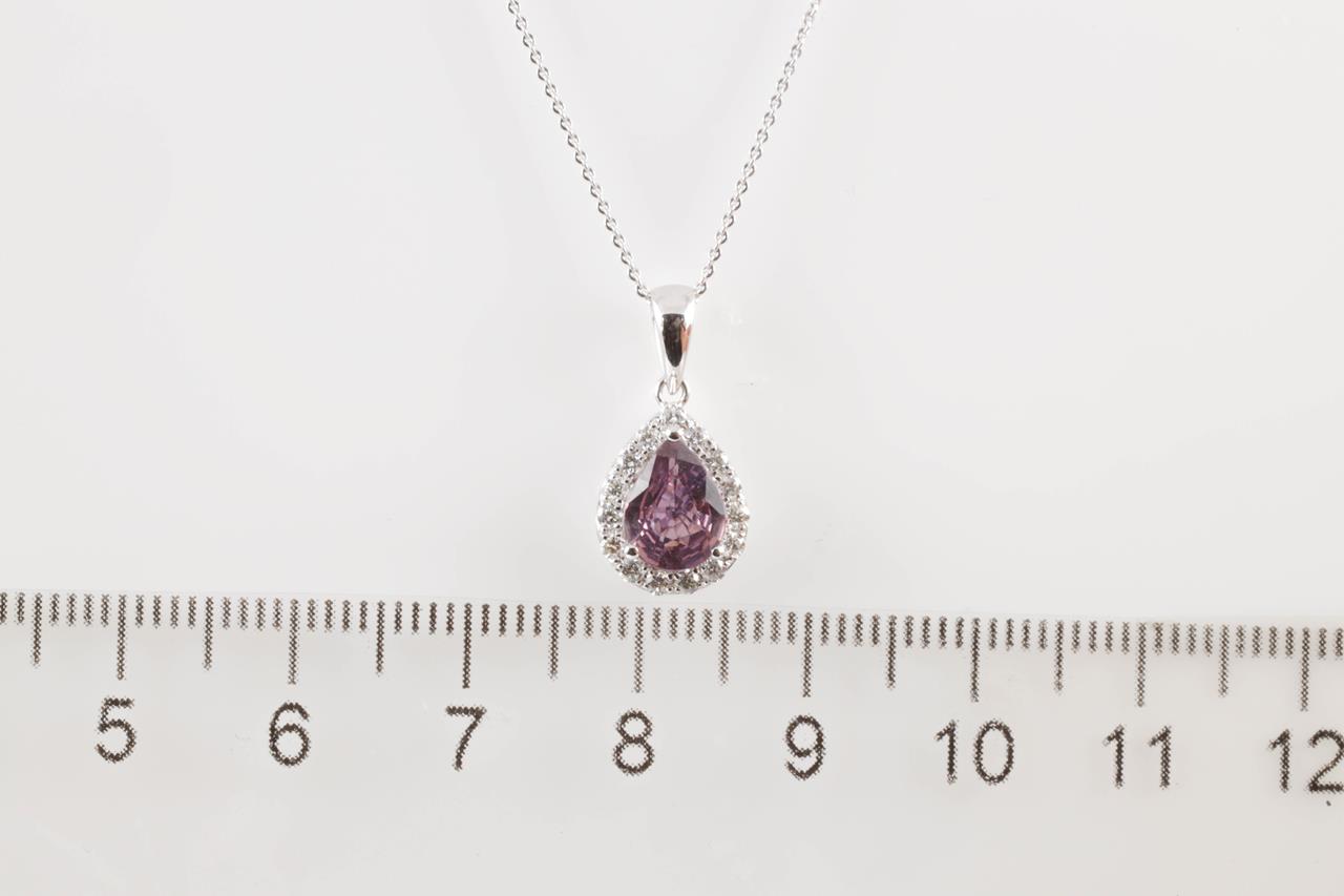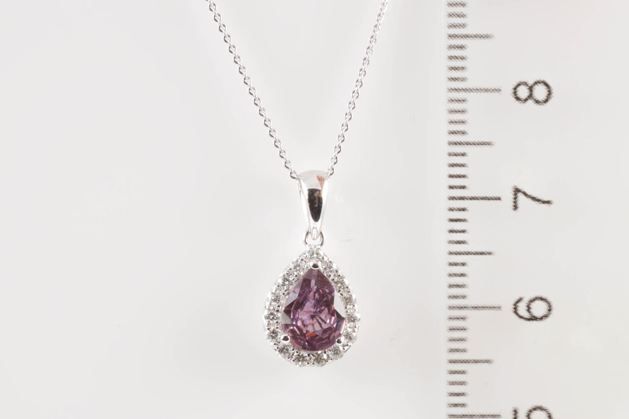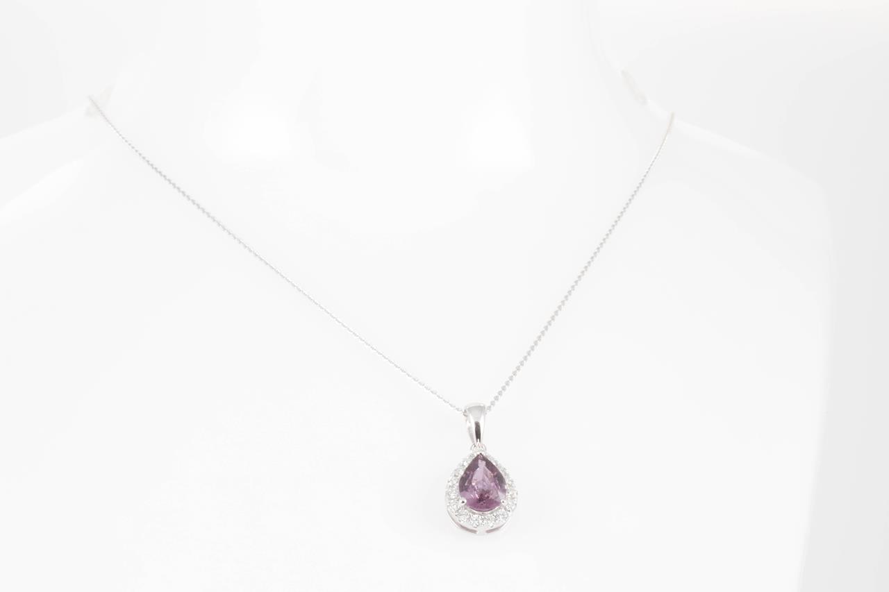 Sapphire and Diamond pendant with pear shape Sapphire of 0.98cts and round Diamonds totalling 0.21cts. 14ct white gold with 14ct gold, 45cm chain. Weight: 2.2g (New).