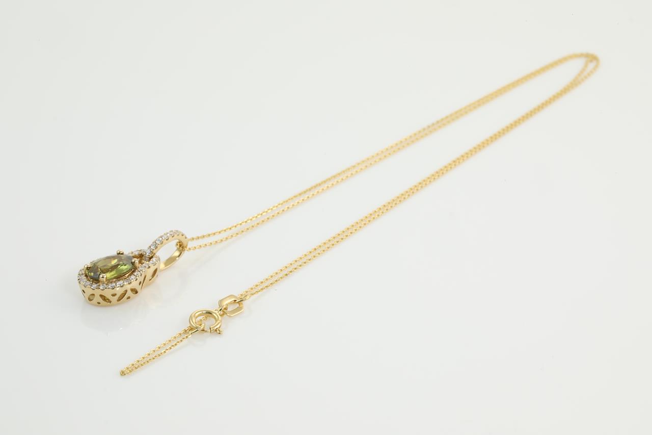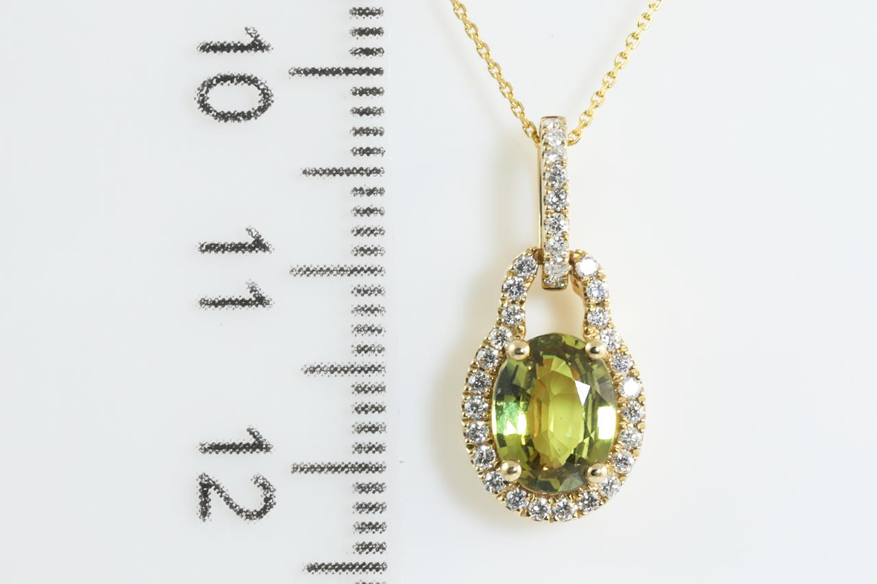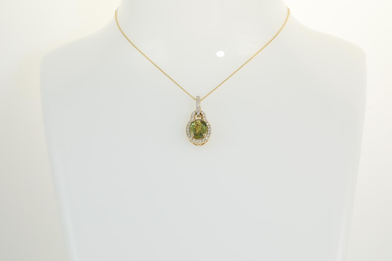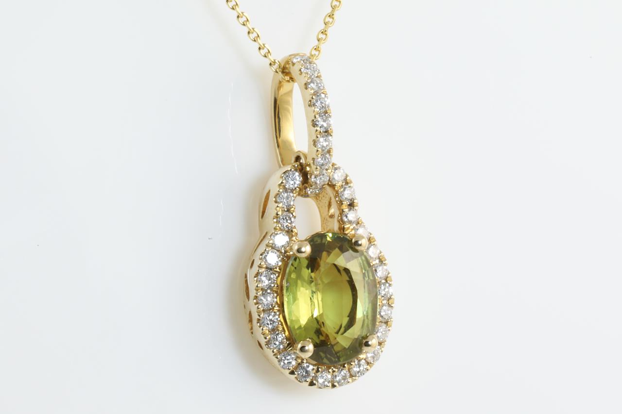 Sapphire and Diamond pendant with oval shape green Sapphire of 1.34cts and round Diamonds totalling 0.20cts. 14ct yellow gold with 14ct gold, 45cm chain. Weight: 2.6g (New).