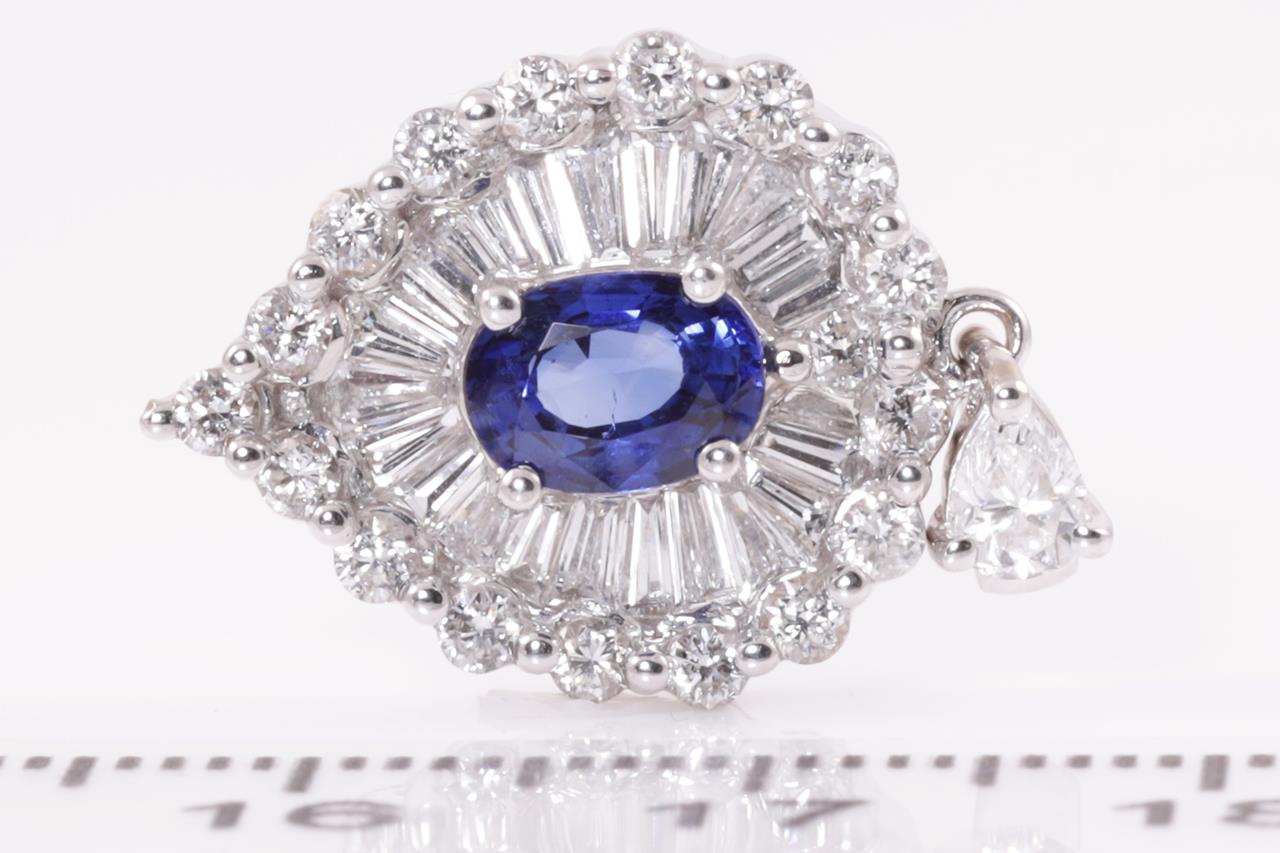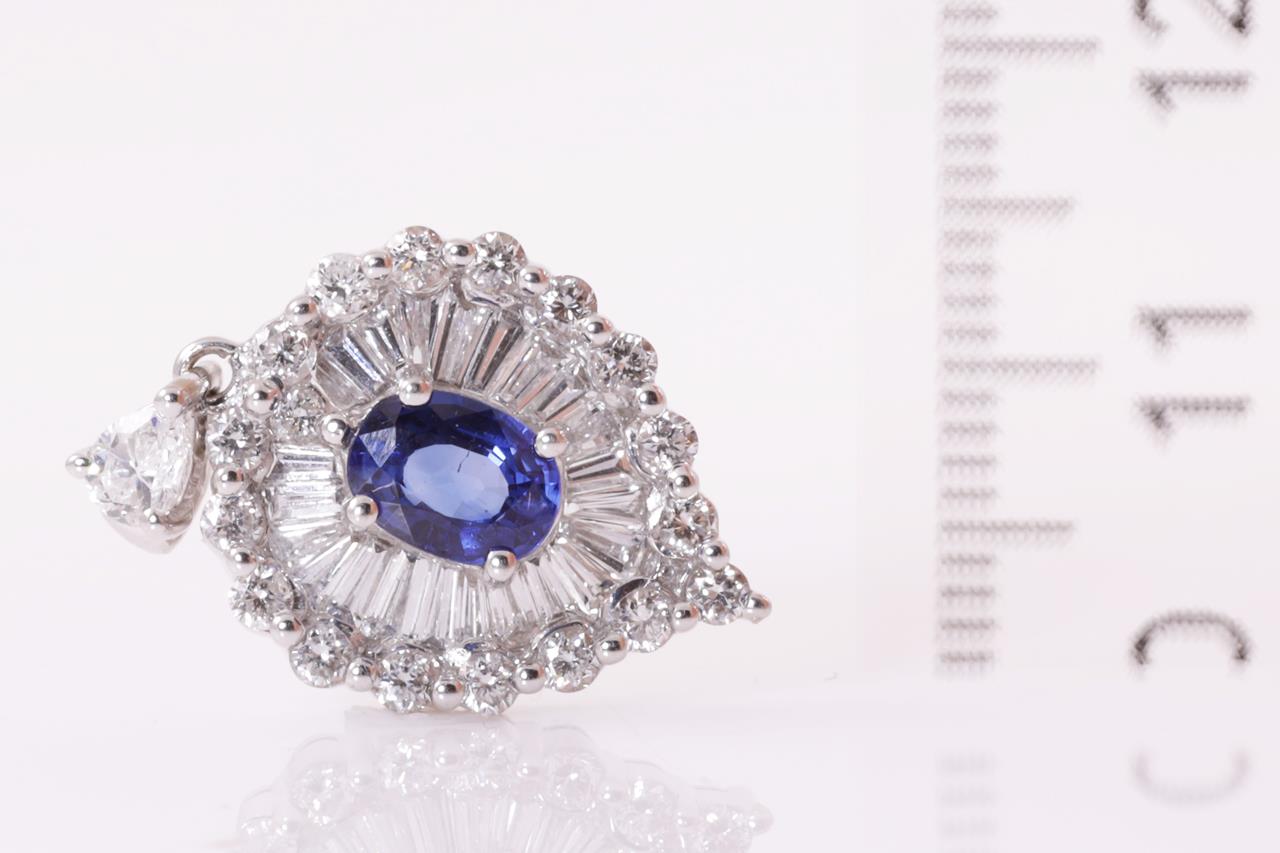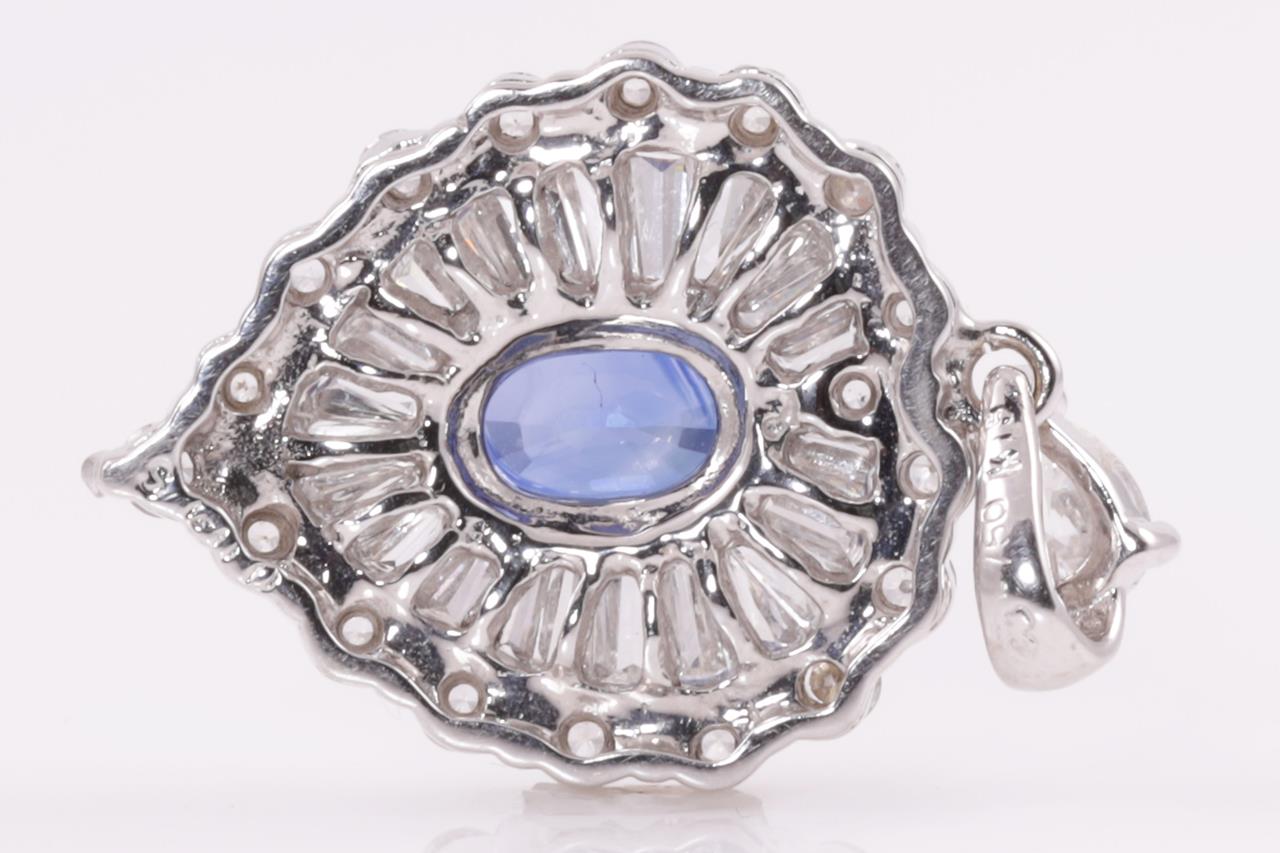 1807. Sapphire and Diamond Pendant with oval cut blue Sapphire of approximately 0.89ct and tapers or round Diamonds totalling approximately 1.60cts (Estimated grading: G VS-SI). 18ct white gold. Weight 4.2g. (Pre-owned)