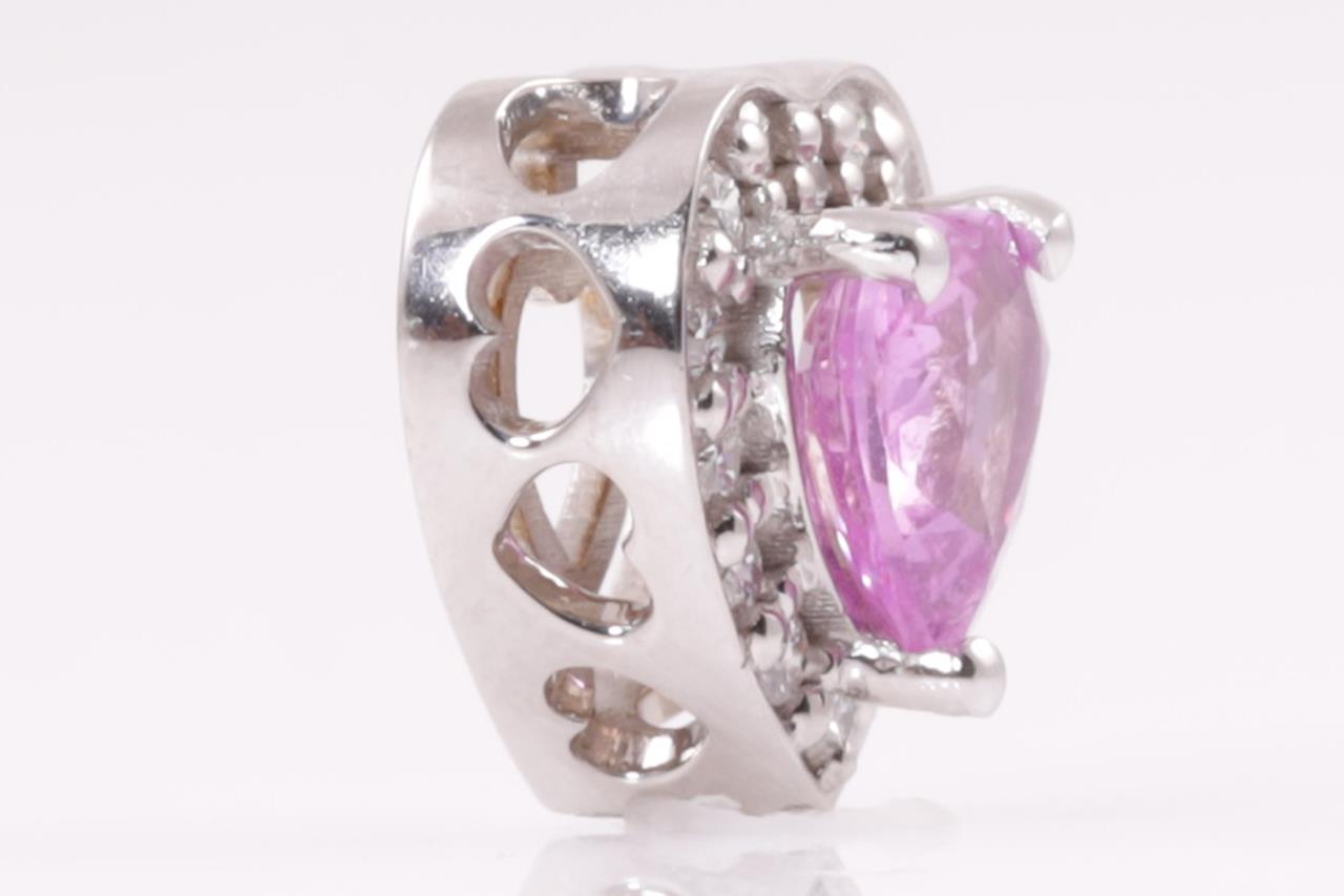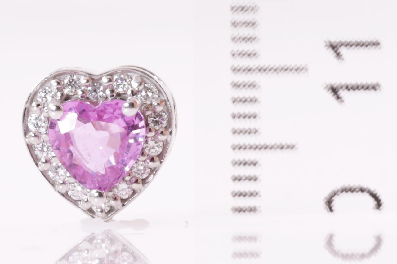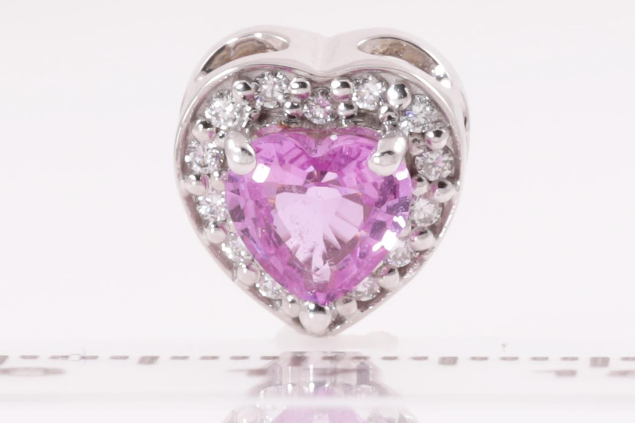 Sapphire and Diamond Pendant with centre pink heart shaped Sapphire of approximately 0.50ct and round Diamonds totalling approximately 0.28cts. 14ct white gold. Weight 1.7g. (Pre-owned)