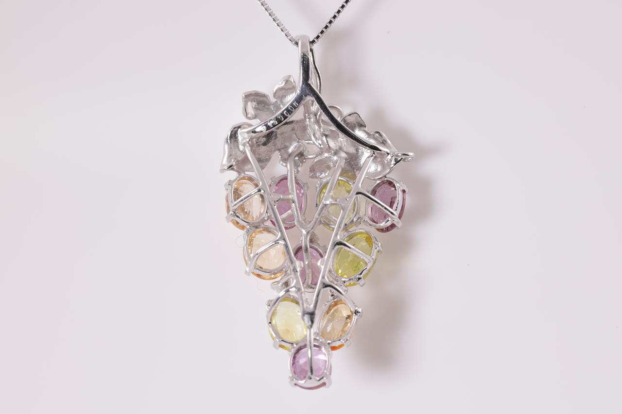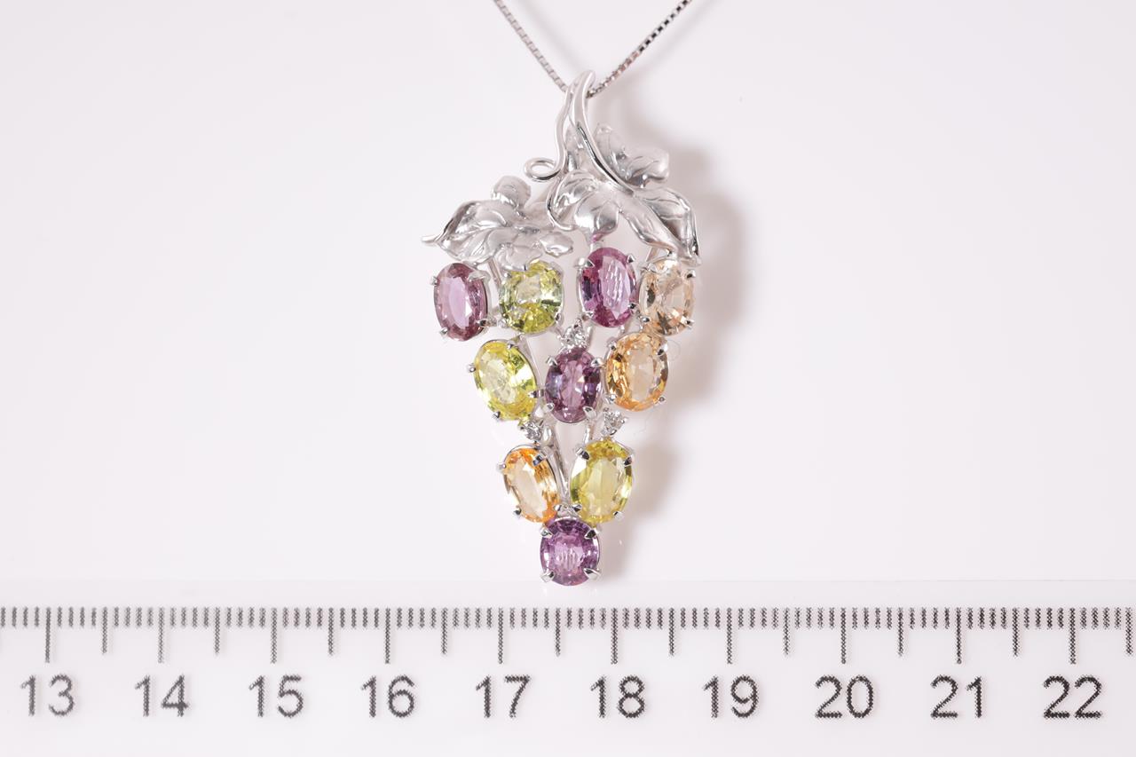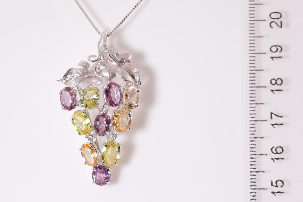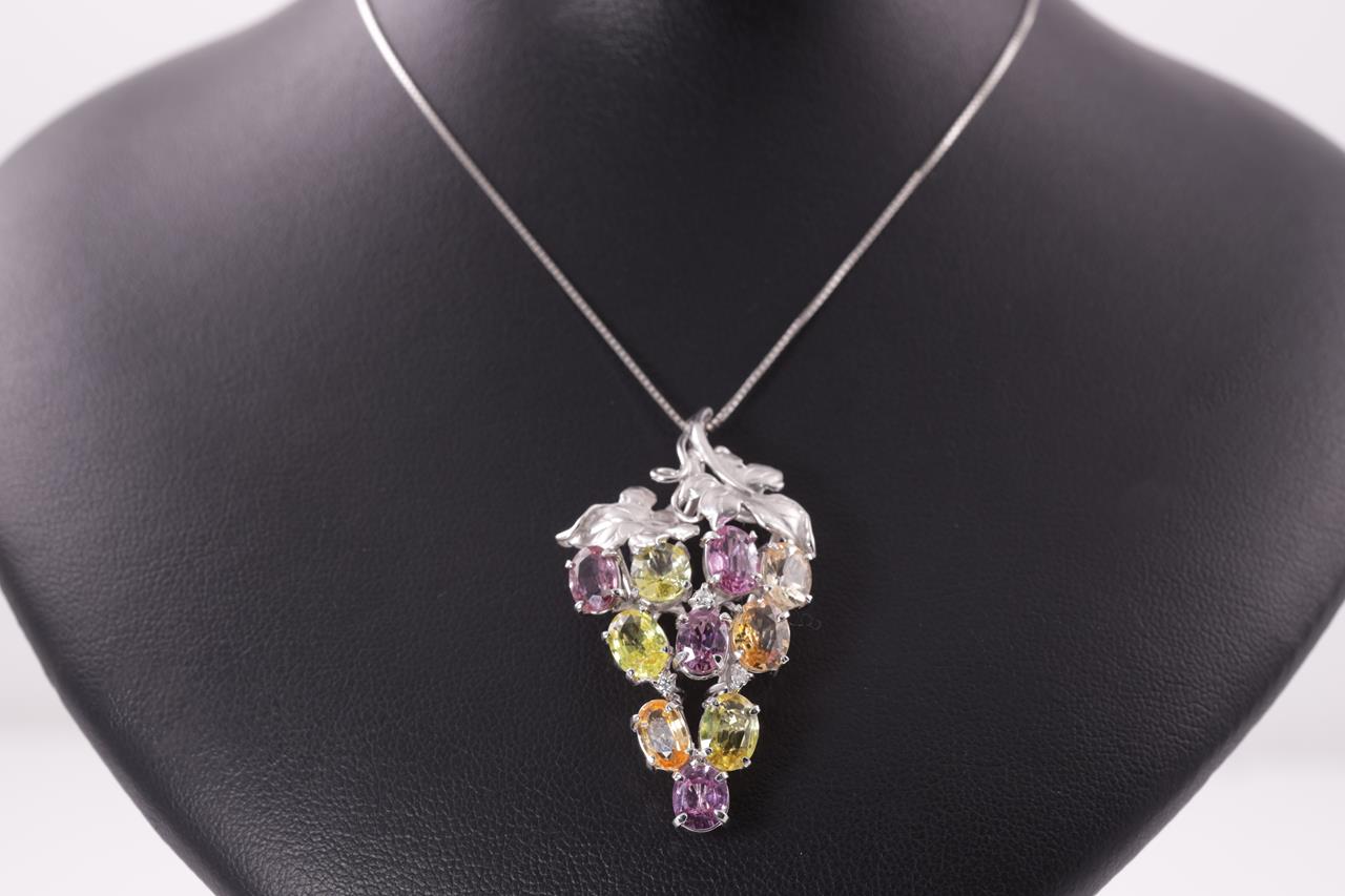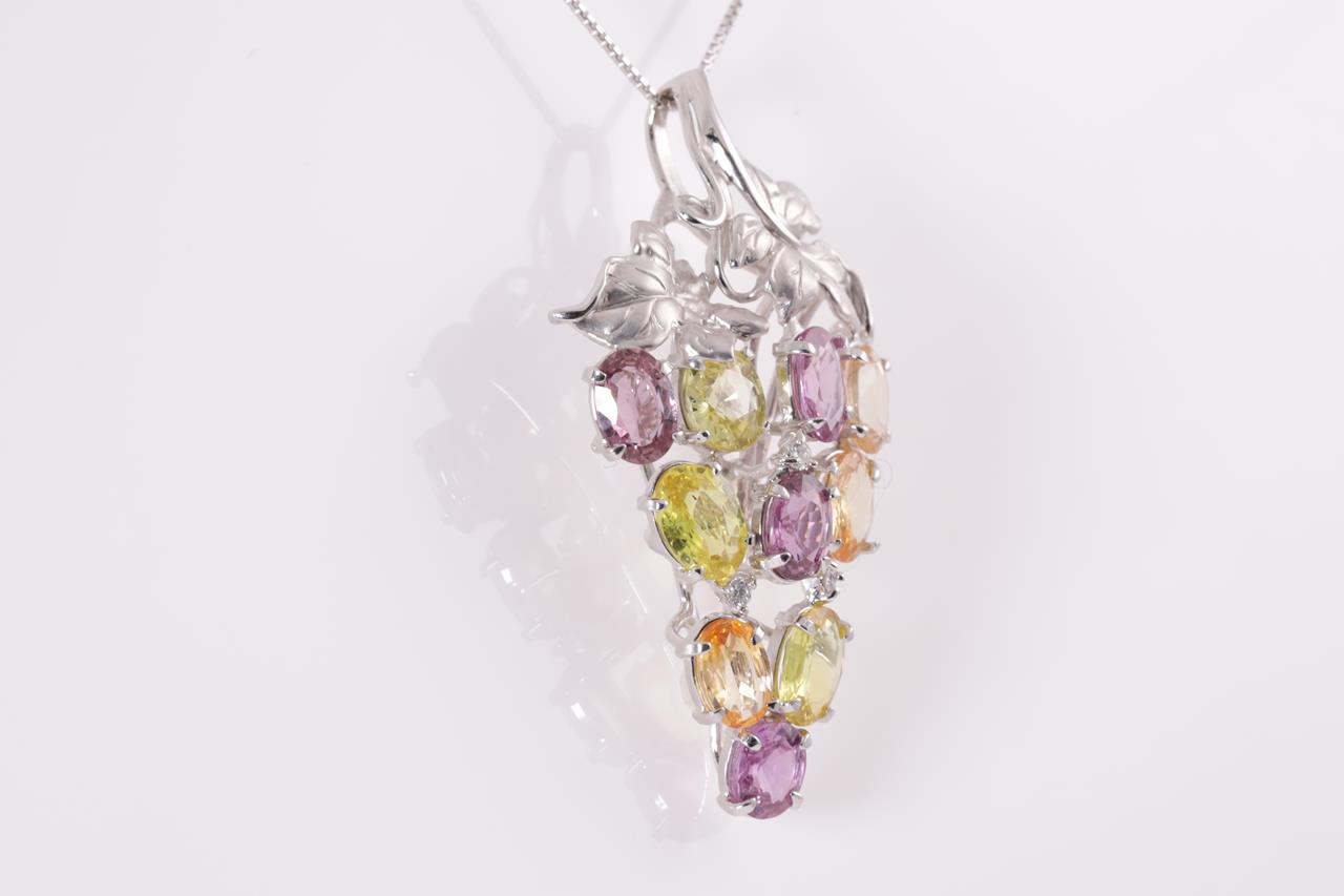 Sapphire and Diamond pendant with multi-colour Sapphires totalling 8.75cts and Diamonds totalling 0.05cts. 18ct white gold with 45cm adjustable chain. Weight: 10. (Pre-owned)