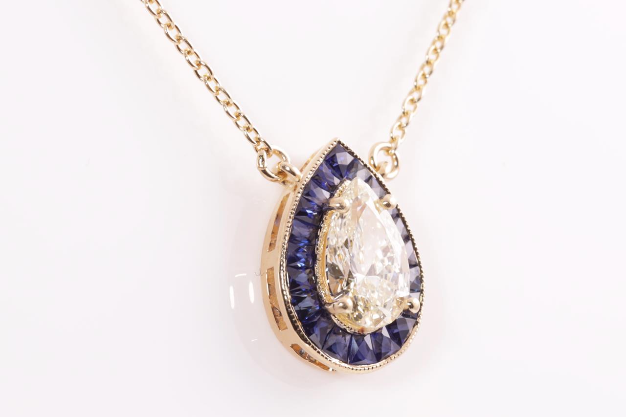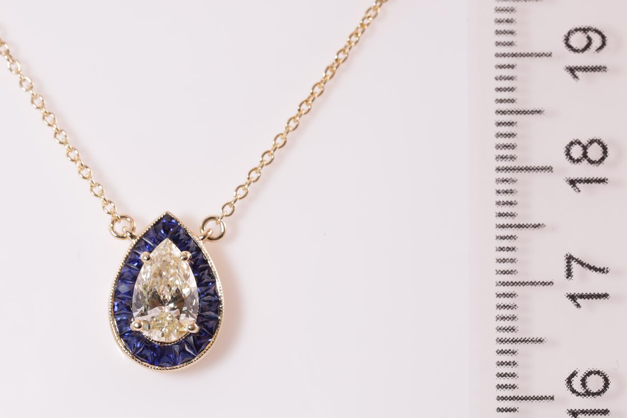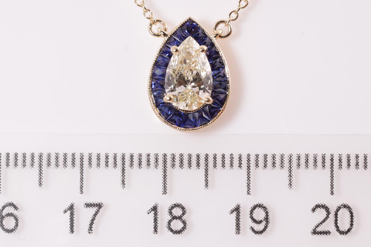 Sapphire Pendant with centre pear shape Diamond of approximately 1.07ct (With GSL Description report Graded as R-S SI2 # AA65536) and fancy shape blue Sapphires totalling approximately 0.95cts. 18ct yellow gold attached to an 18ct yellow gold chain. Weight 3.5g. (Pre-owned)