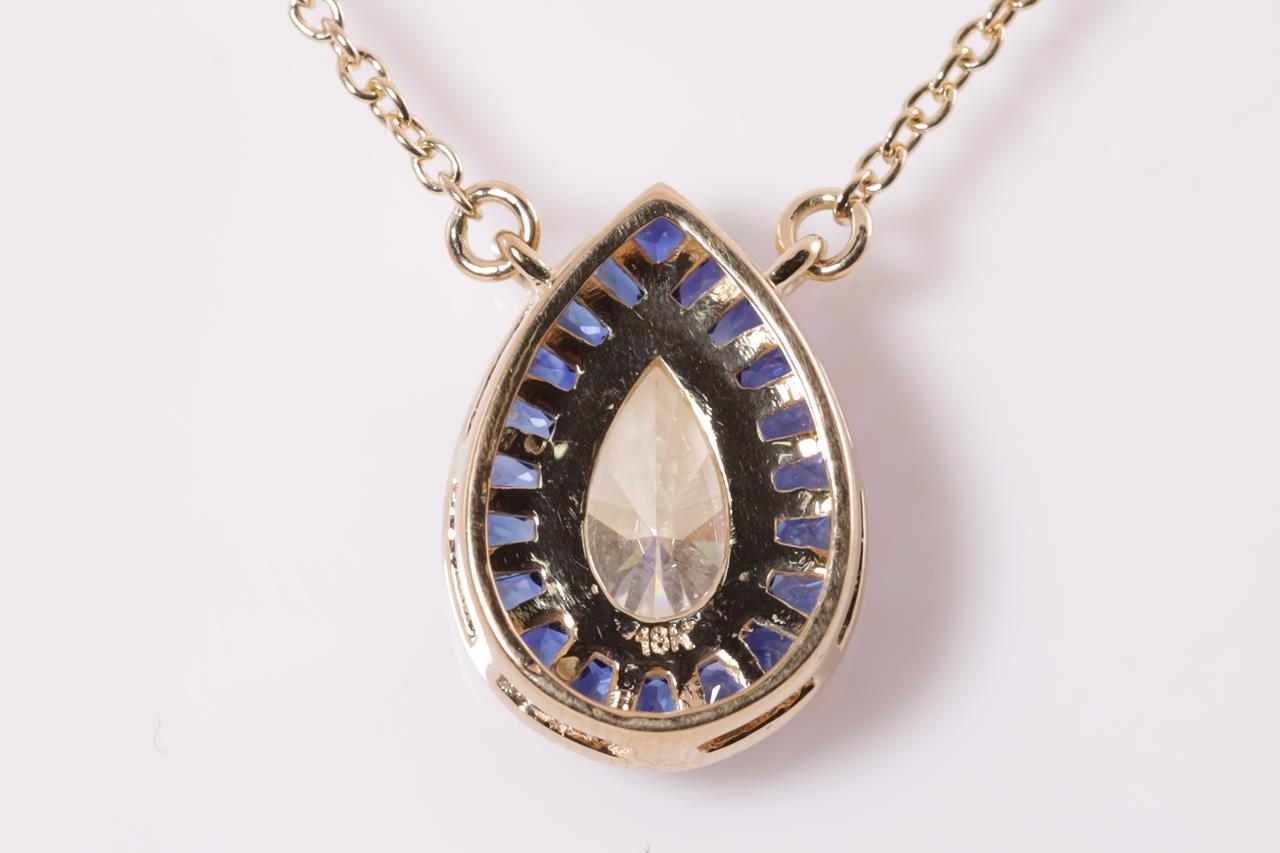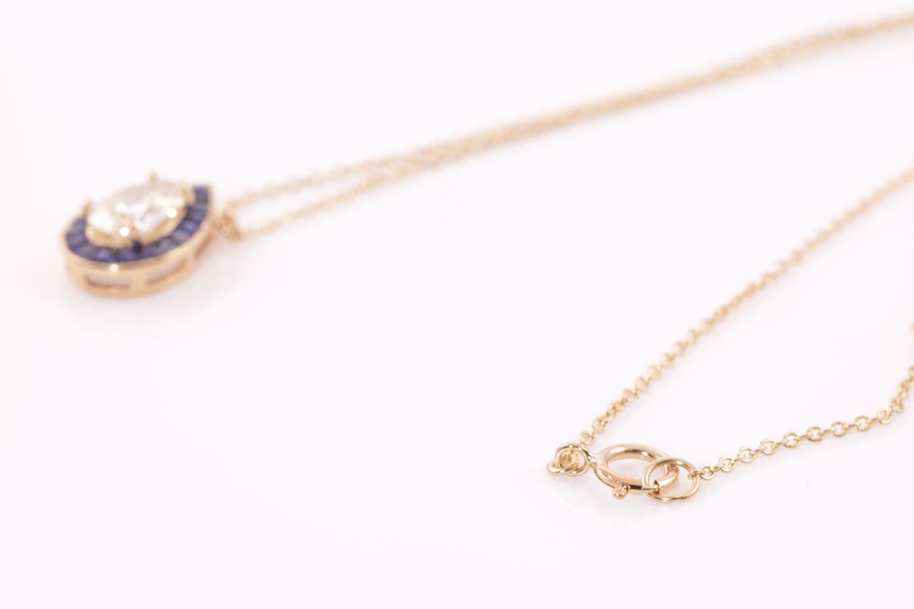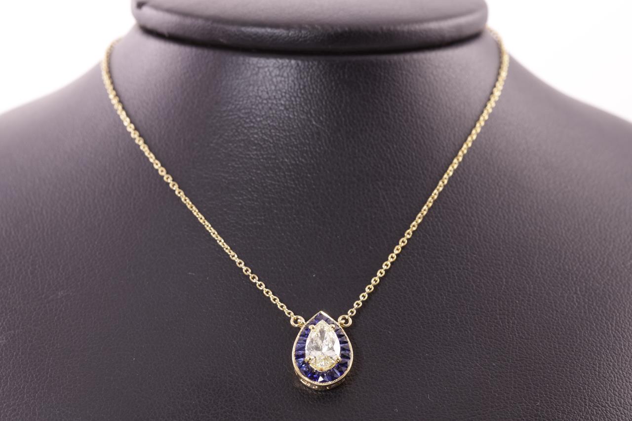 Sapphire Pendant with centre pear shape Diamond of approximately 1.07ct (With GSL Description report Graded as R-S SI2 # AA65536) and fancy shape blue Sapphires totalling approximately 0.95cts. 18ct yellow gold attached to an 18ct yellow gold chain. Weight 3.5g. (Pre-owned)