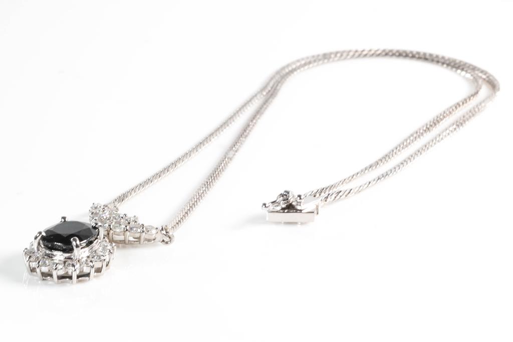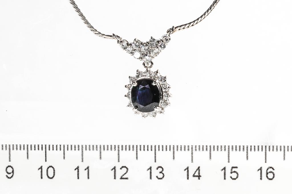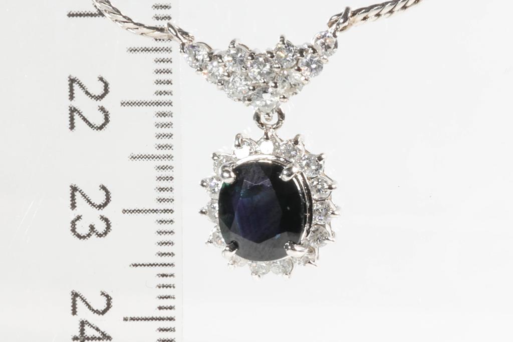 Sapphire and Diamond pendant with centre oval shape blue Sapphire of 3.47cts and surrounding round Diamonds totalling 1.11cts (Estimated grading: G-H P1-3). Platinum with 40cm chain. Weight: 13.2g. (Pre-owned)