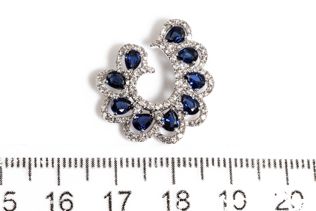 Sapphire and Diamond Pendant with pear cut deep blue Sapphires totalling approximately 0.90cts and Diamonds totalling approximately 0.61cts (Estimated grading H-I P1). 18ct white gold. Weigth 3.9g. No chain provided. (Pre-owned)