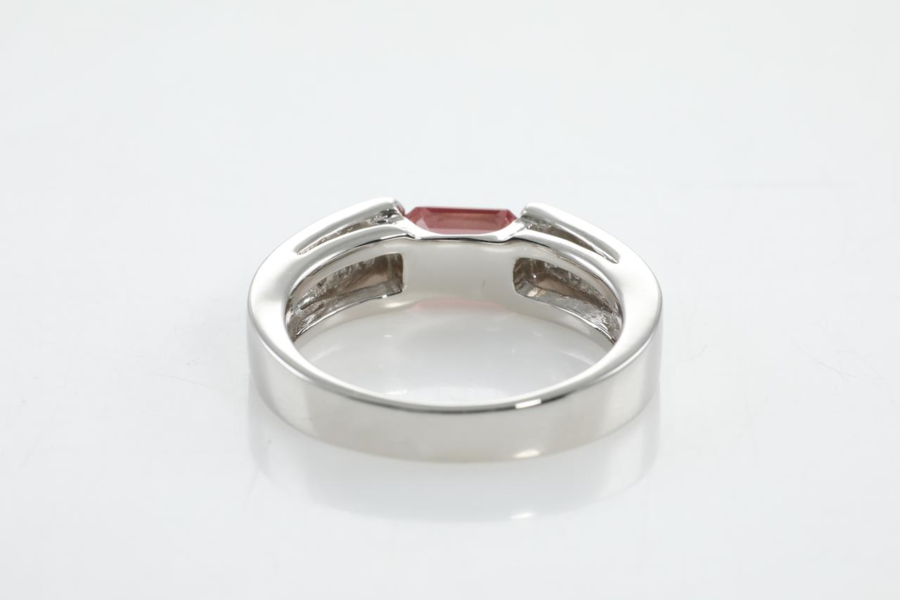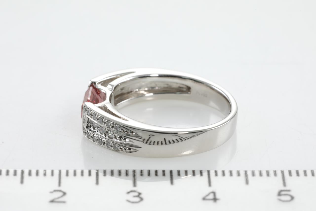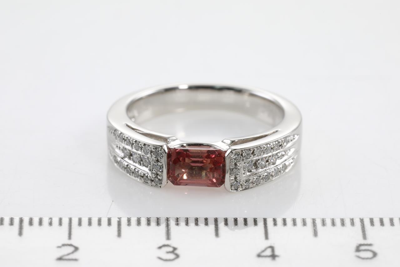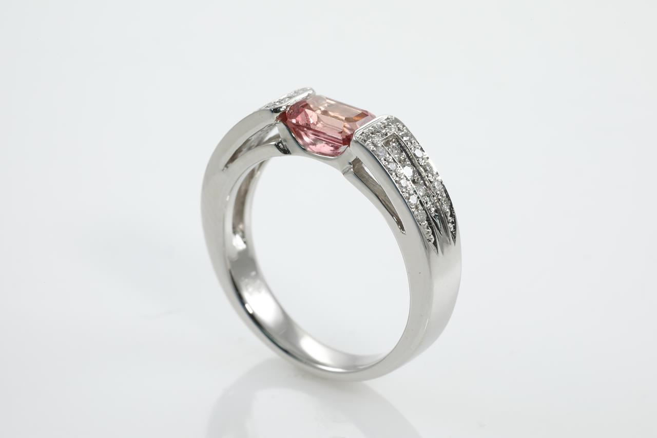 Sapphire and Diamond ring with an emerald cut Padparadscha Sapphire of 0.90cts and round Diamonds totalling 0.21cts. Platinum, ring size M. Weight: 8.2g (Pre-owned)