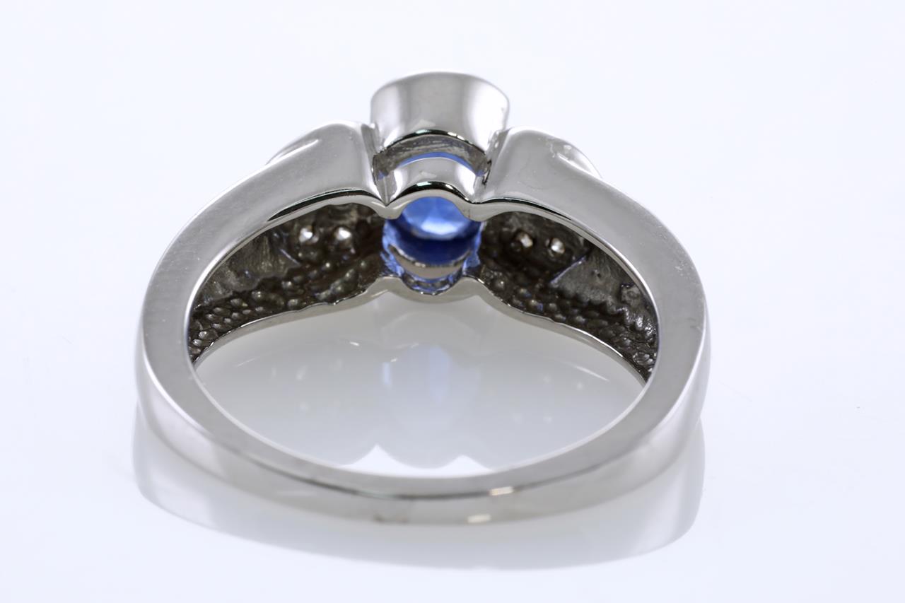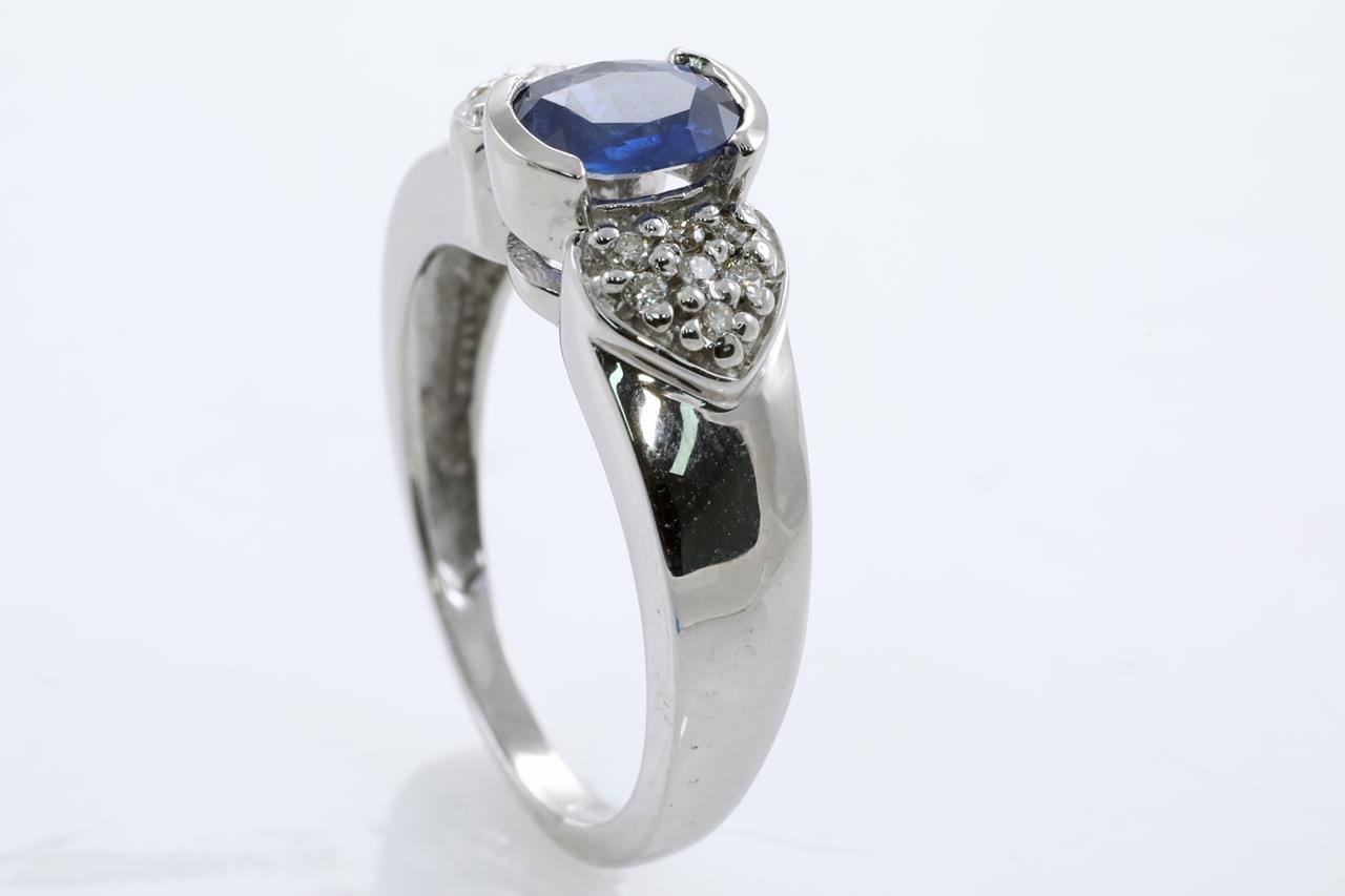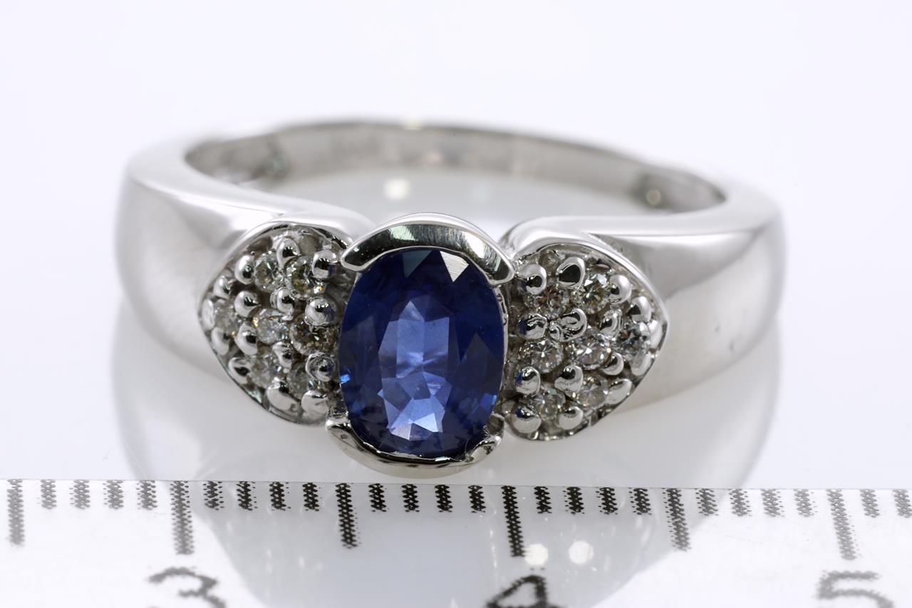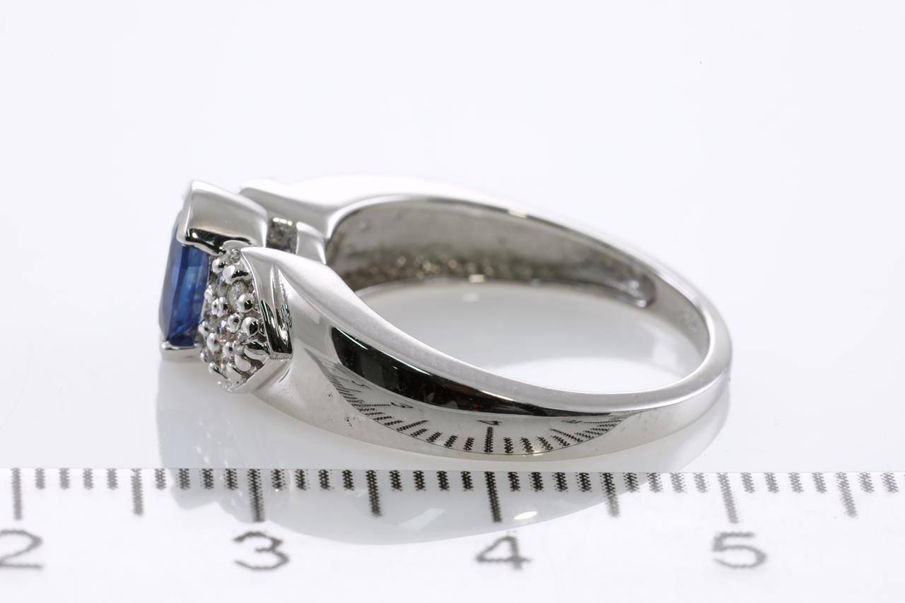 Sapphire and Diamond ring with an oval blue Sapphire of 0.90ct and Diamonds totalling 0.10cts. 14ct white gold. Ring size N. Weight: 4.3g (New)