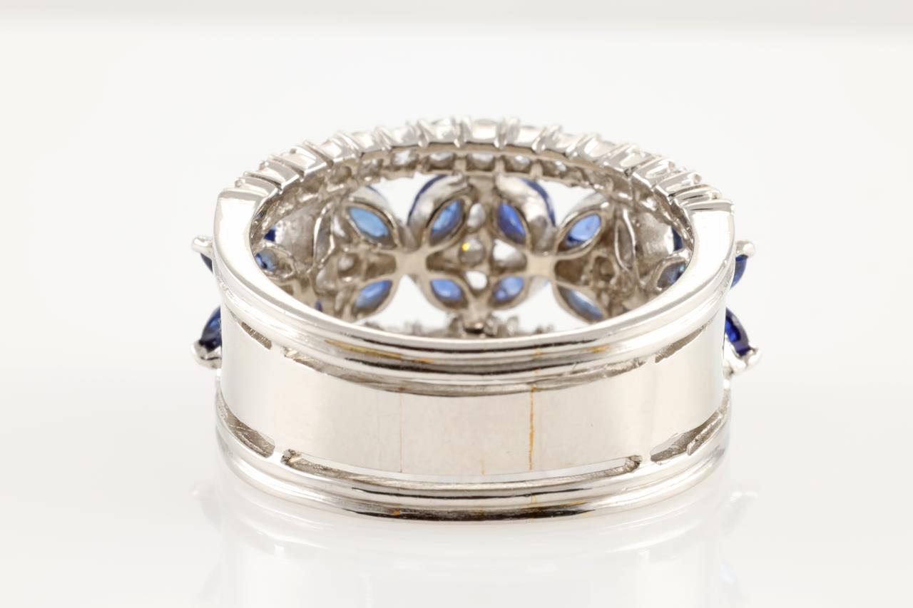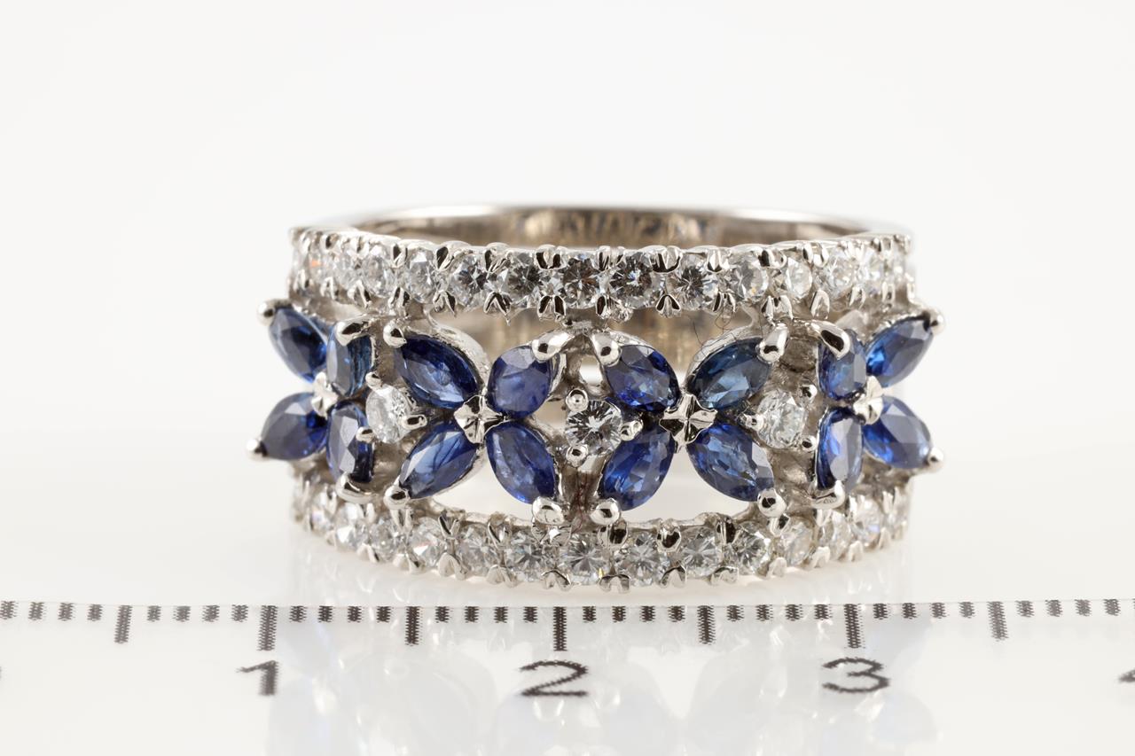 Sapphire and Diamond ring with marquise cut Sapphires totalling approximately 1.00ct and Diamonds totalling approximately 0.90cts. Note visible resizing lines. Platinum. Ring size: N1/2. Ring resizing up is not recommended, can only be resized down with ring clip. Weight: 12.9g (Pre-owned)