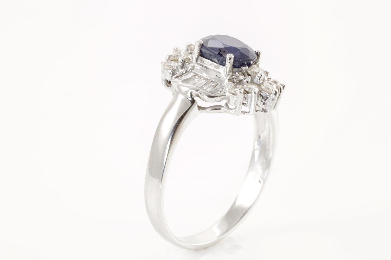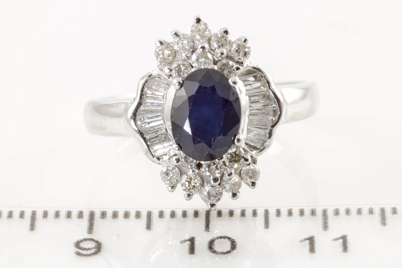 Sapphire and Diamond ring with oval cut blue Sapphire of approximately 1.50ct and round and baguette cut Diamonds totalling 0.55cts (Estimated grading: G-H P1). 18ct white gold. Ring size Q. Weight 4.6g. (Pre-owned)