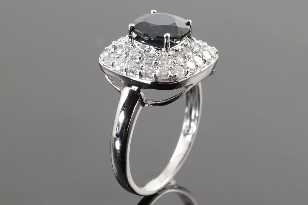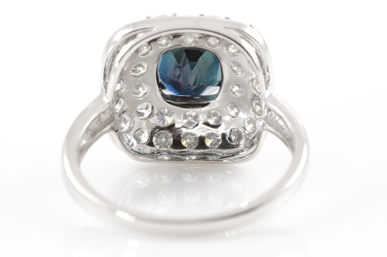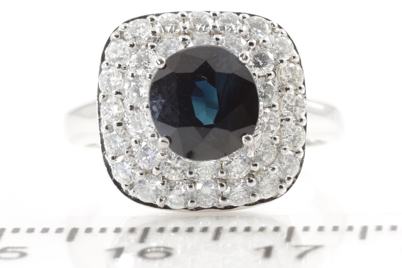 Sapphire and Diamond Ring with deep blue sapphire of approximately 2.15ct and round Diamonds totalling approximately 1.12cts (Estimated grading: G SI). 14ct white gold. Ring size N. Weight 3.5g. (Pre-owned)