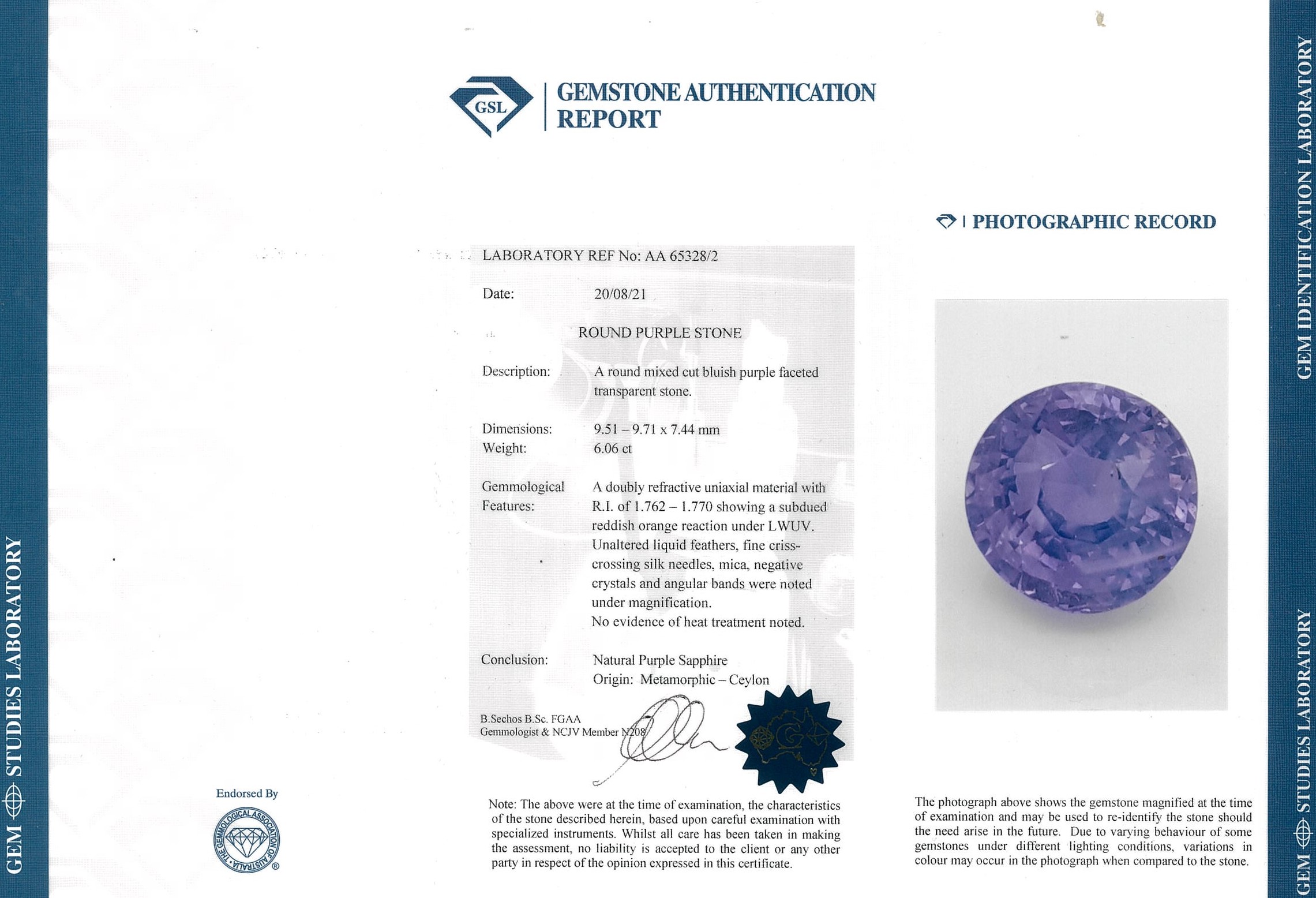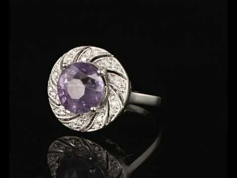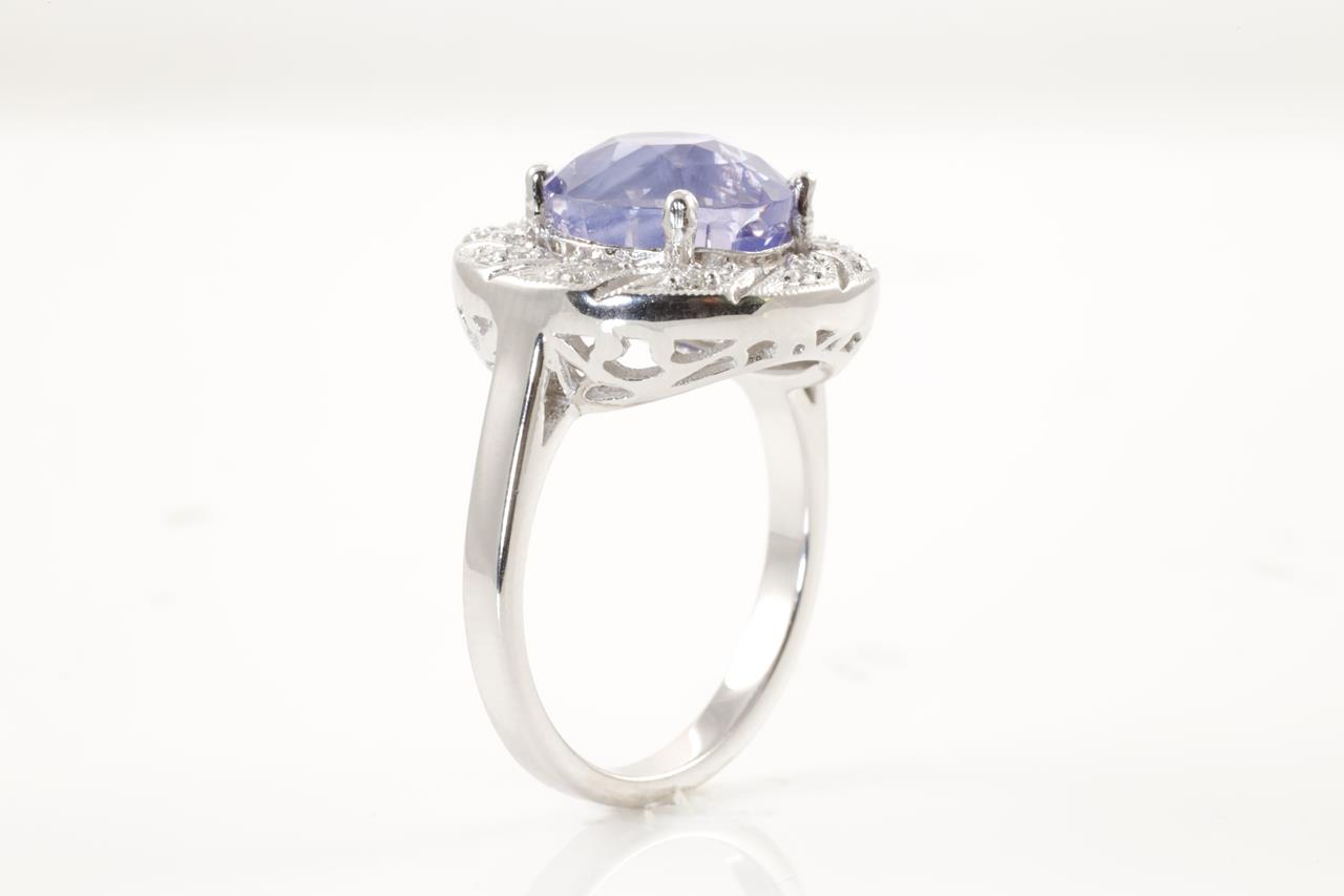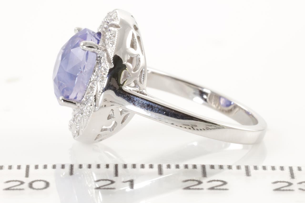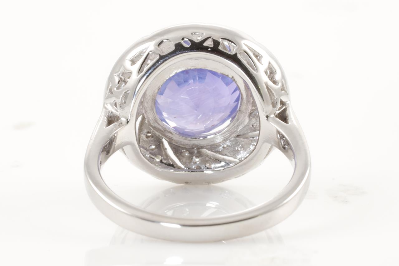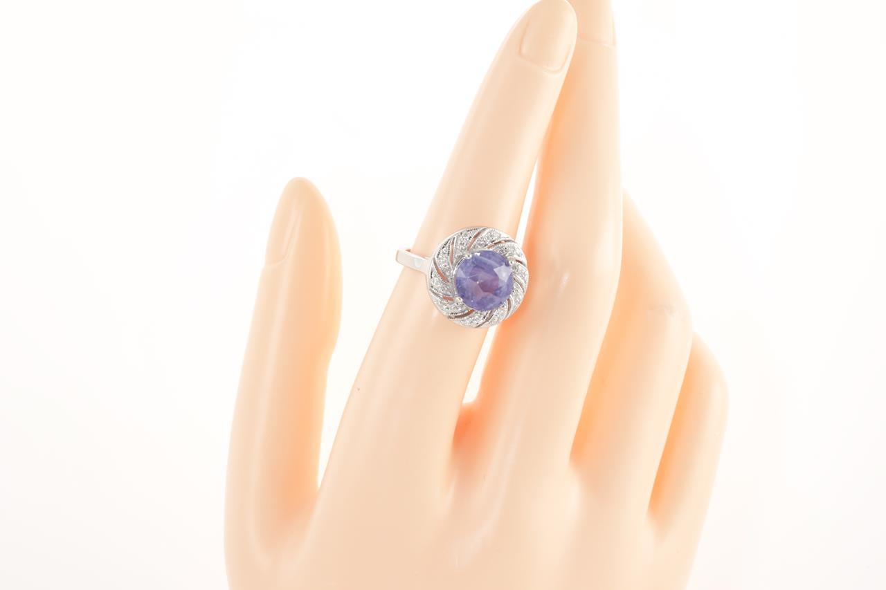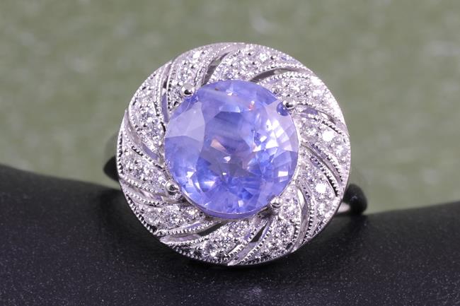 Sapphire and Diamond Ring with round cut bluish-purple Sapphire of 6.06ct (with GSL report AA65328/2) and 30 round cut Diamonds totalling approximately 0.32cts. (Estimated grading: H SI). 18ct white gold. Ring size M1/2. Weight 6.4g. (As New)