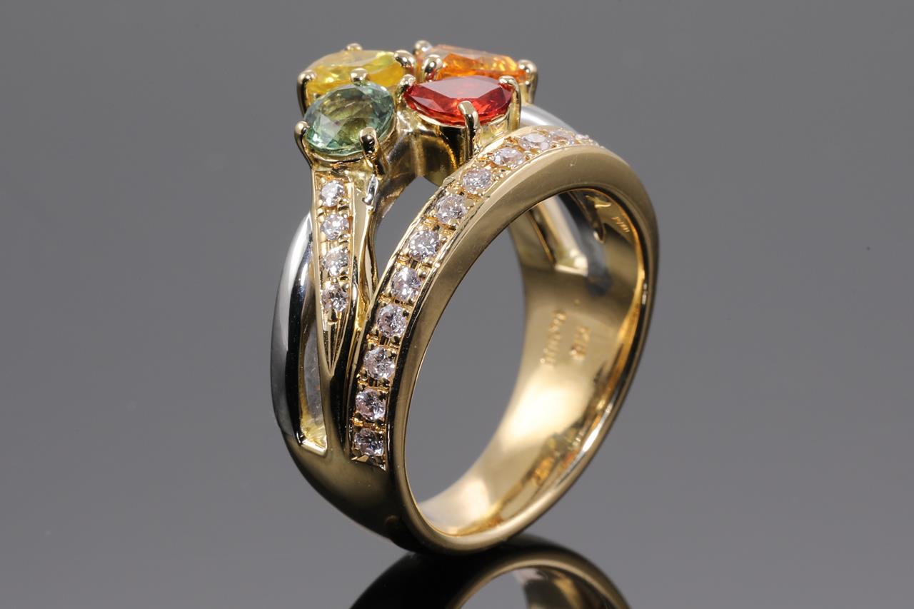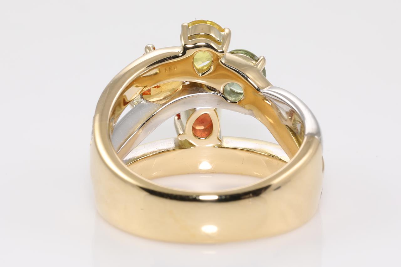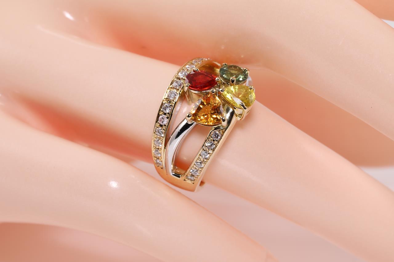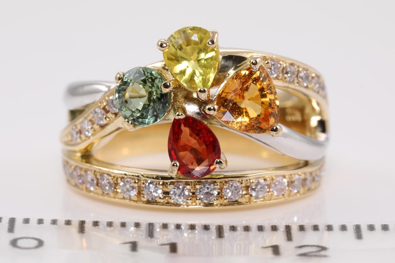 Sapphire and Diamond Ring with mixed shape multi colour Sapphires totalling approximately 1.20cts and Diamonds totalling 0.33cts (Estimated grading: H-I P1-2). 18ct yellow gold and paltinum. Ring size L. Weight: 11.4g (Pre-owned)