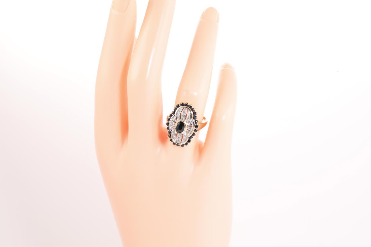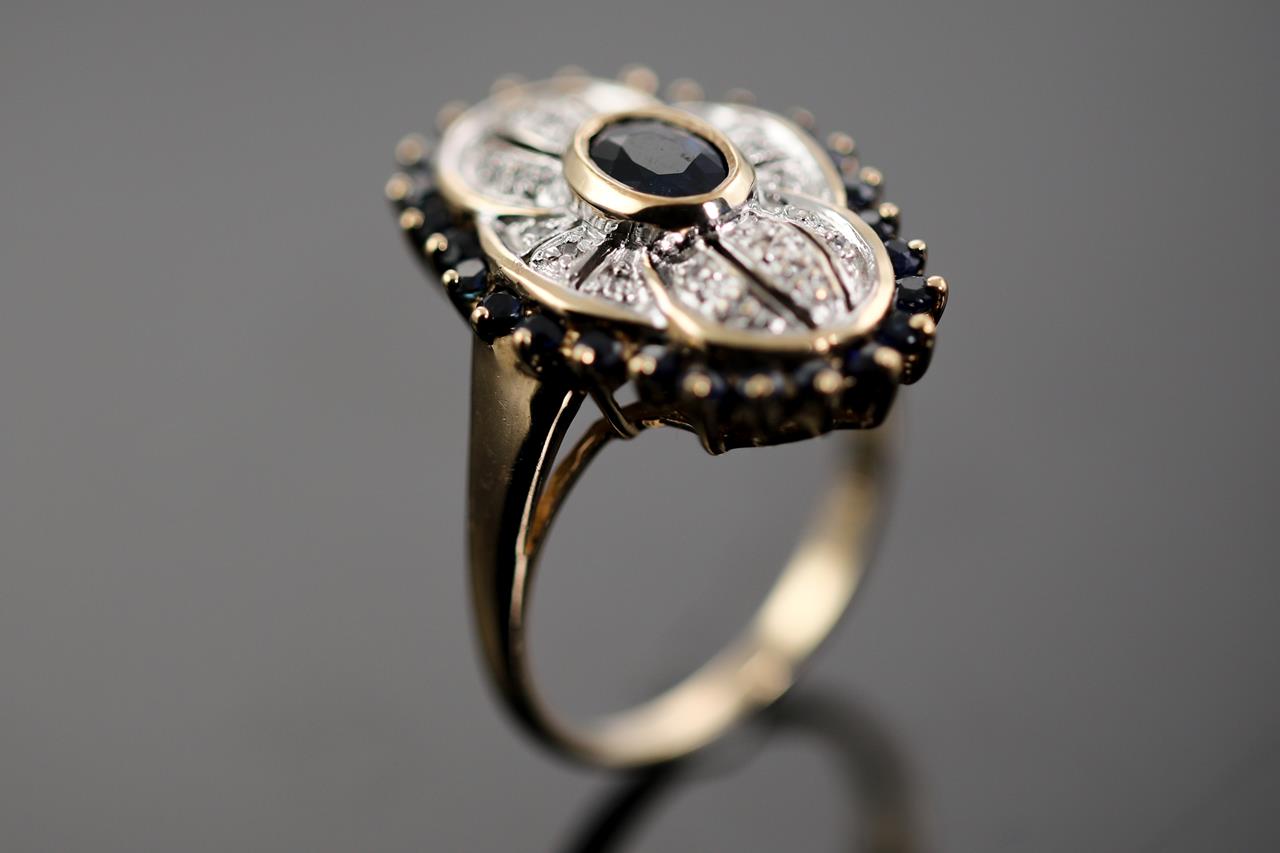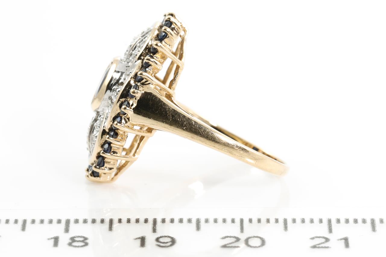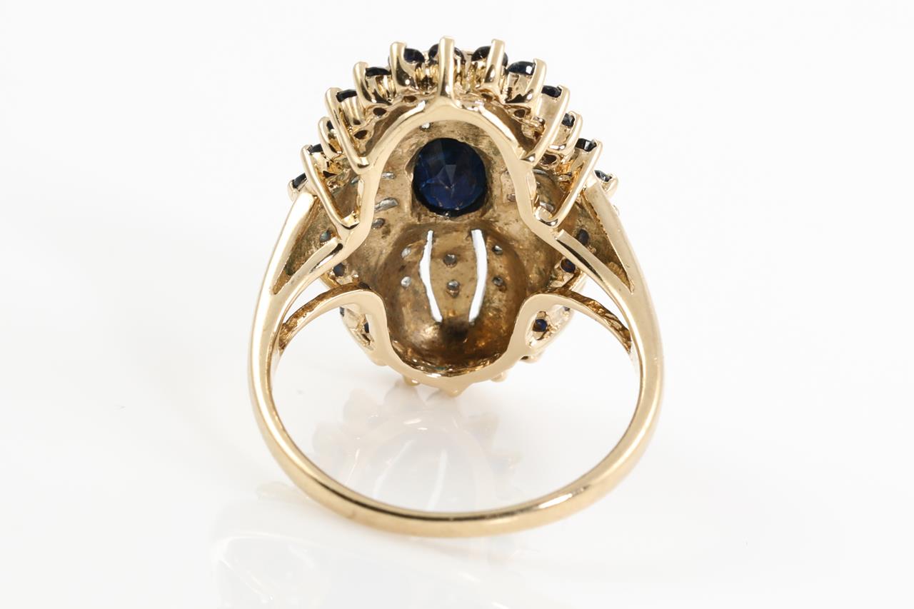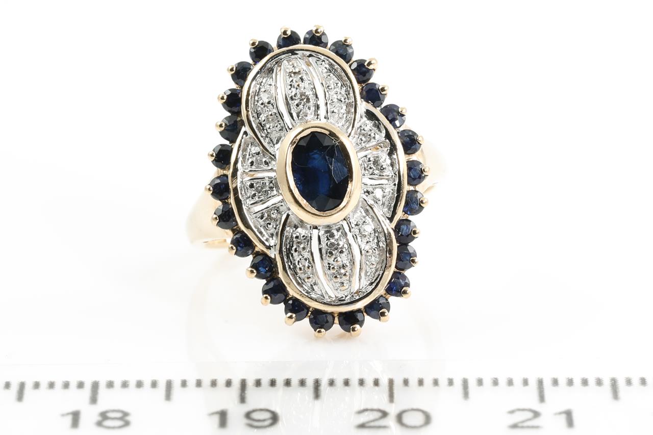 Sapphire and Diamond Ring with centre oval cut blue Sapphire of approximately 0.37ct and multiple small round Sapphires totalling approximately 0.25cts, and round Diamonds totalling approximately 0.20cts. 9ct yellow gold. Ring size M. Weight 4.6g. (Pre-owned)