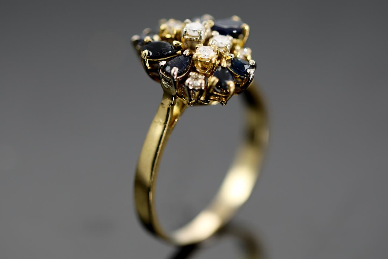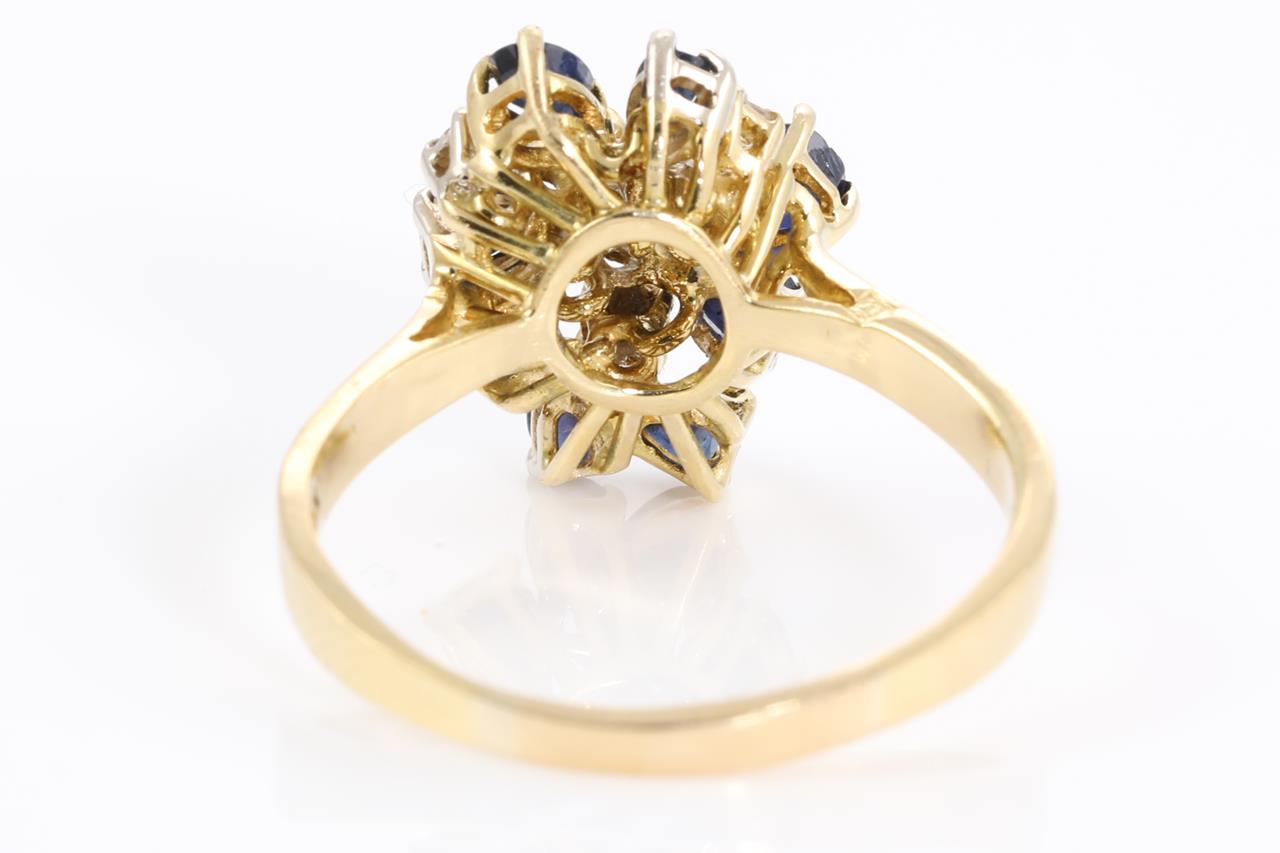 Sapphire and Diamond ring with eight pear shaped blue Sapphires totalling approximately 0.70cts and round Diamonds totalling approximately 0.20cts. 14ct yellow gold - acid tested - not stamped. Ring size T. Weight 5.5g. (Pre-owned)