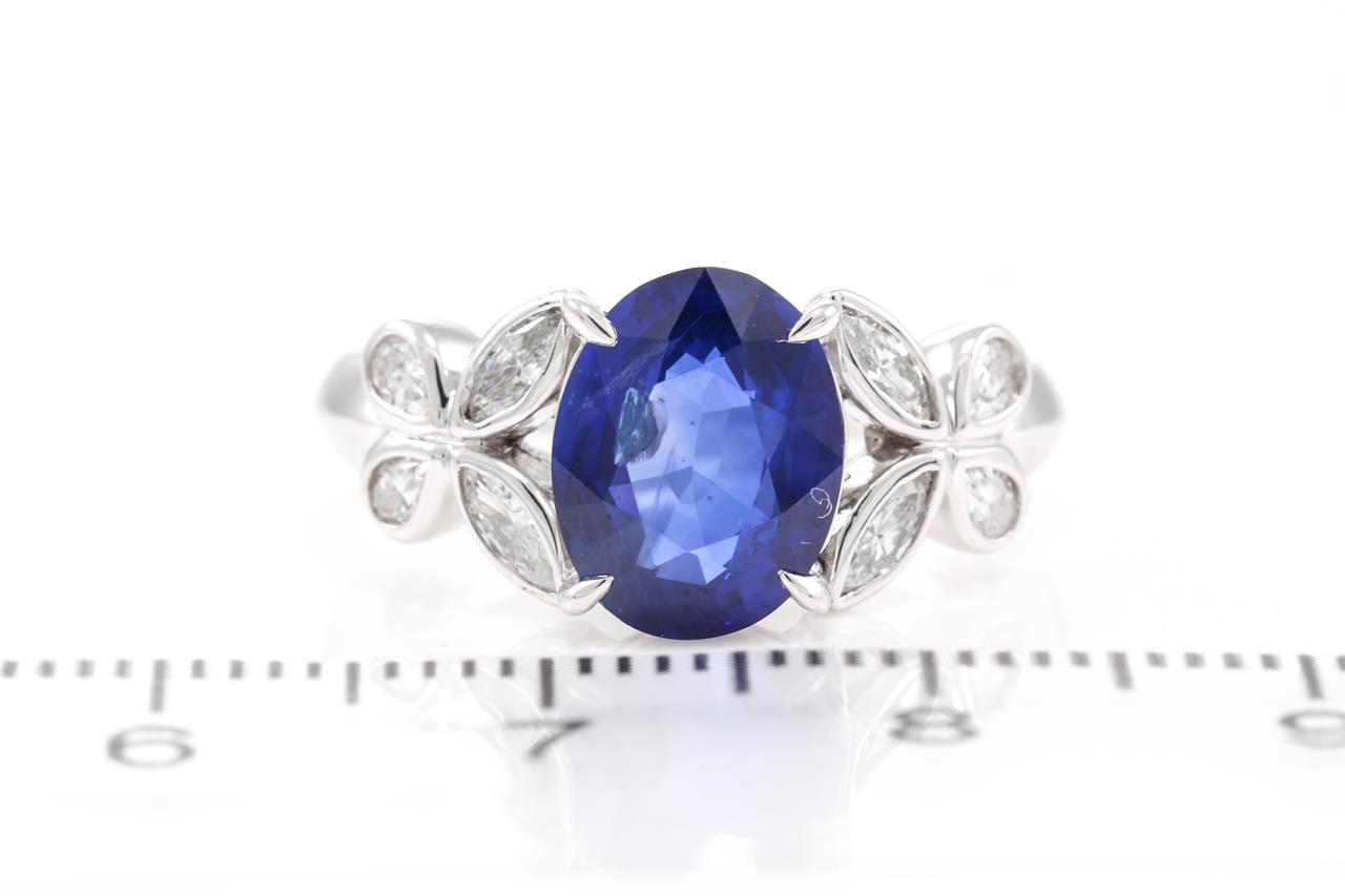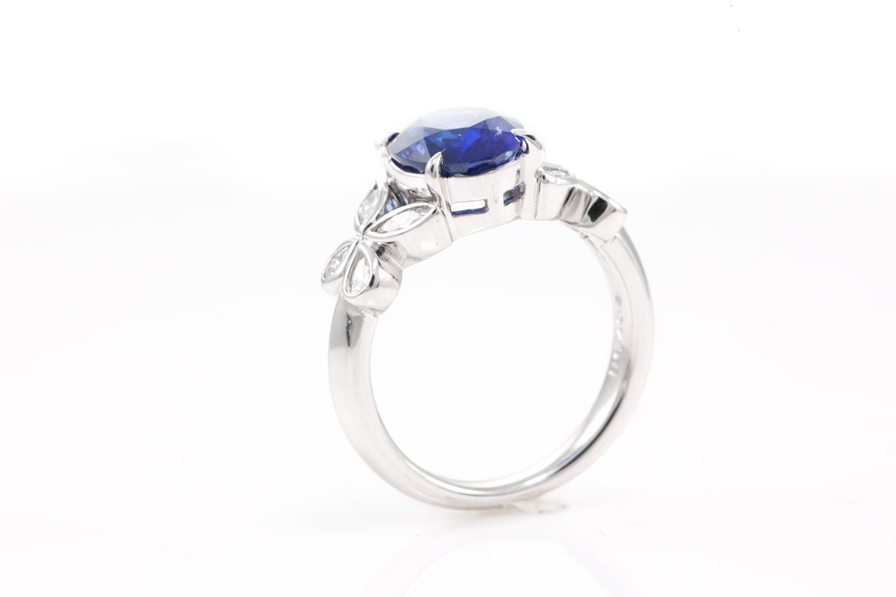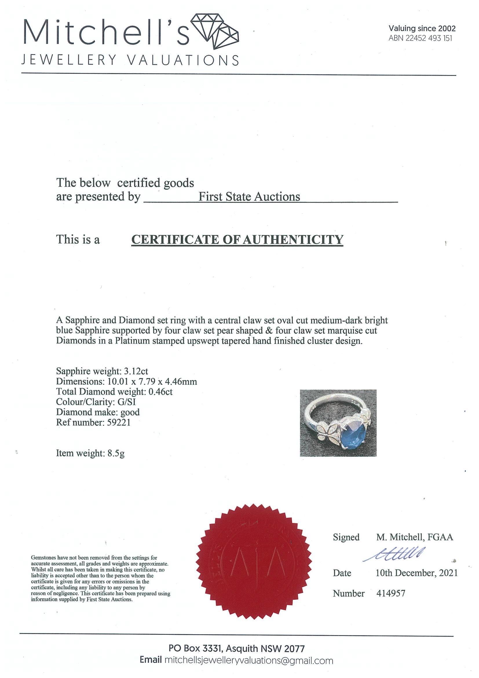 Sapphire and Diamond Ring with oval shape blue Sapphire of 3.12ct and Diamonds totalling 0.46cts (Estimated grading: G SI). Platinum. Ring size: M. Weight: 8.5g. With Certificate #414957. (Pre-owned)