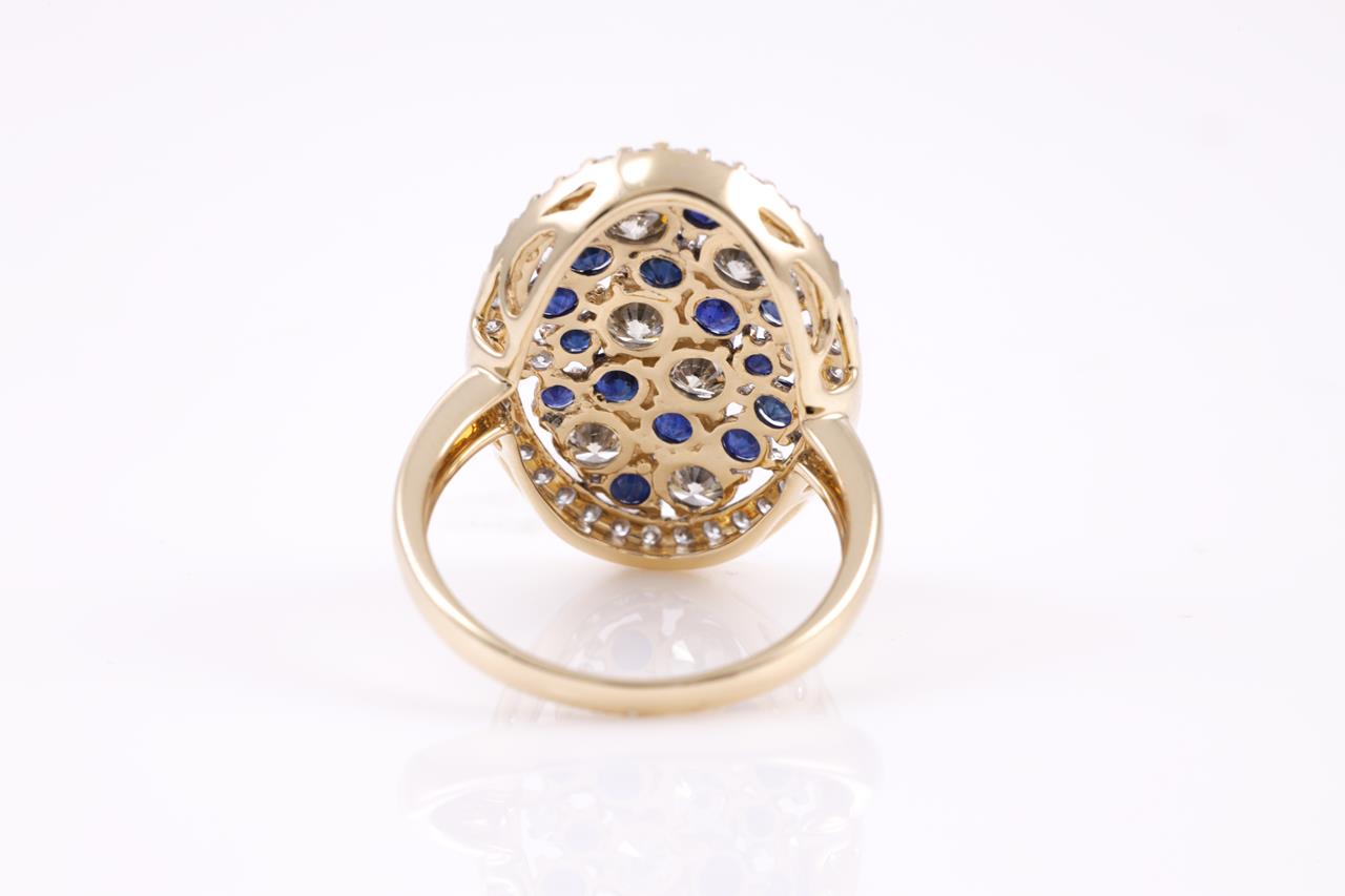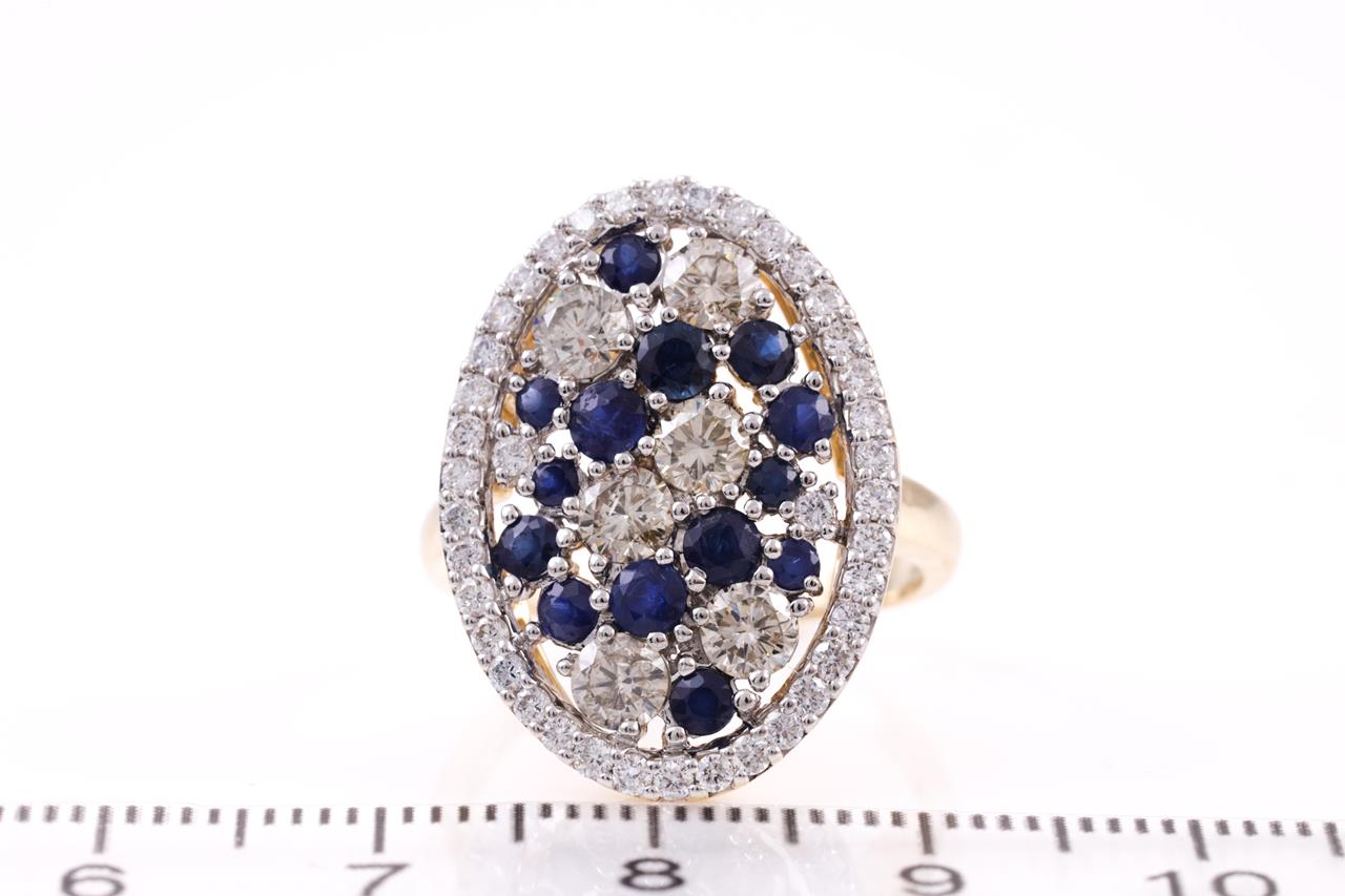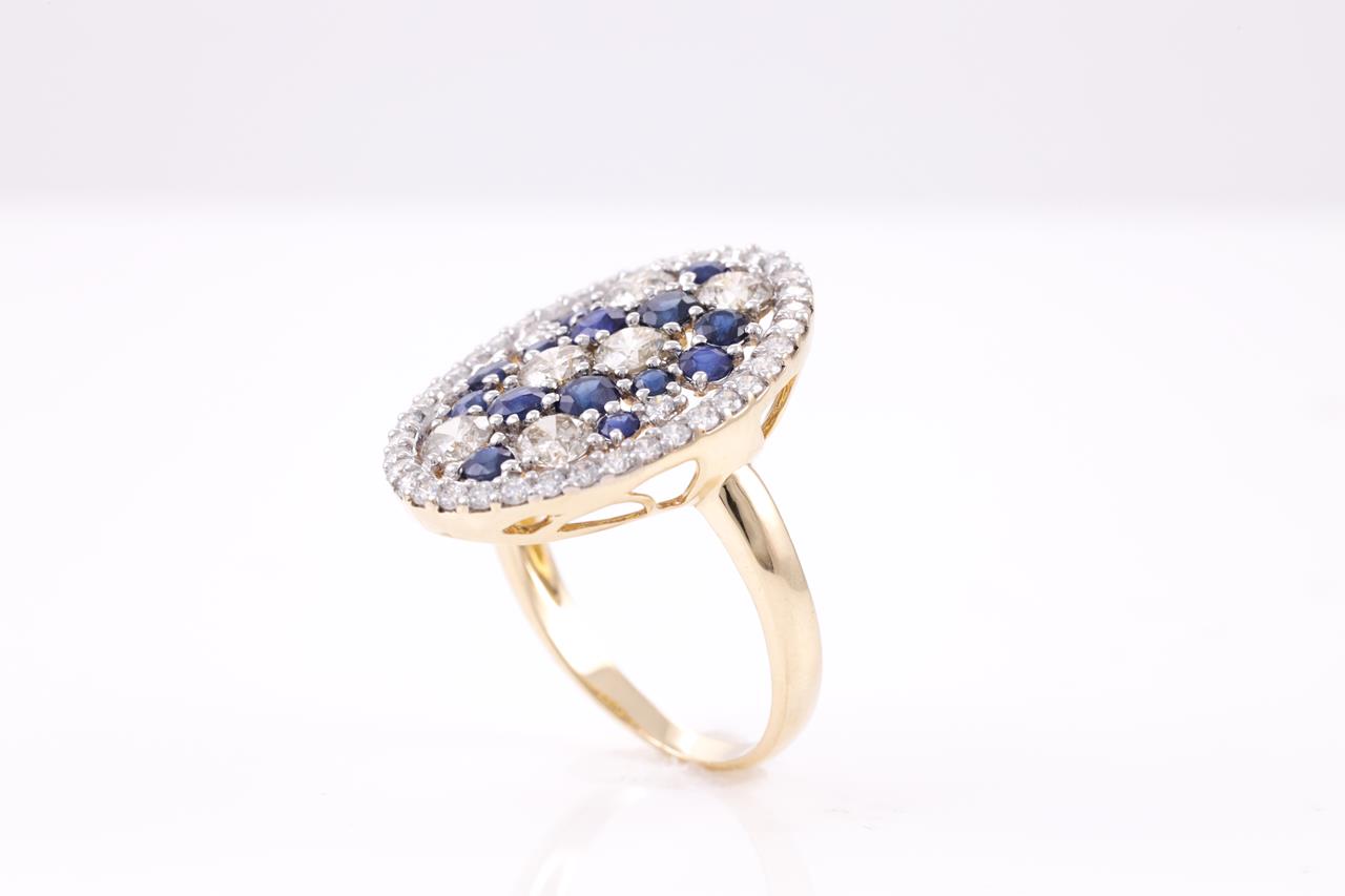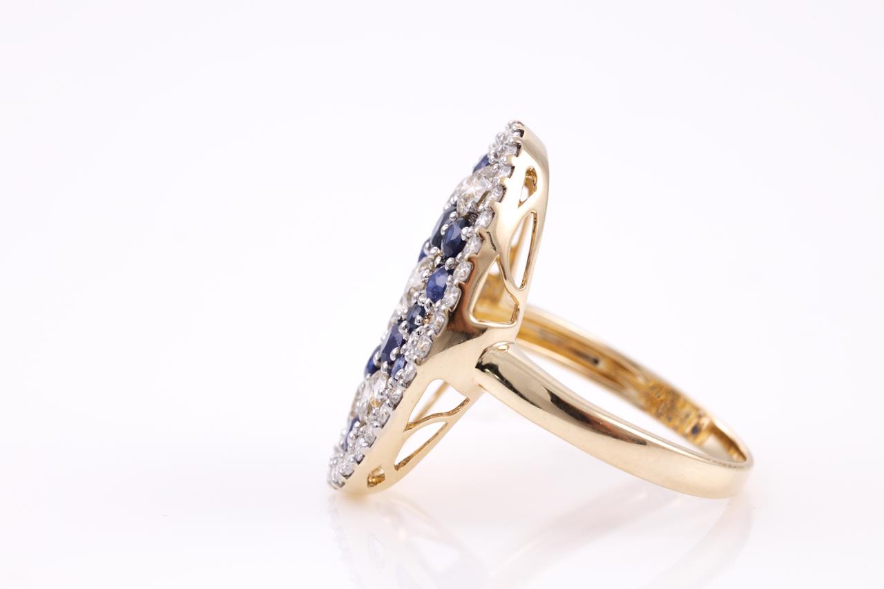 Sapphire and Diamond Ring with round blue Sapphires totalling approximately 1.10cts and round Diamonds totalling approximately 1.72cts (Estimated Grading: H-K SI-P1). 14ct yellow gold. Ring size O. Weight 4.7g. (Pre-owned)