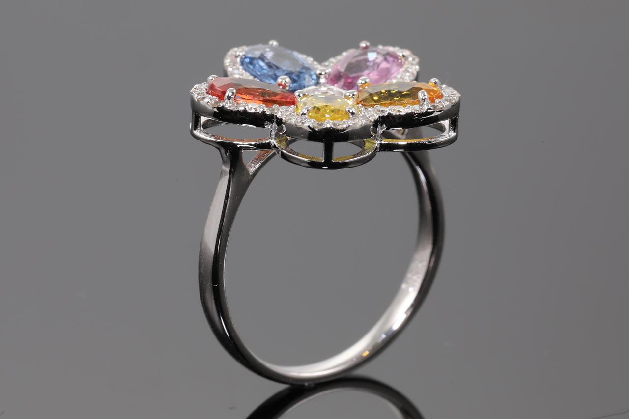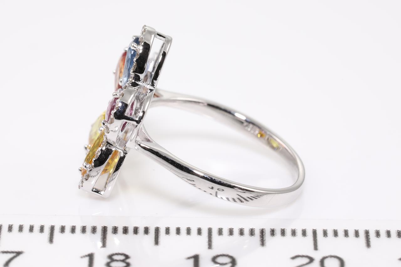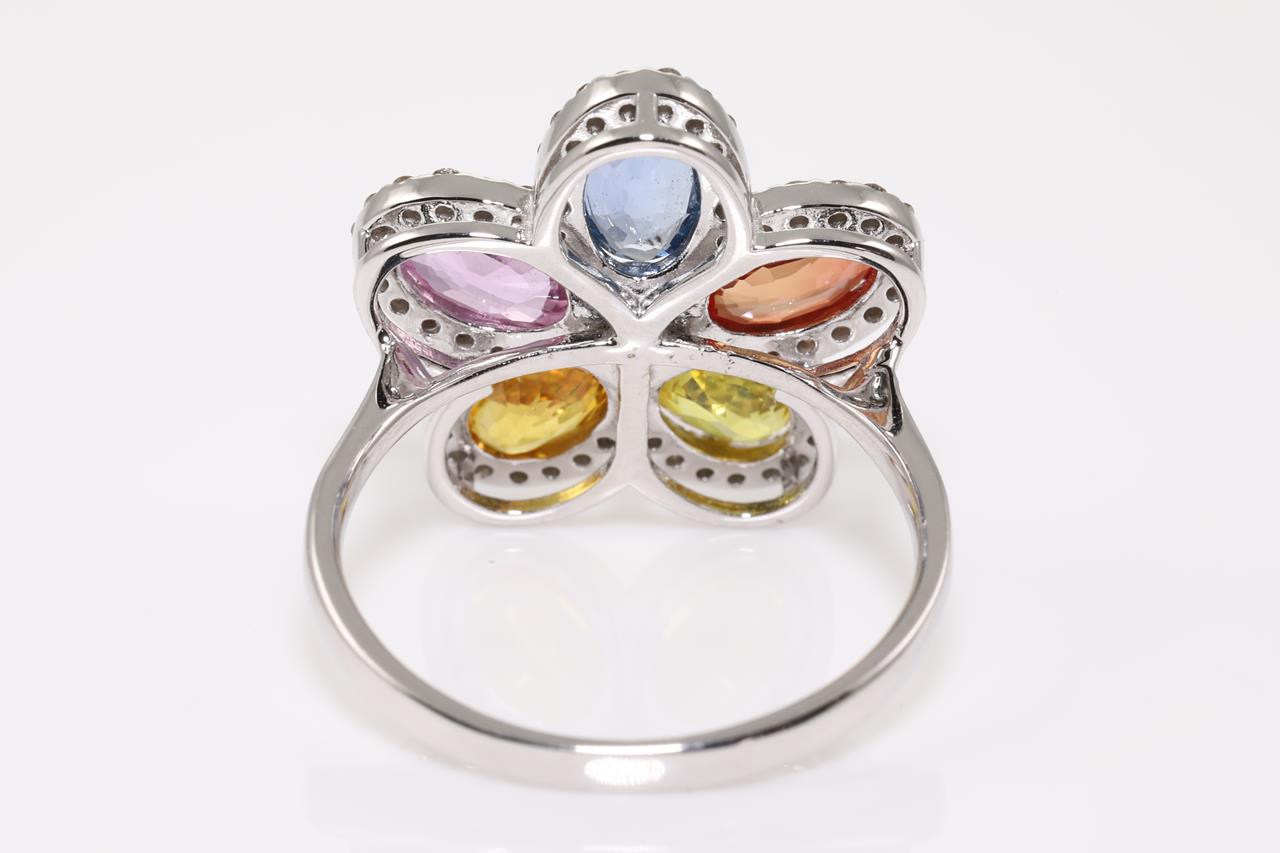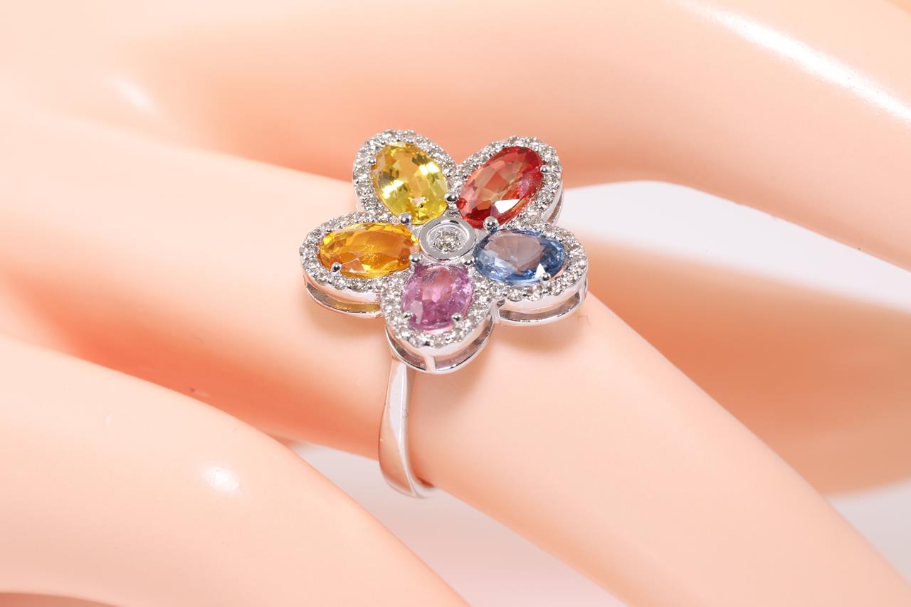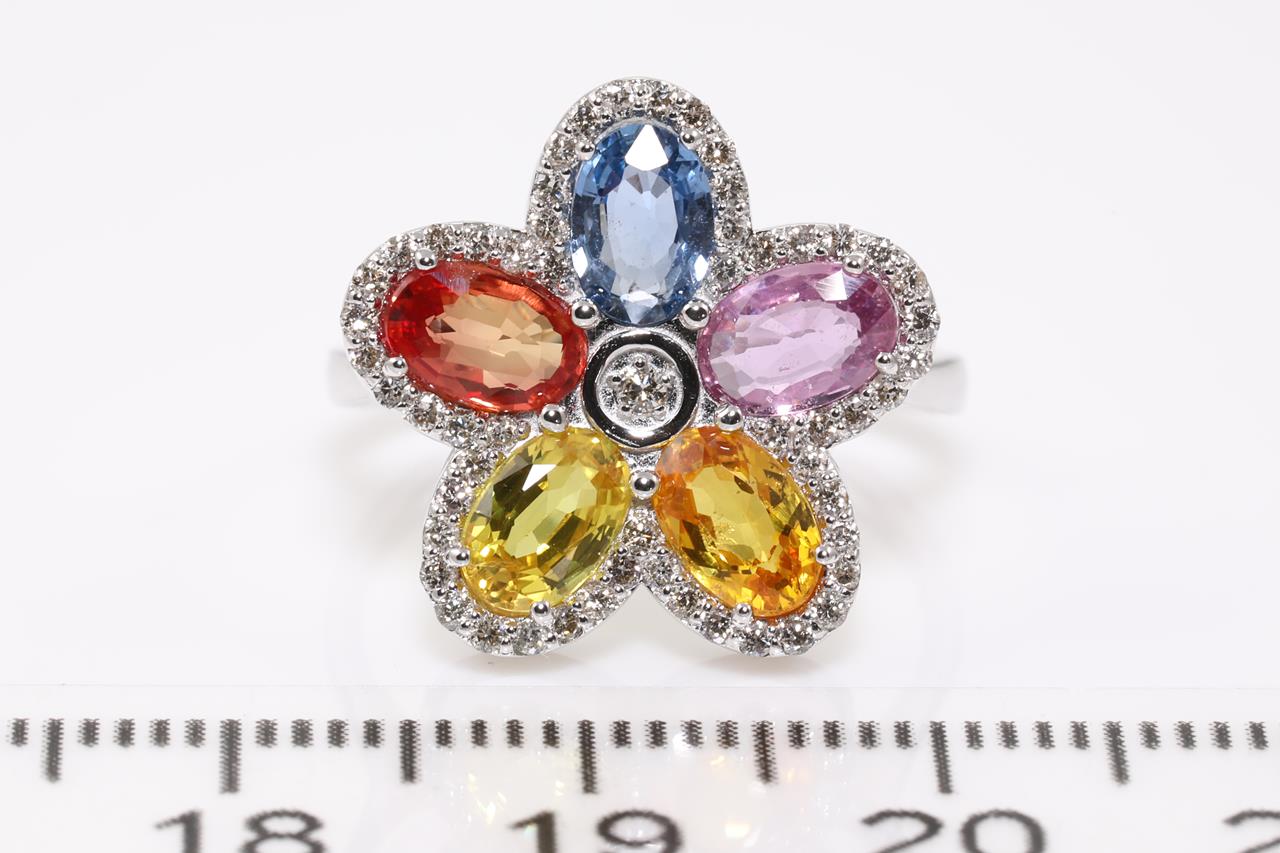 Sapphire and Diamond ring with multi-colour oval shape Sapphires totalling 3.00cts and Diamonds totalling 0.30cts (Estimated grading: G-H SI). 18ct white gold. Ring size: L. Weight: 4.3g. (pre-owned)