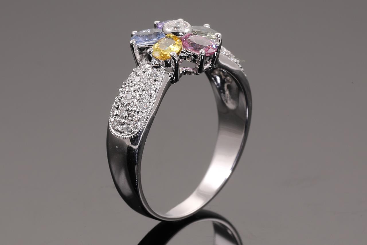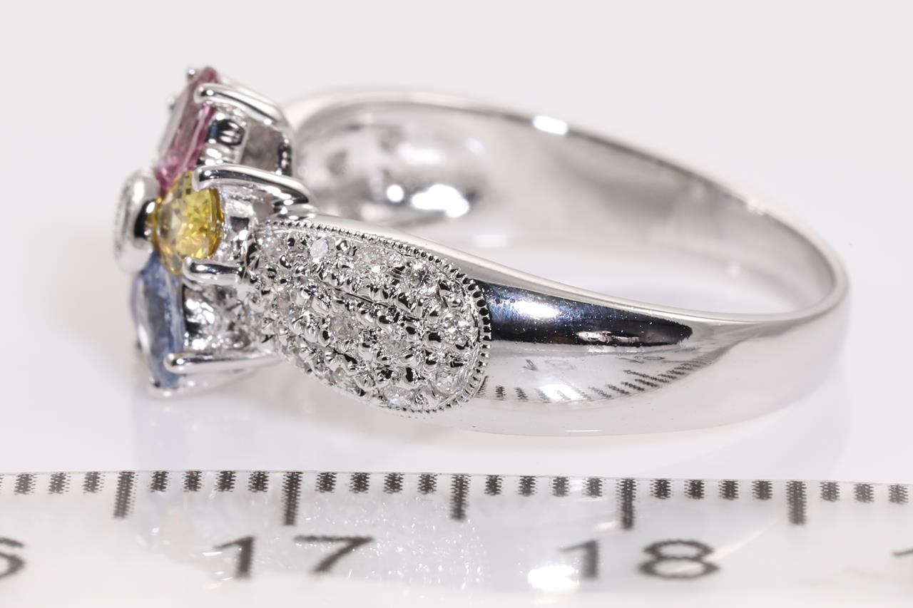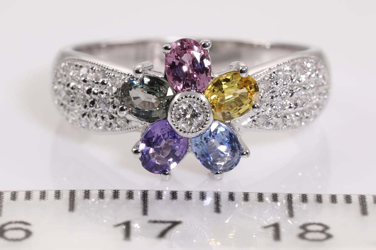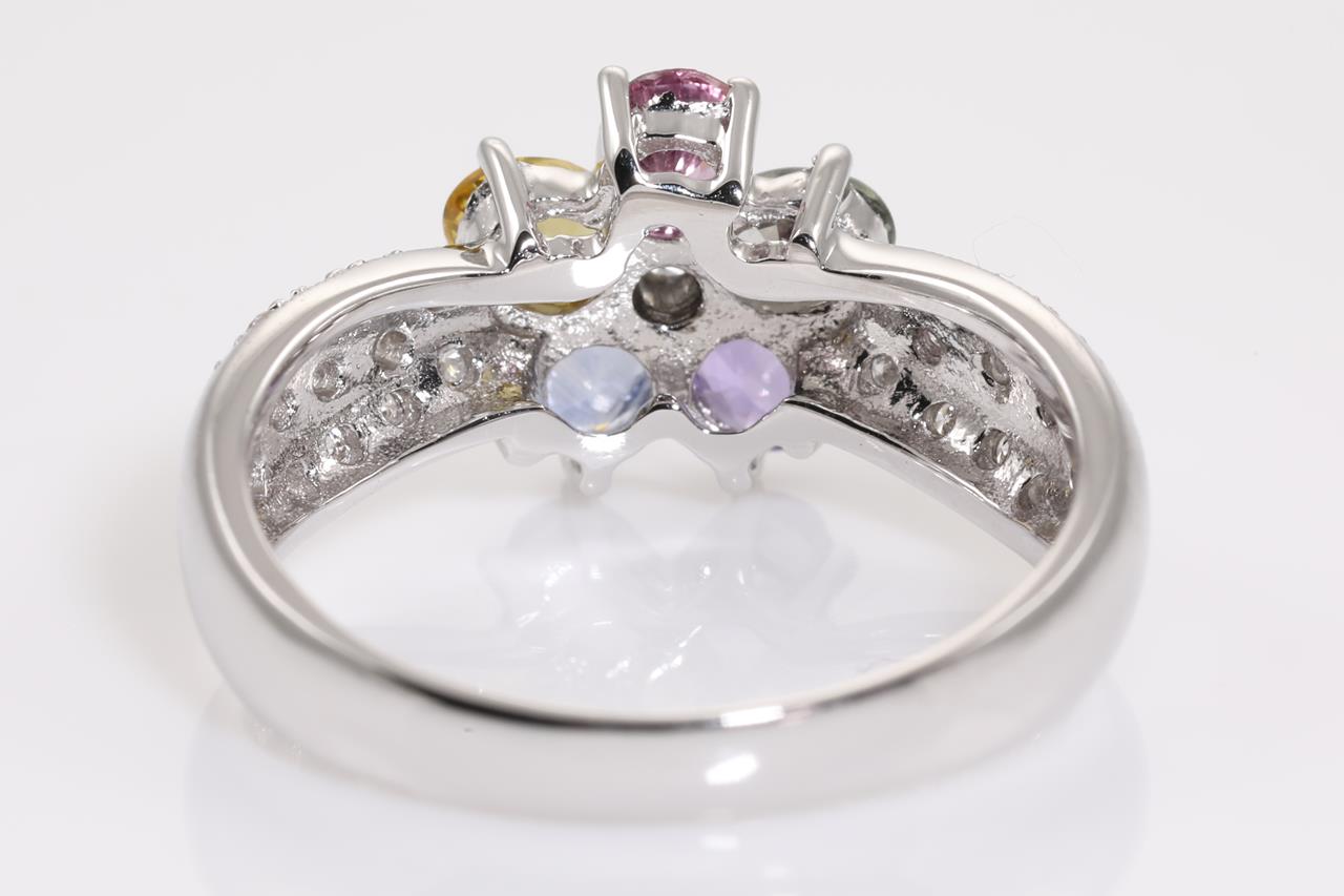 Sapphire and Diamond ring with oval cut multi-coloured Sapphires totalling approximately 1.00cts and Diamonds totalling approximately 0.13cts. 18ct white gold. Ring size: M. Weight: 13.4g. (Pre-owned)