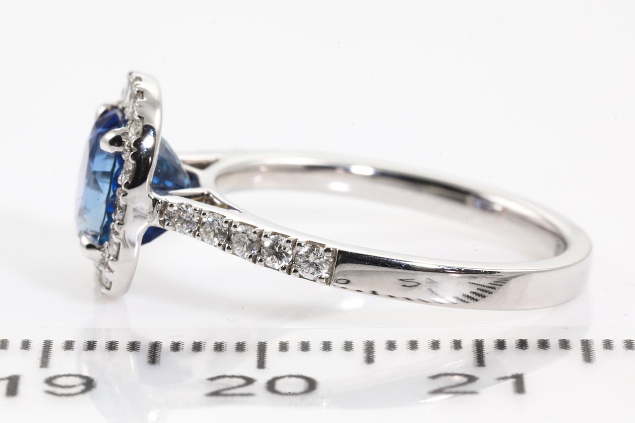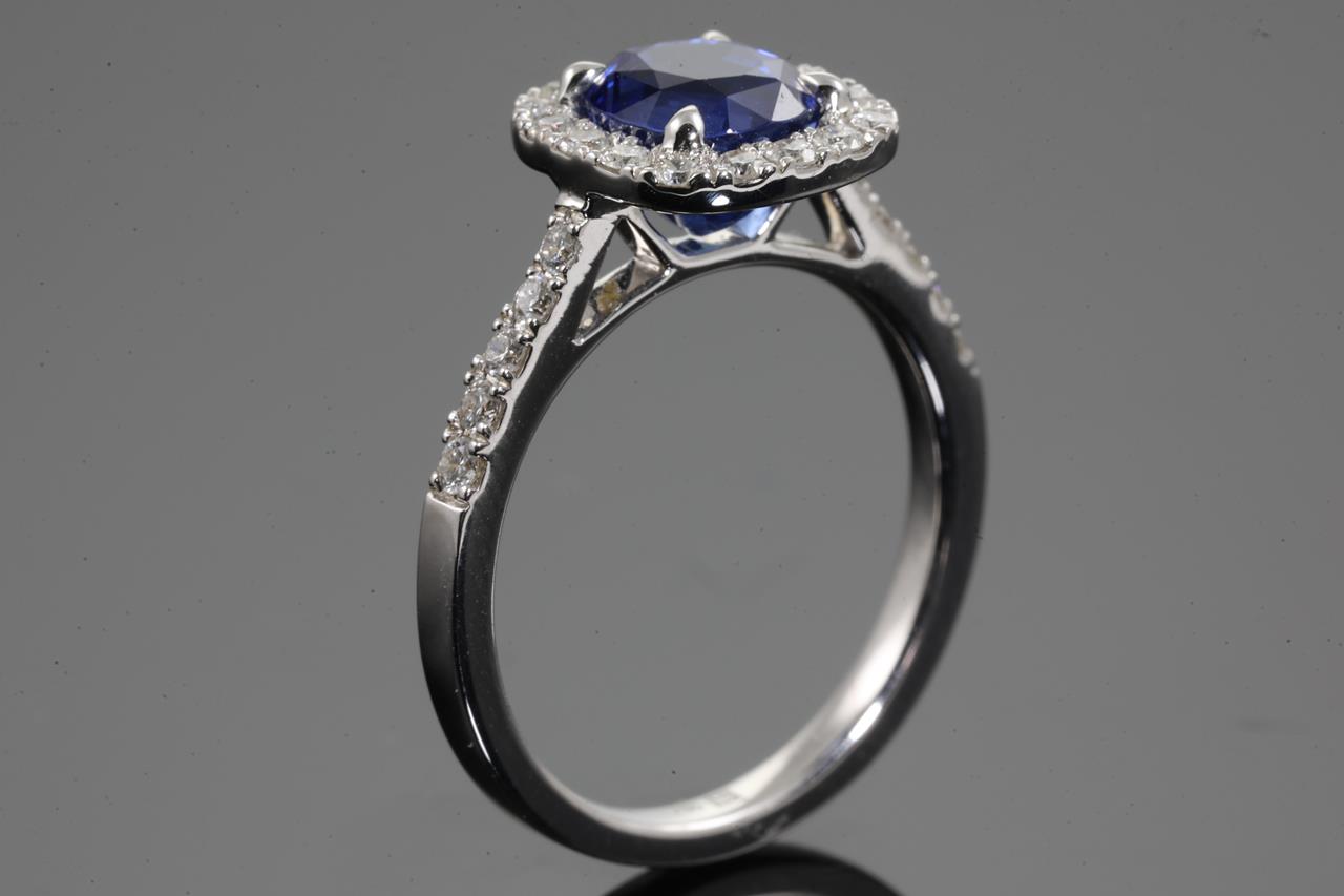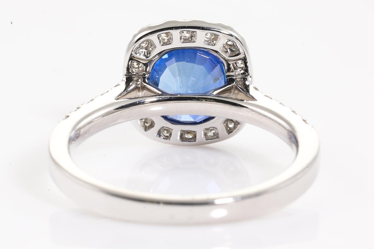 Sapphire and Diamond ring with centre cushion cut blue Sapphire of 1.8ct and round Diamonds totalling approximately 0.40cts (Estimated grading G-H SI). 18ct white gold. Ring size L1/2. By Hardy Brothers. Weight 4.2g. (Pre-owned)