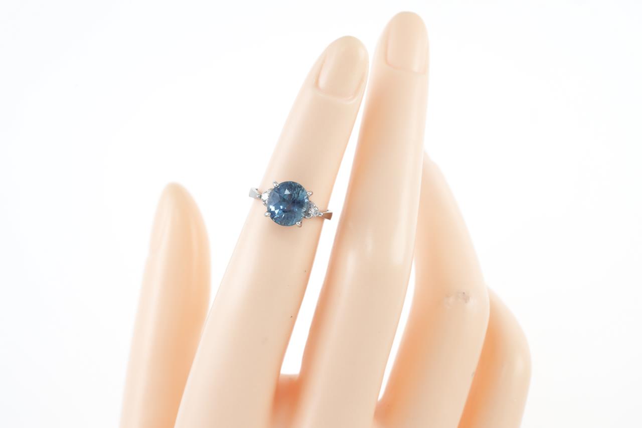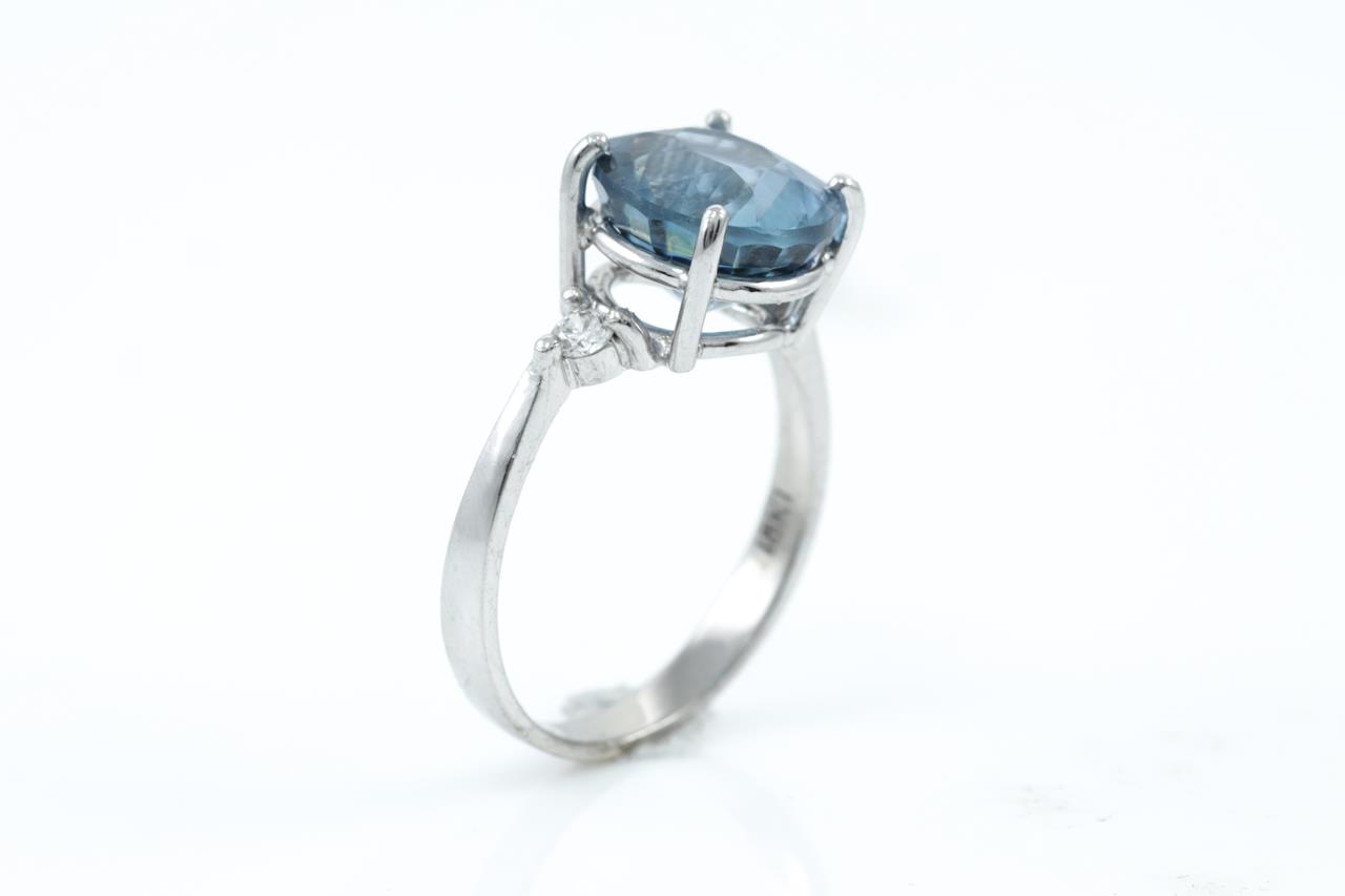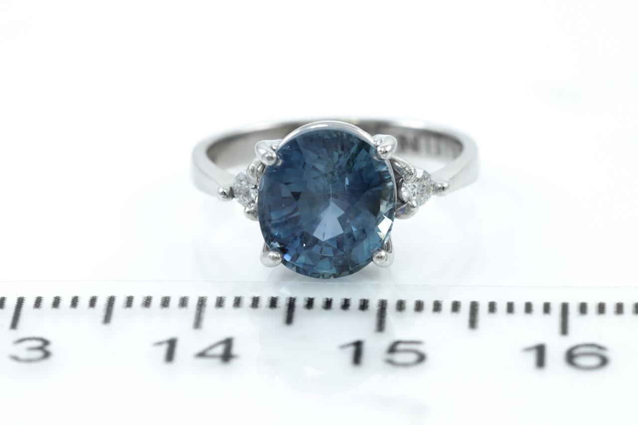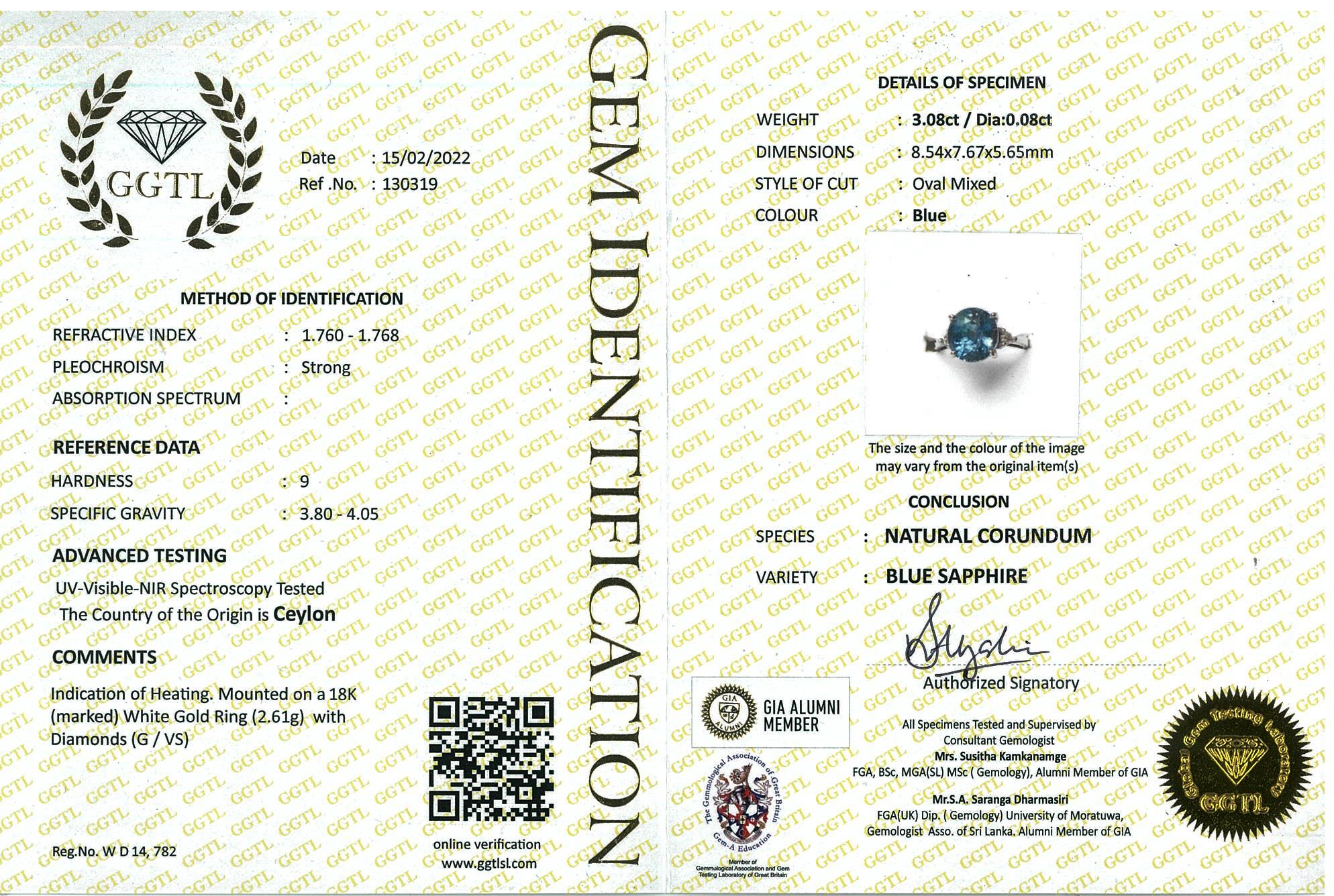 Sapphire and Diamond Ring with oval blue Sapphire of 3.08ct and round Diamonds totalling approximately 0.08cts. 18ct white gold. Ring size G. Weight 2.6g. With GGTL report #130319. (As New)