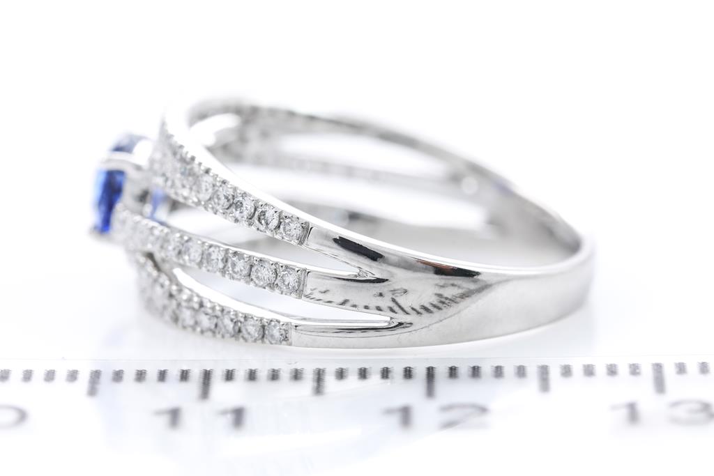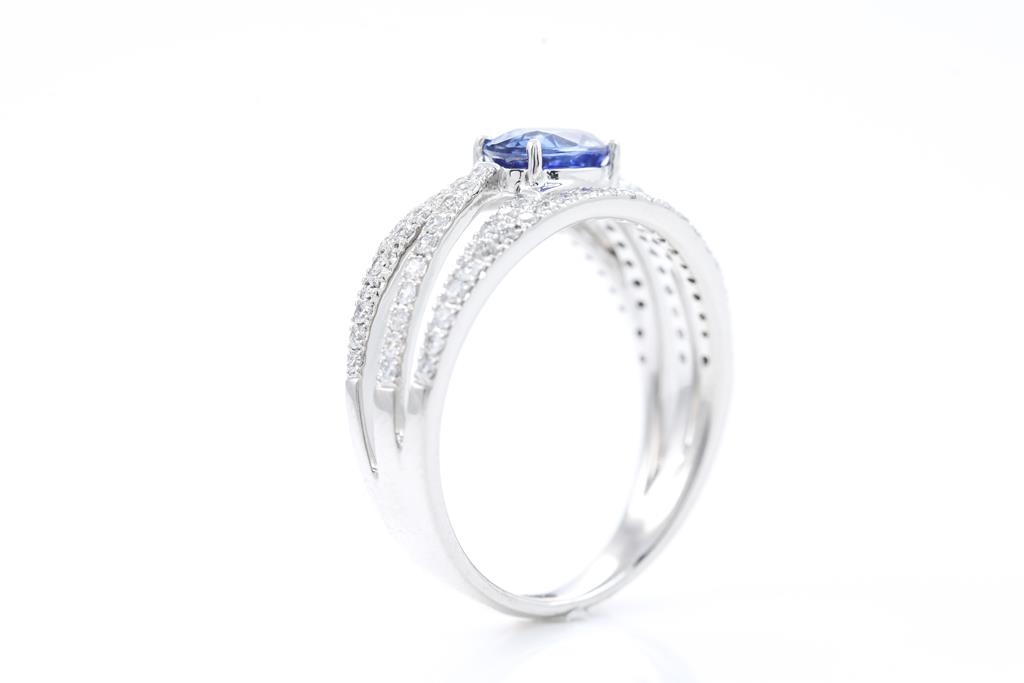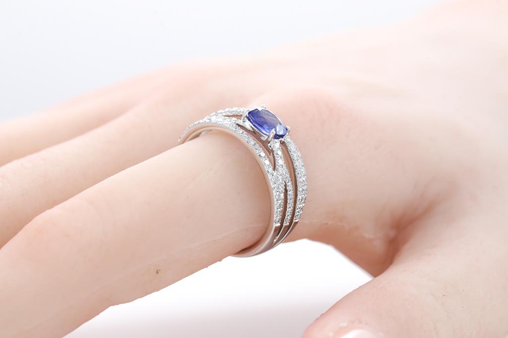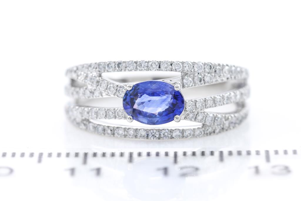 Dress ring with oval cut blue Sapphire of 0.99ct (minor chip near the girdle) and round Diamonds totalling approximately 0.49cts (Estimated grading G SI). 18ct white gold. Ring size P. Weight 4.8g. (Pre-owned)