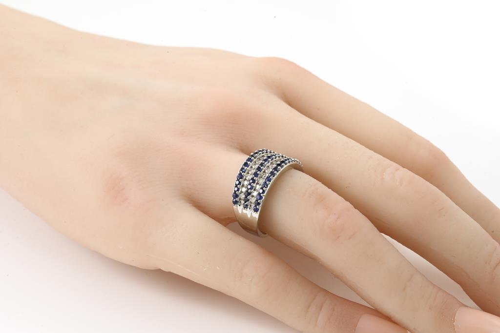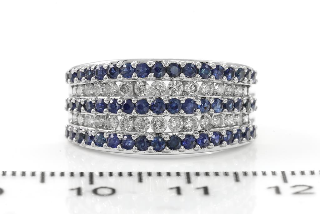 Sapphire and Diamond Ring with round cut Sapphires totalling approximately 0.50cts and round Diamonds totalling approximately 0.25cts. 10ct white gold. Ring size N. Weight 5.1g. (Pre-owned)
