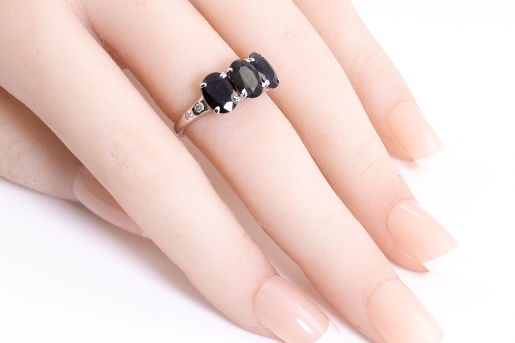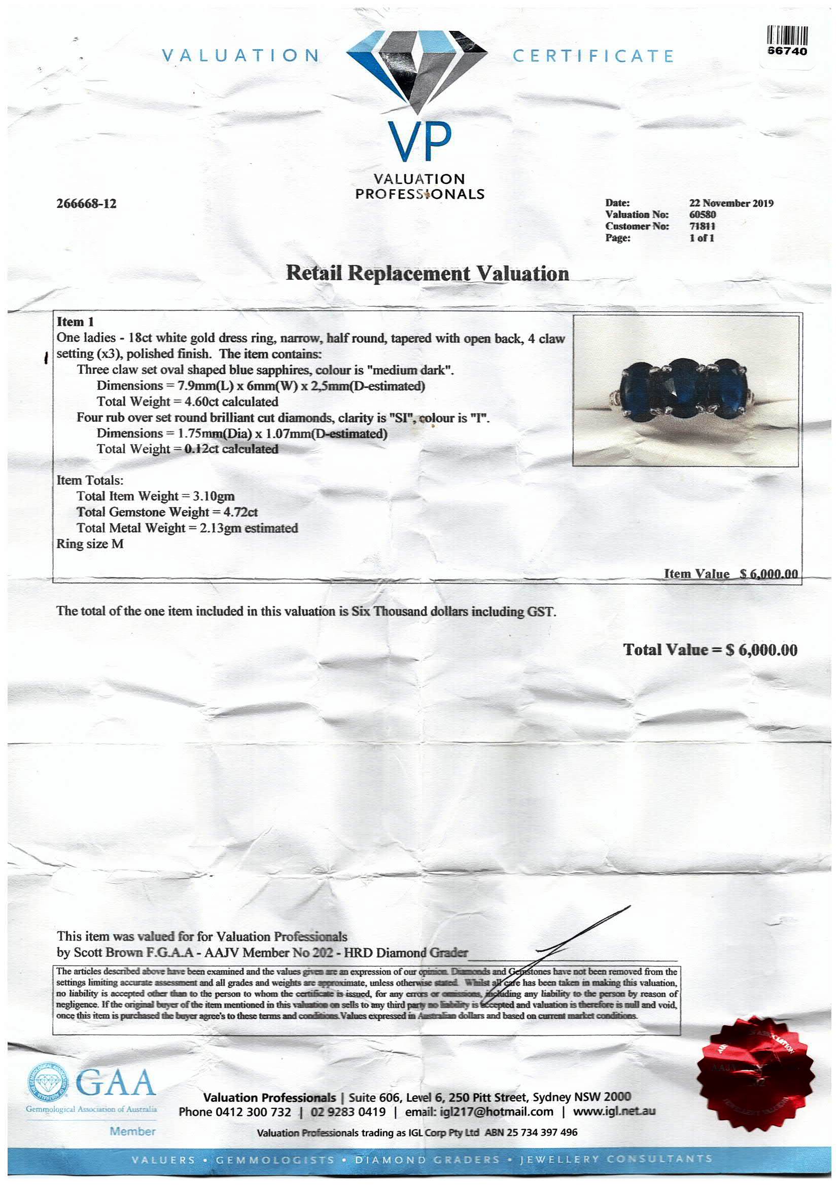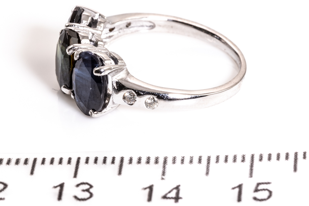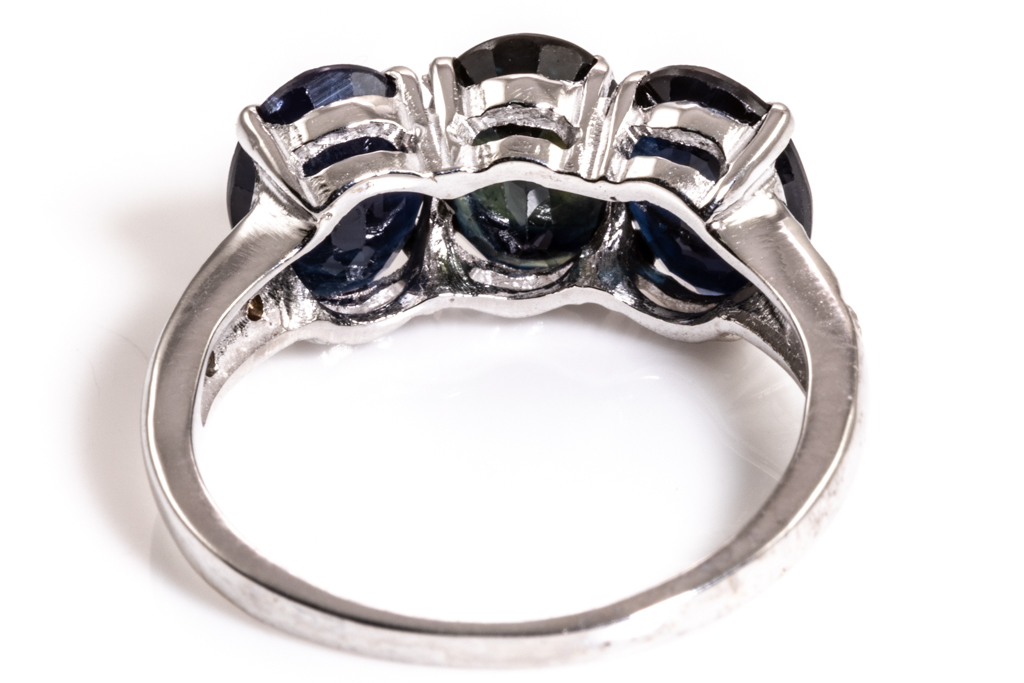 Sapphire and Diamond Ring with oval cut blue Sapphires totalling approximately 4.60ct and round Diamonds totalling approximately 0.12ct. 18ct white gold. Ring size M. Weight 3.1g. With Valuation. (Pre-owned)
