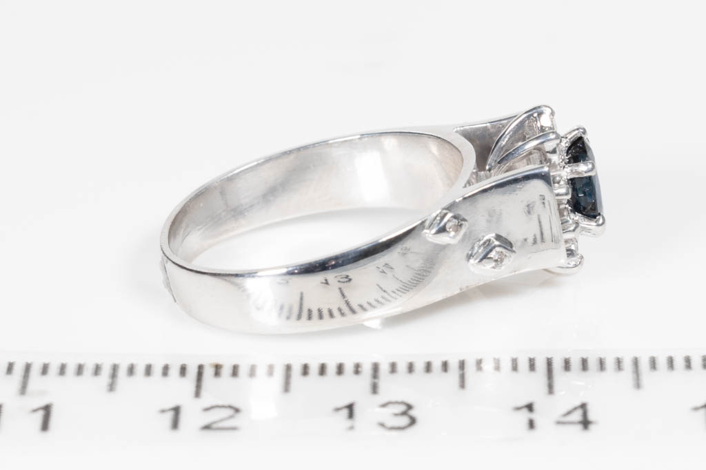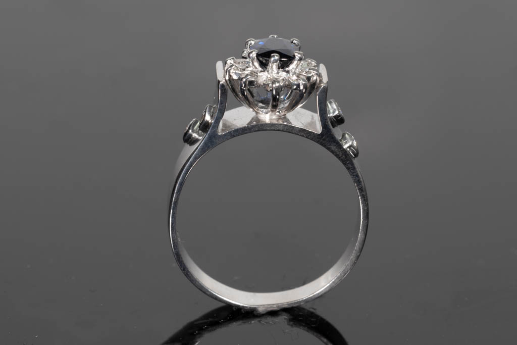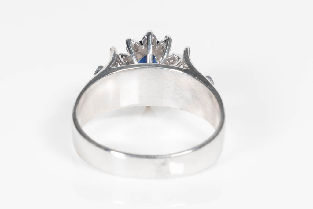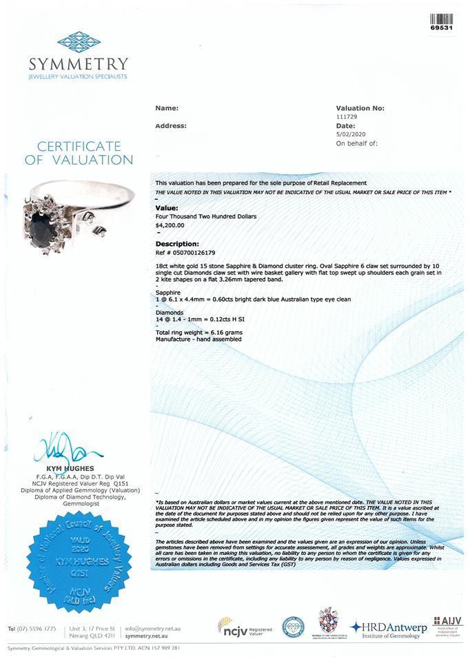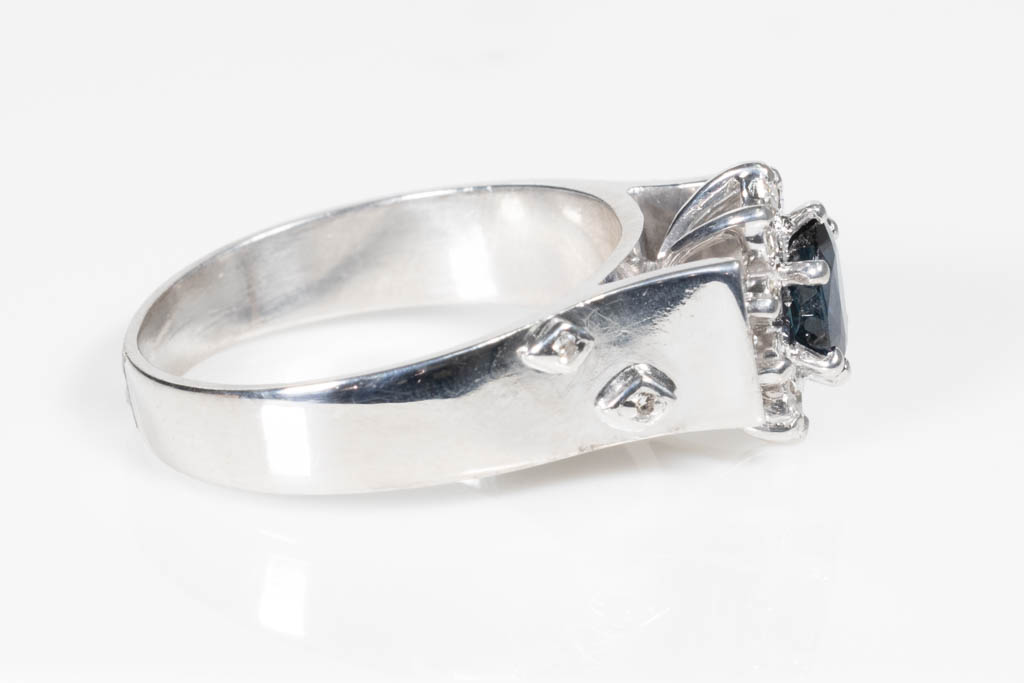 Sapphire and Diamond Ring with oval cut deep blue Sapphire of approximately 0.60ct and Diamonds totalling approximately 0.12cts. 18ct white gold. Ring size N. Weight 6.1g. With Valuation. (Pre-owned)