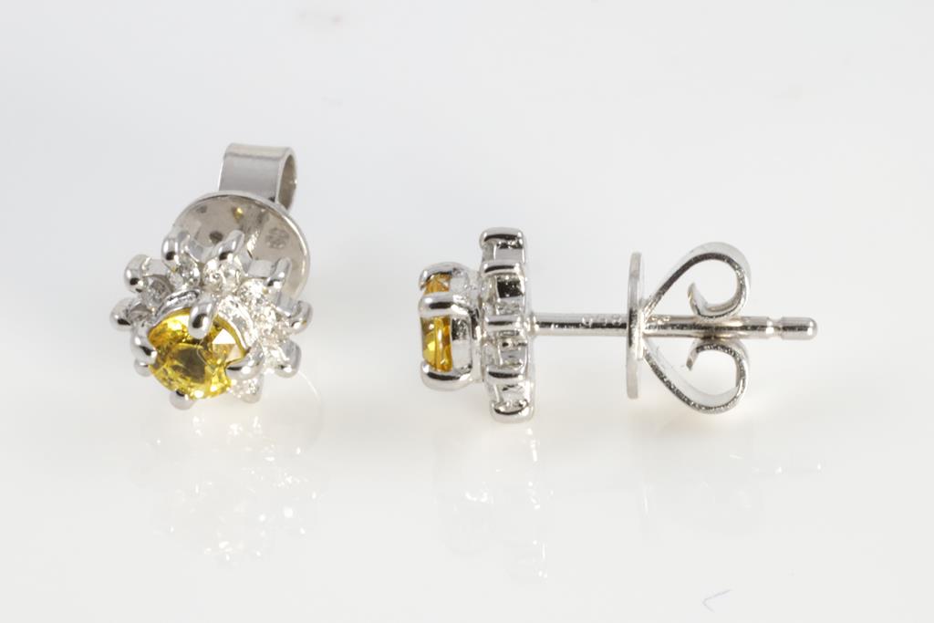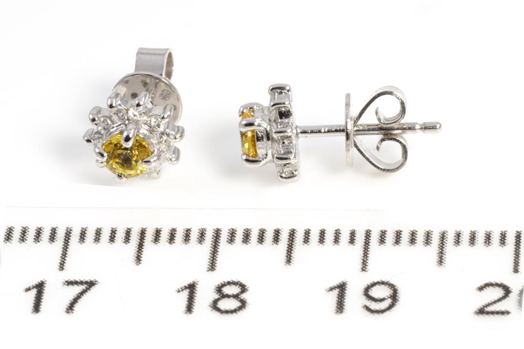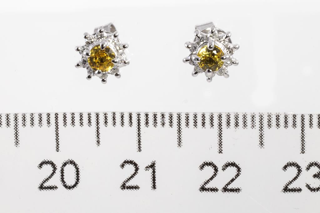 Sapphire and Diamond stud earrings with round yellow Sapphire totalling 0.45cts and round Diamonds totalling 0.18cts. Platinum with 18ct white gold backs. Weight: 2.3g. (Pre-owned)