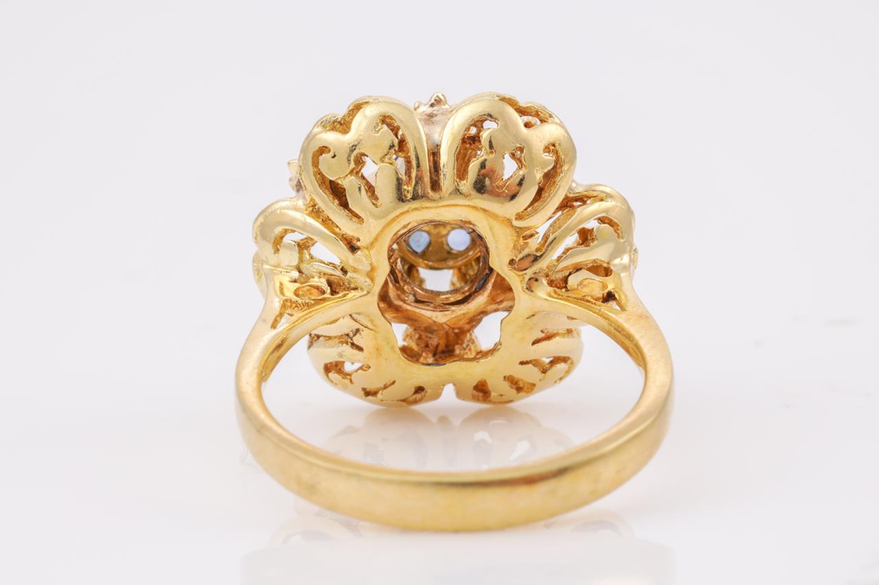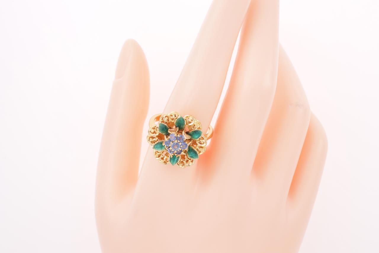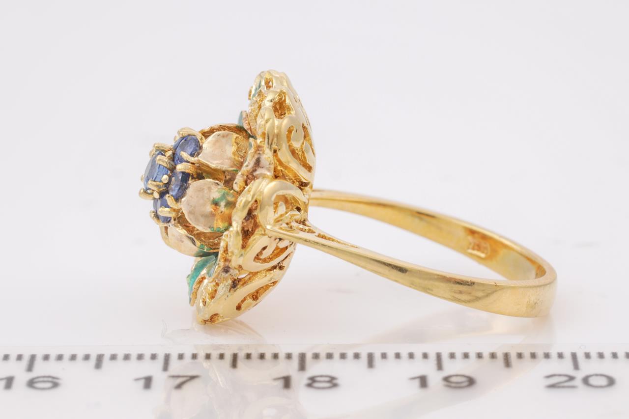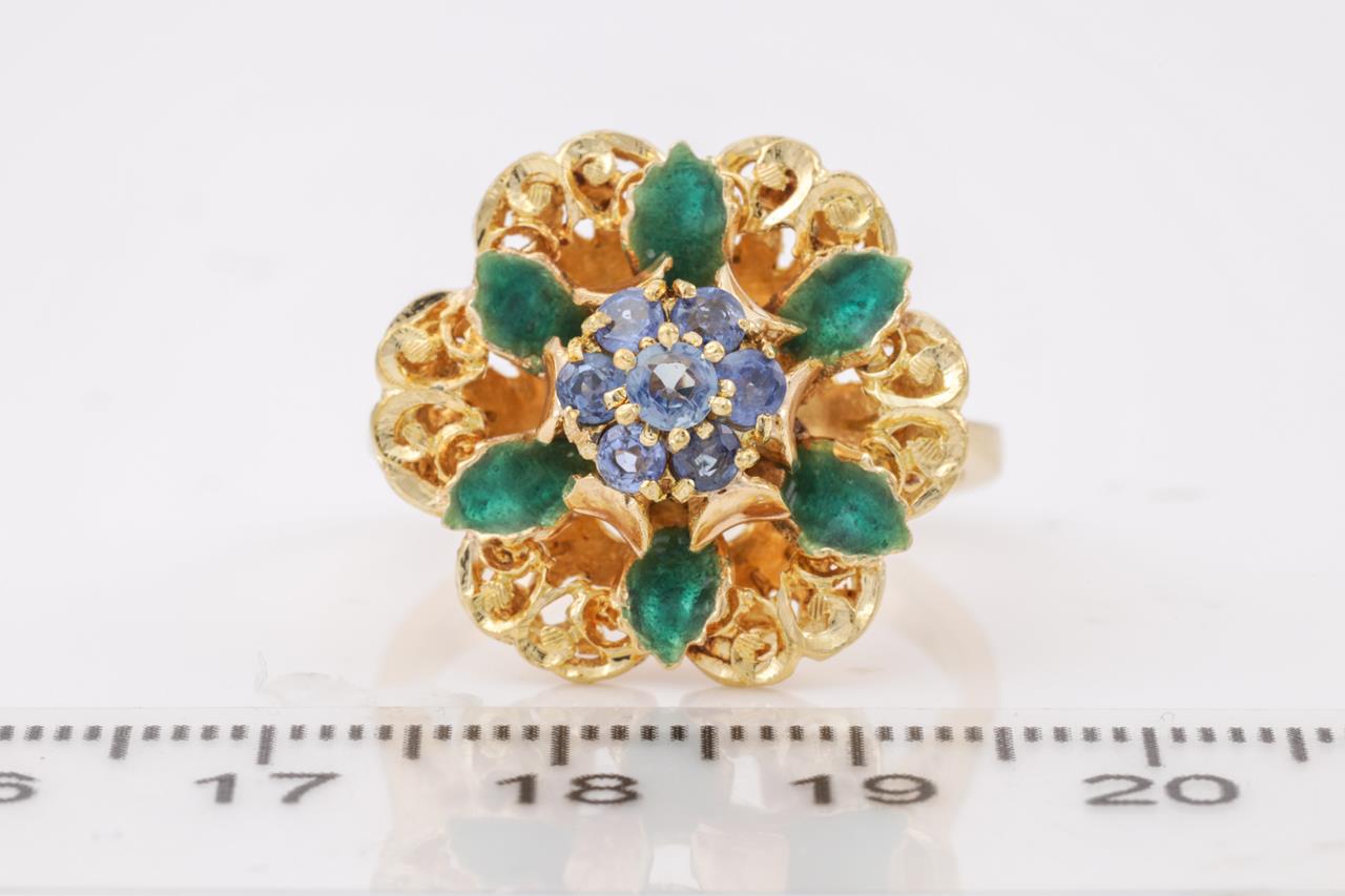 Sapphire and Enamel Ring with seven round blue Sapphires totalling approximately 0.40cts and green Enamel. 18ct yellow gold. Ring size T1/2. Weight 9.9g. (Pre-owned)