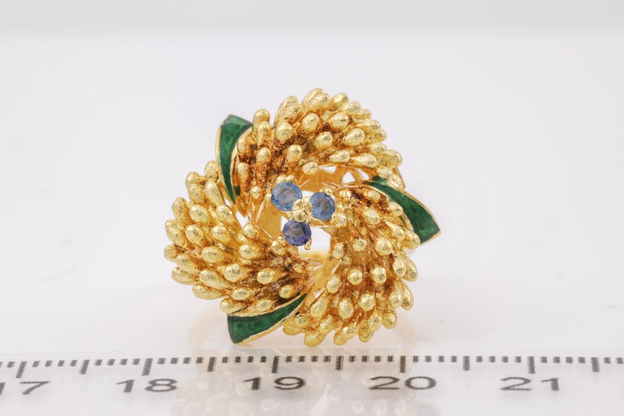 Sapphire and Enamel Ring with three round blue Sapphires totalling approximately 0.15cts and green Enamel. 18ct yellow gold. Ring size K1/2. Weight 11.2g. (As New)