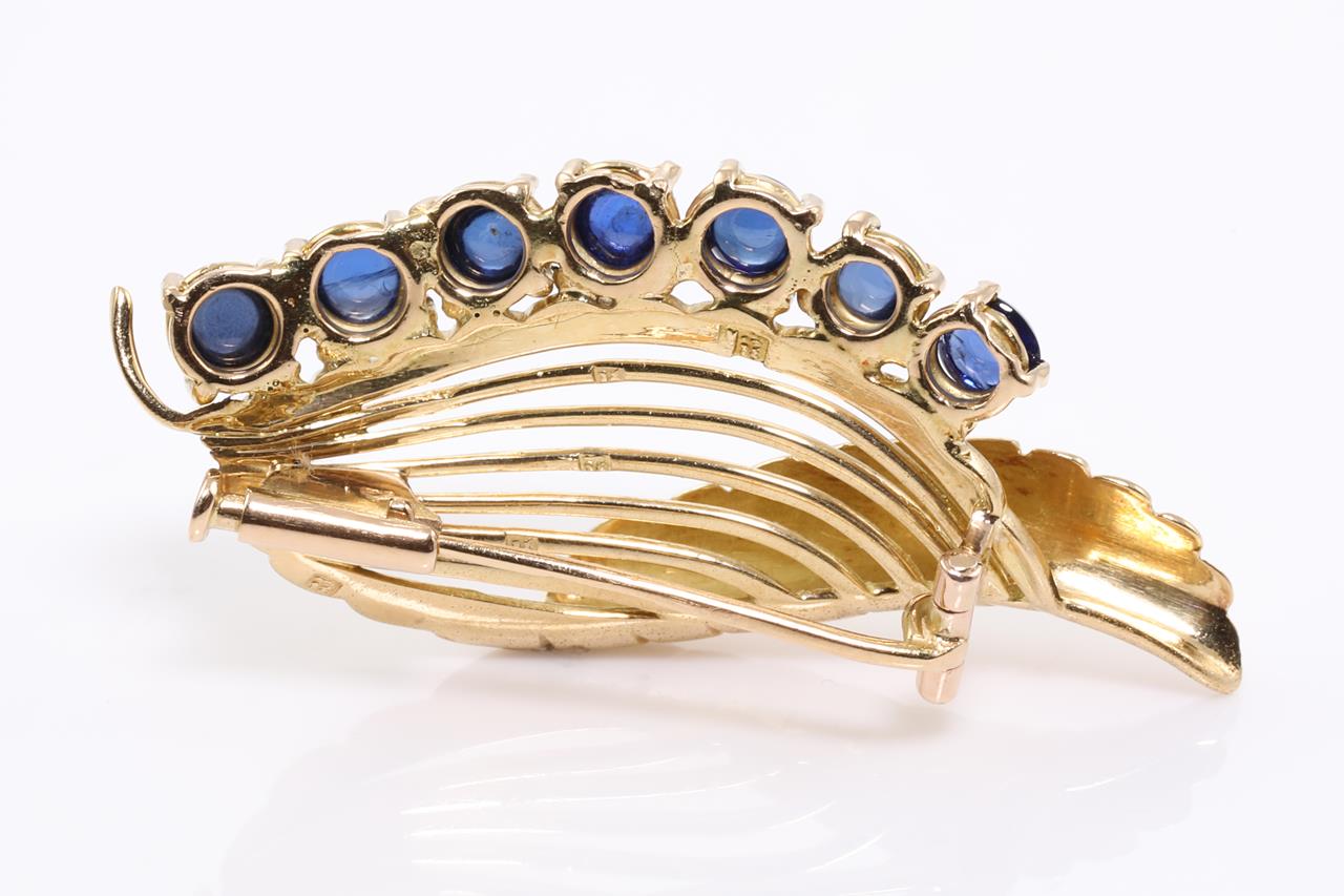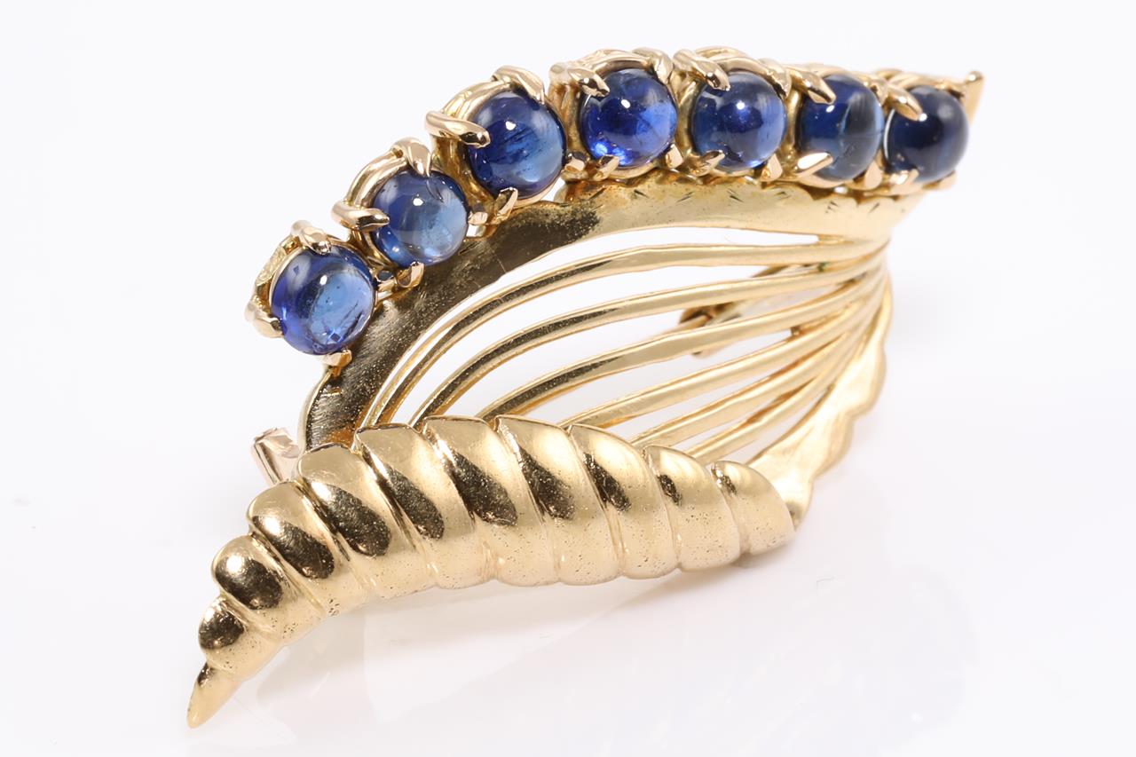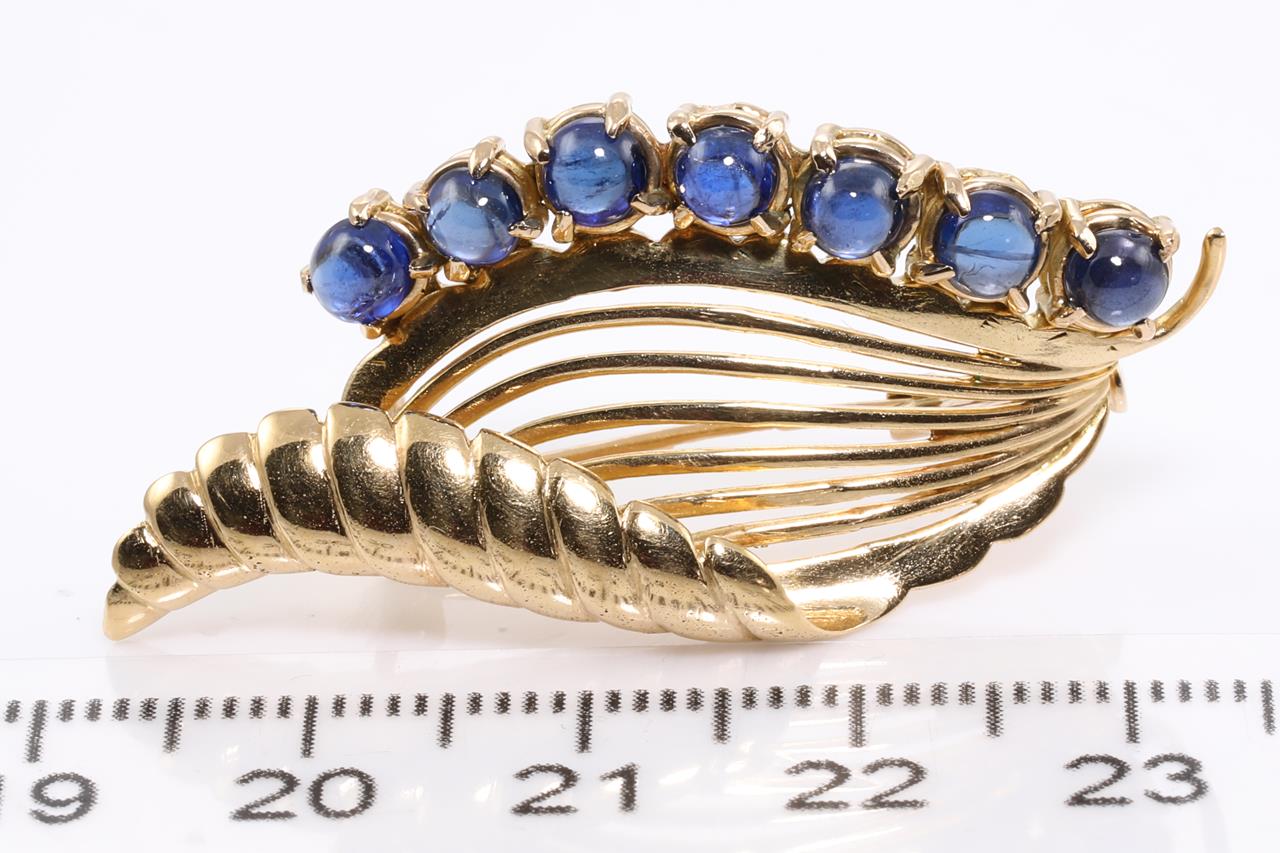 Sapphire Brooch with seven round cabochon cut Sapphire totalling approximately 1.75cts. 14ct gold. Length 5.5cm. Weight 7.5g. (Pre-owned)