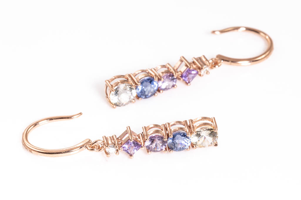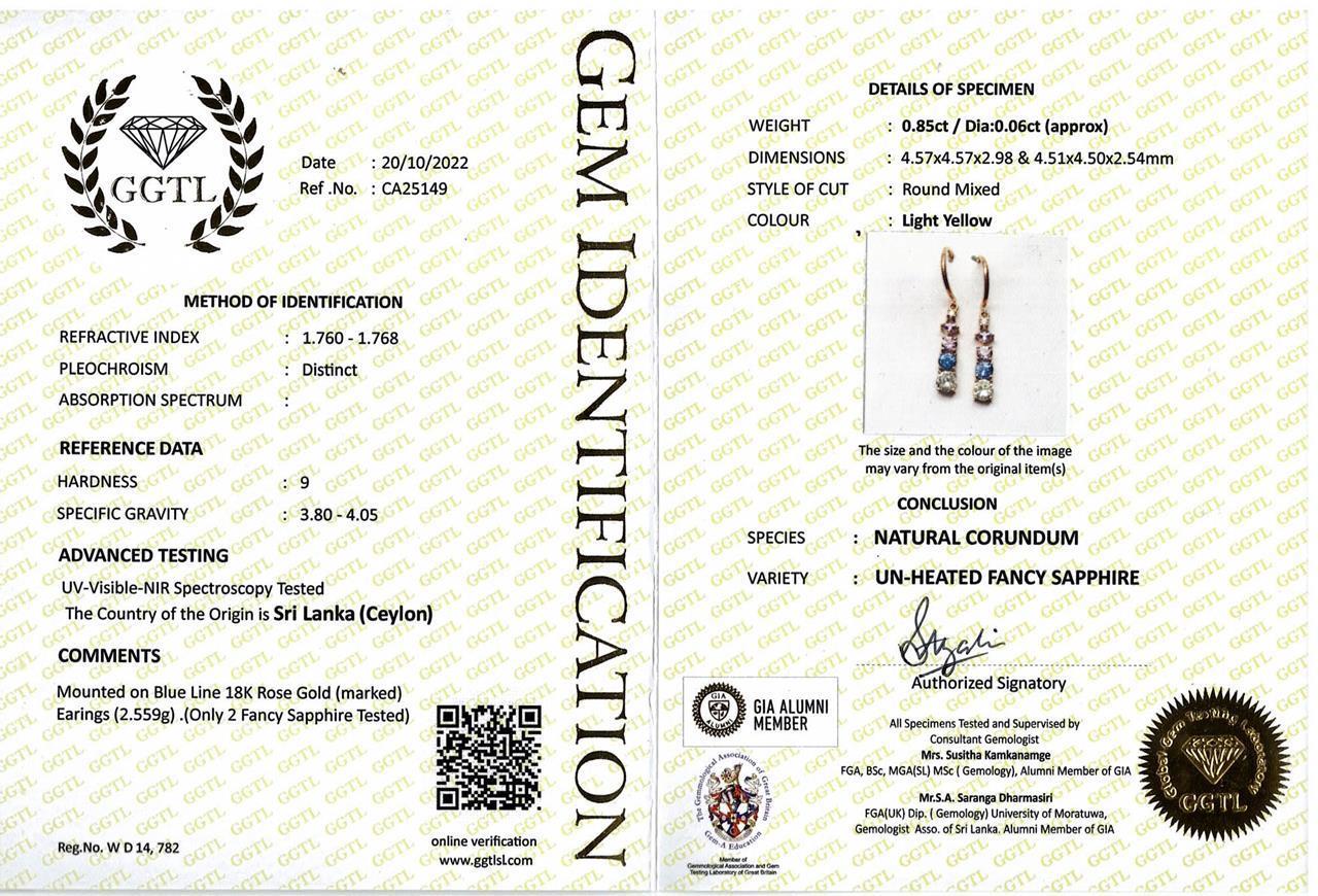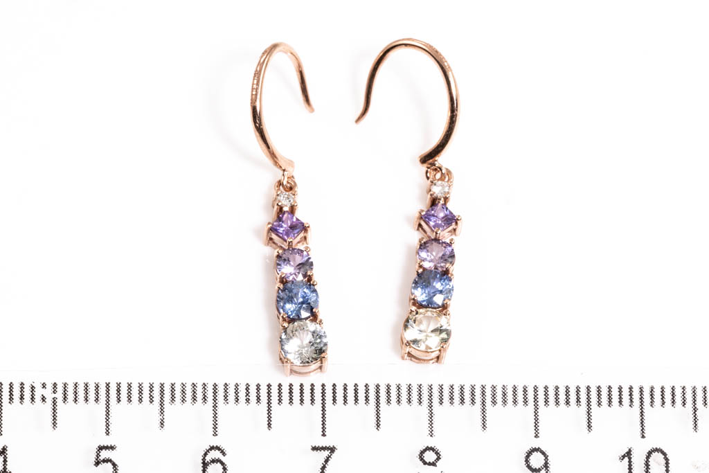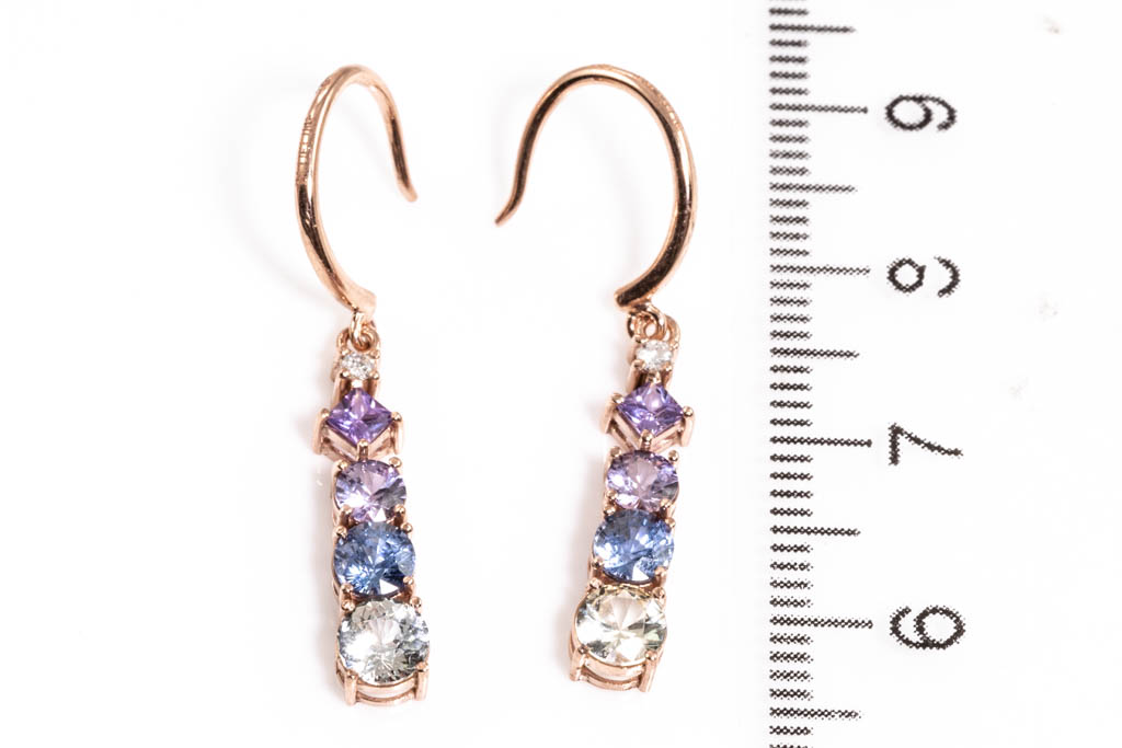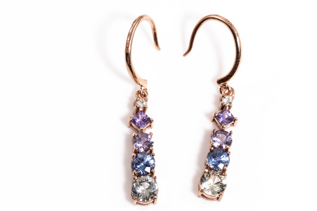 Sapphire shepherd hook drop earrings with round & carre cut Sapphires totalling approximately 0.85cts (including 2 light yellow round un-heated Ceylon Sapphire with gem report #CA25149) and 2 round Diamonds totalling approximately 0.06cts. 18ct rose Gold. Weight 2.5g. (As New)
