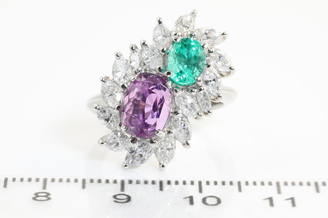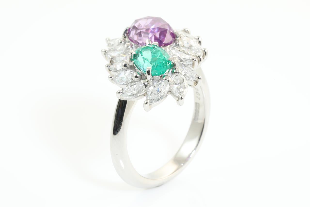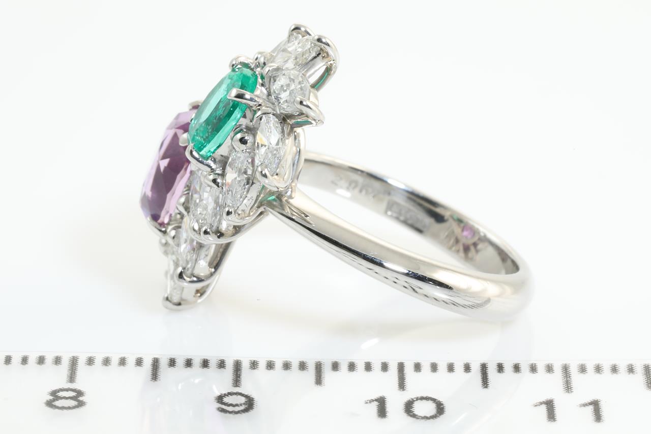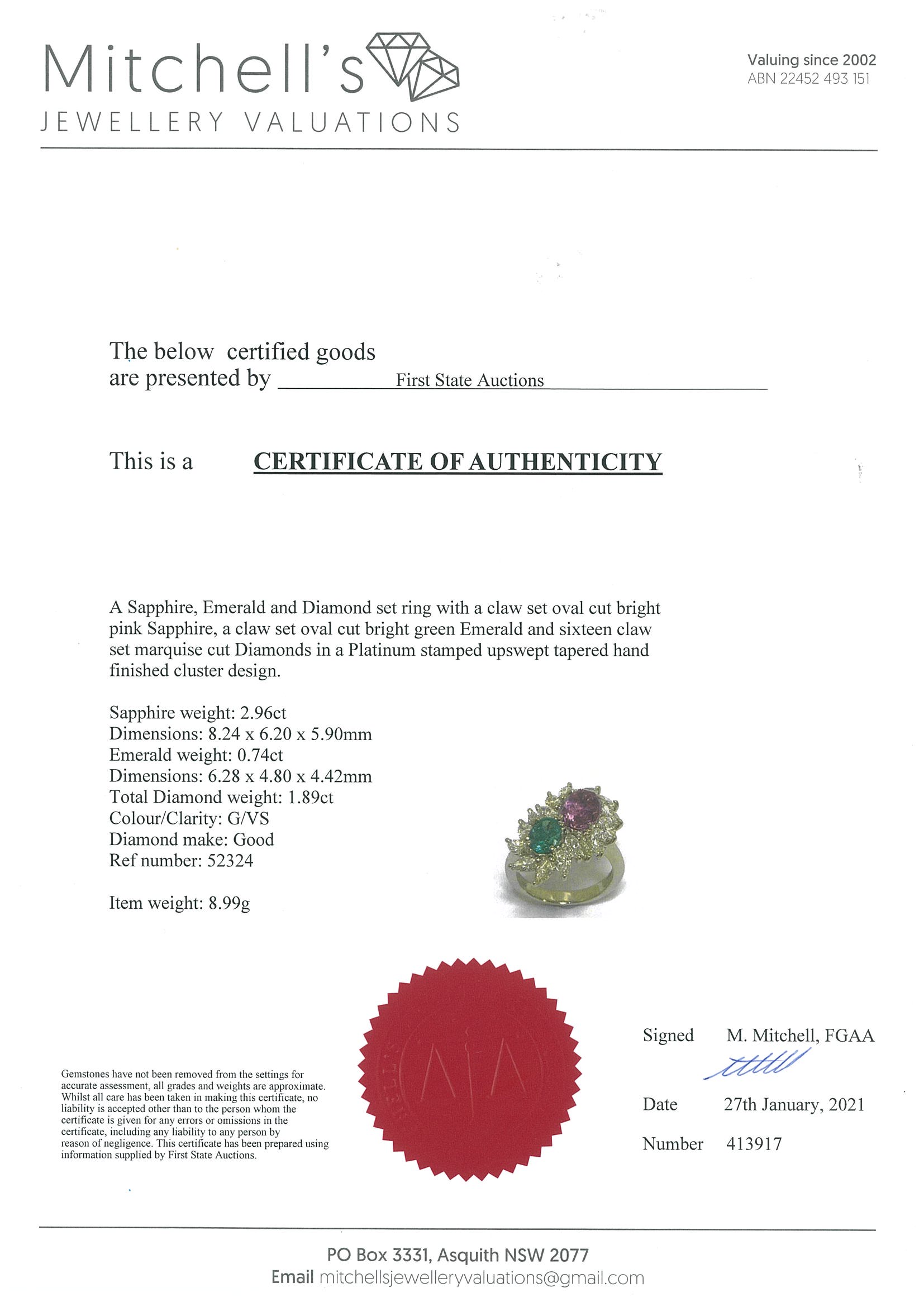 Sapphire, Emerald and Diamond ring with oval pink Sapphire of 2.96ct, oval Emerald of 0.74ct and Diamonds totalling 1.89cts (Estimated grading: G VS). Platinum. Ring size: K1/2. Weight: 8.99g. With certificate #413917. (Pre-owned)