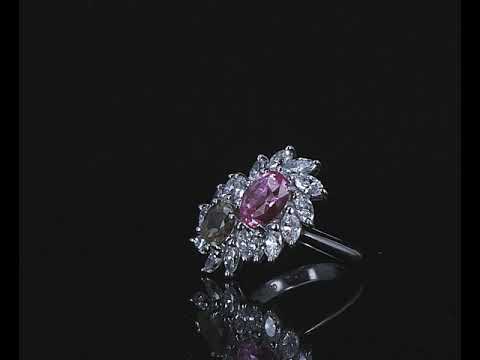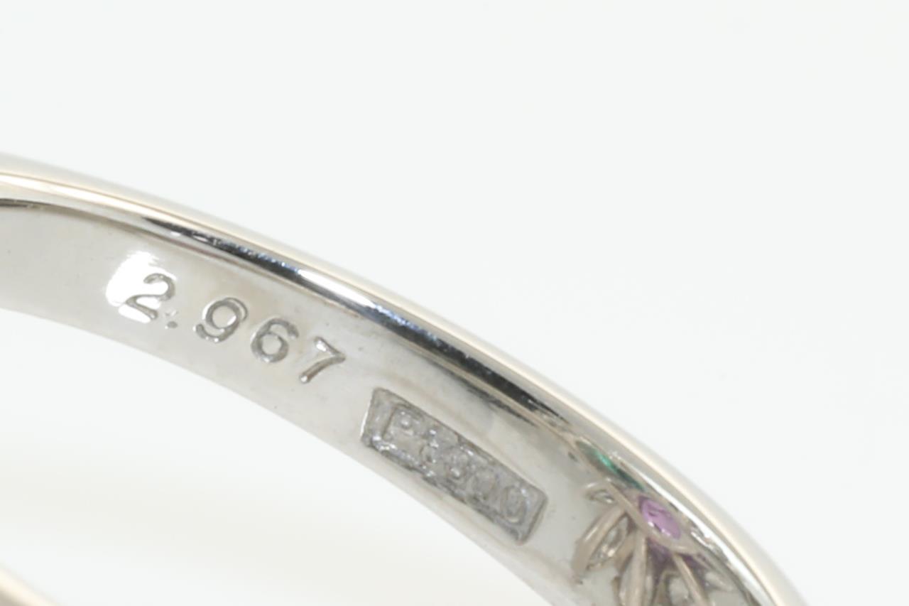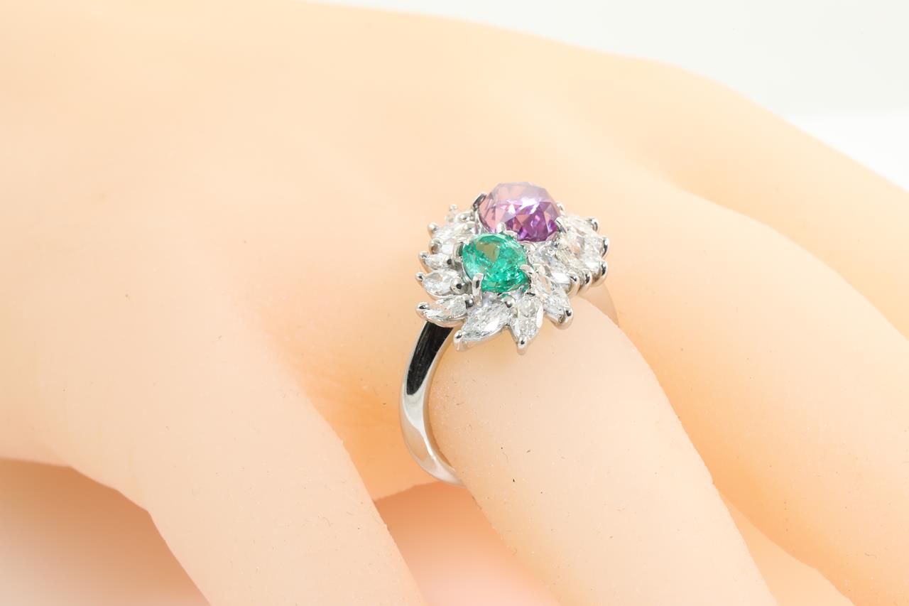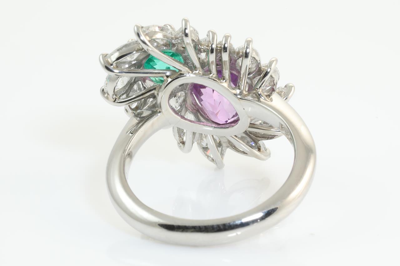 Sapphire, Emerald and Diamond ring with oval pink Sapphire of 2.96ct, oval Emerald of 0.74ct and Diamonds totalling 1.89cts (Estimated grading: G VS). Platinum. Ring size: K1/2. Weight: 8.99g. With certificate #413917. (Pre-owned)