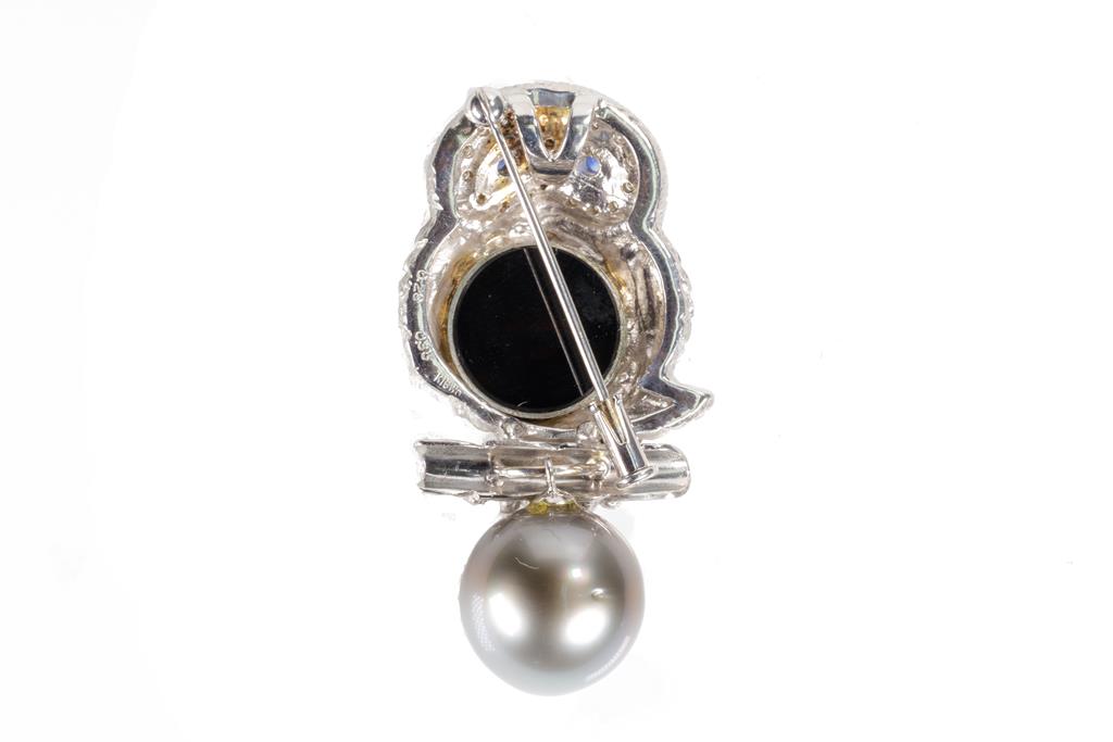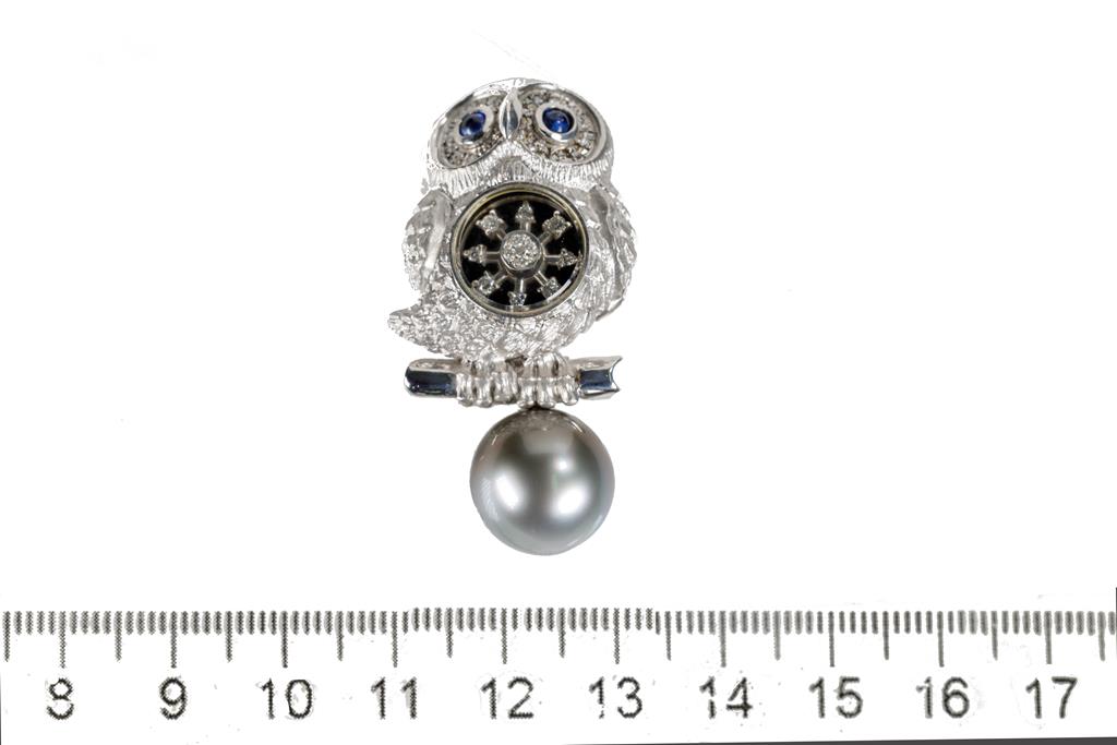 Sapphire, Pearl and Diamond owl design brooch with Sapphires totalling 0.28cts, Tahitian Pearl of 13.0mm and round Diamonds totalling 0.35cts (Estimated grading: H-J SI). 18ct white gold. Weight: 19.1g. (Pre-owned)