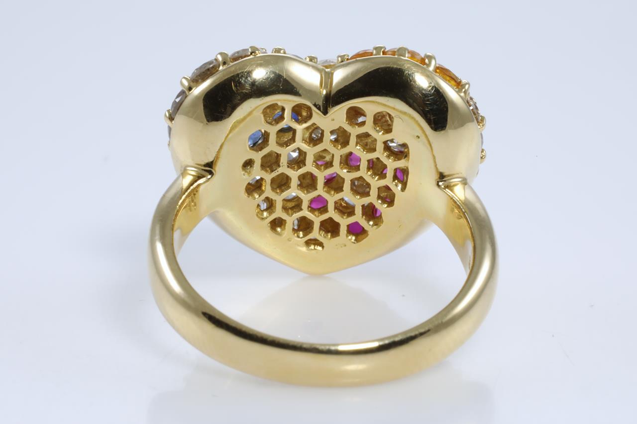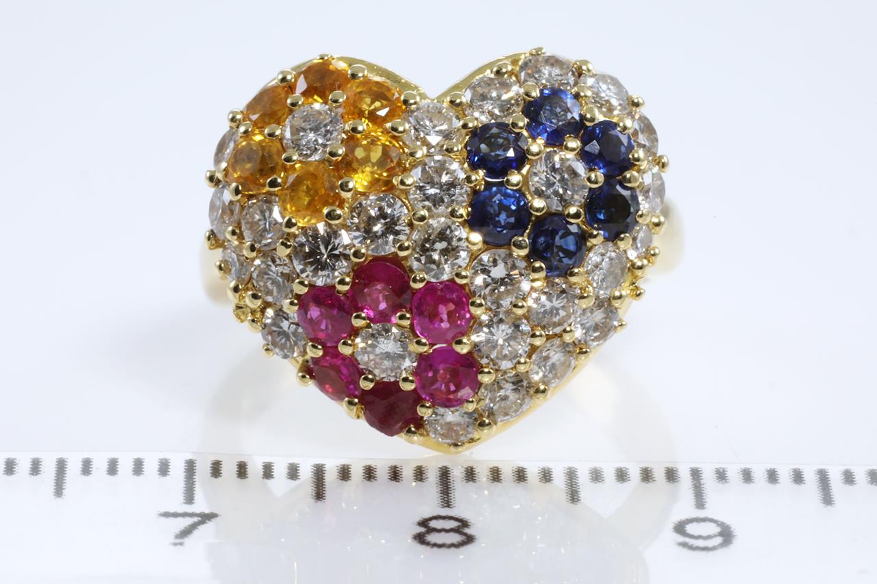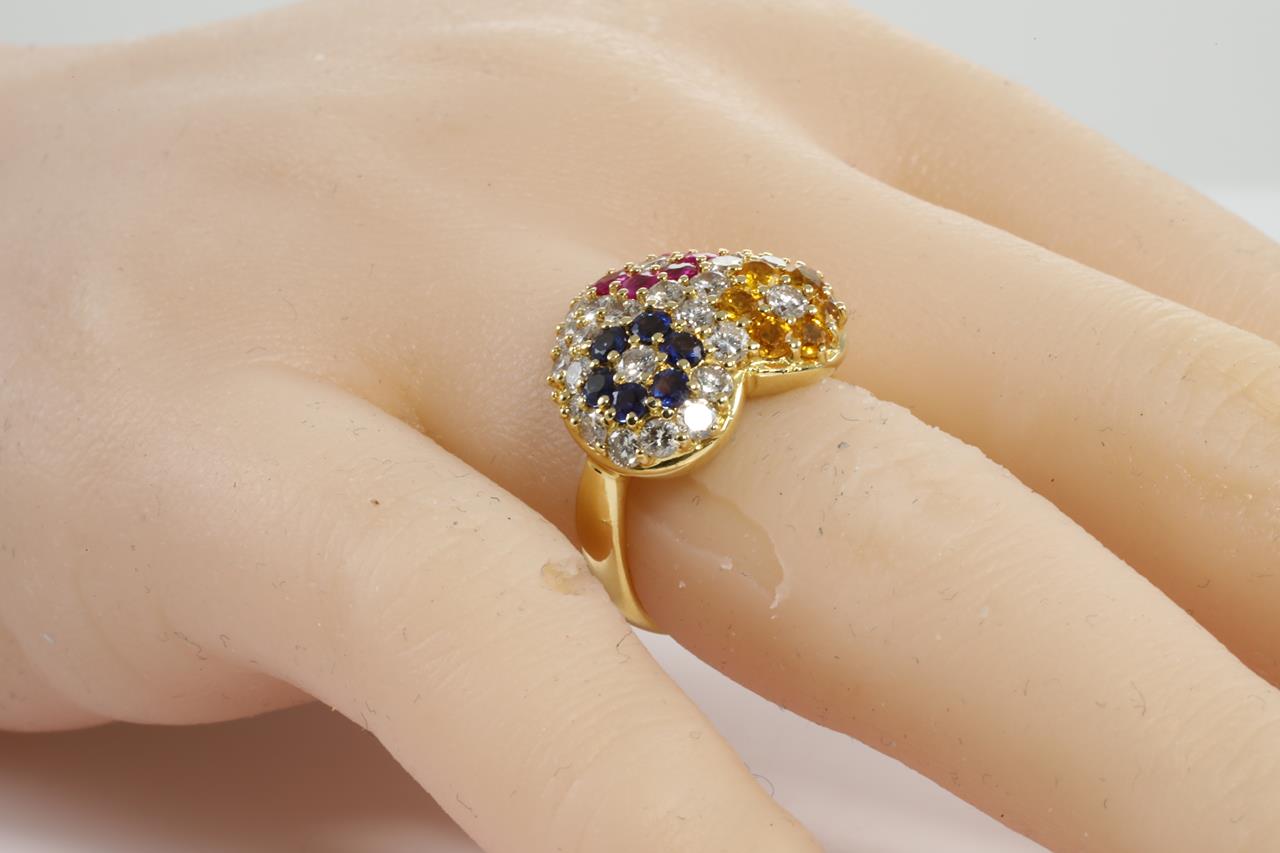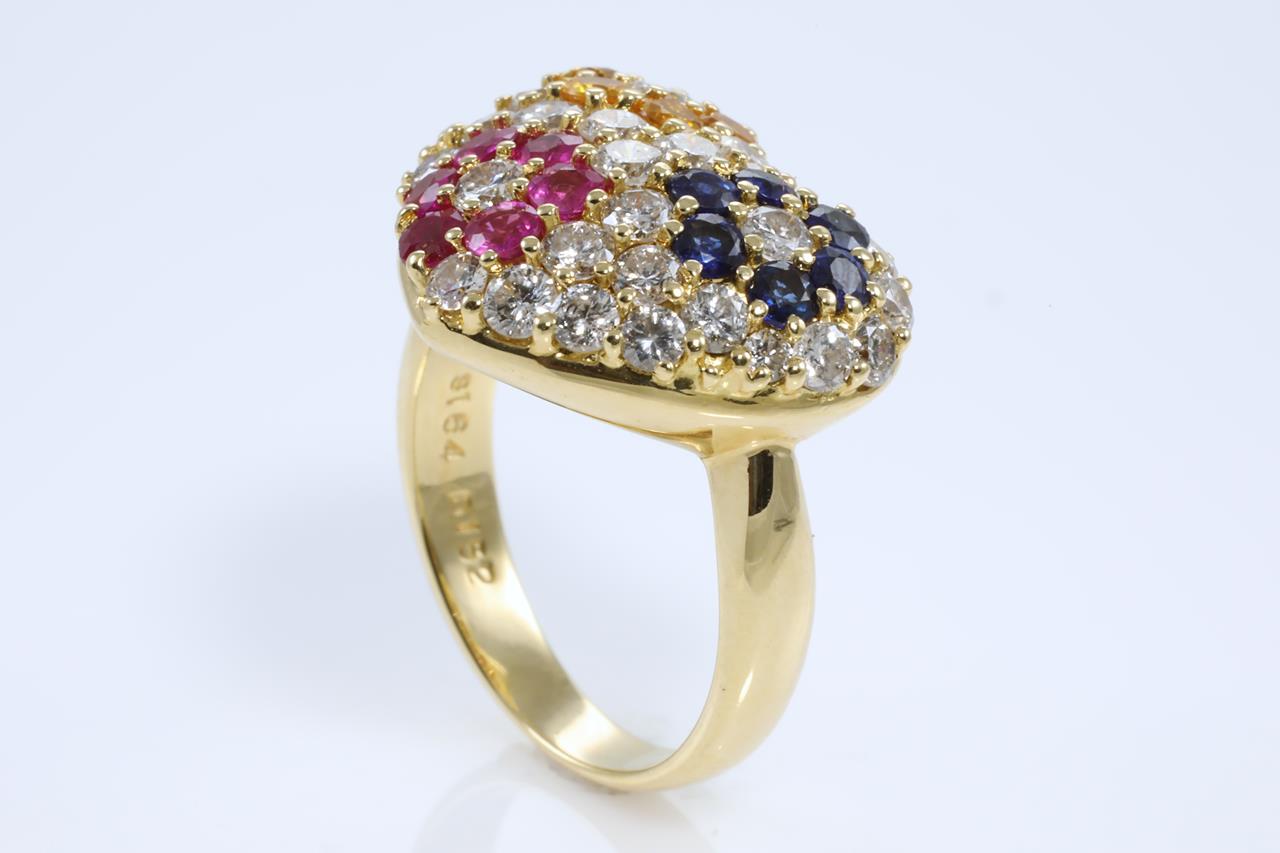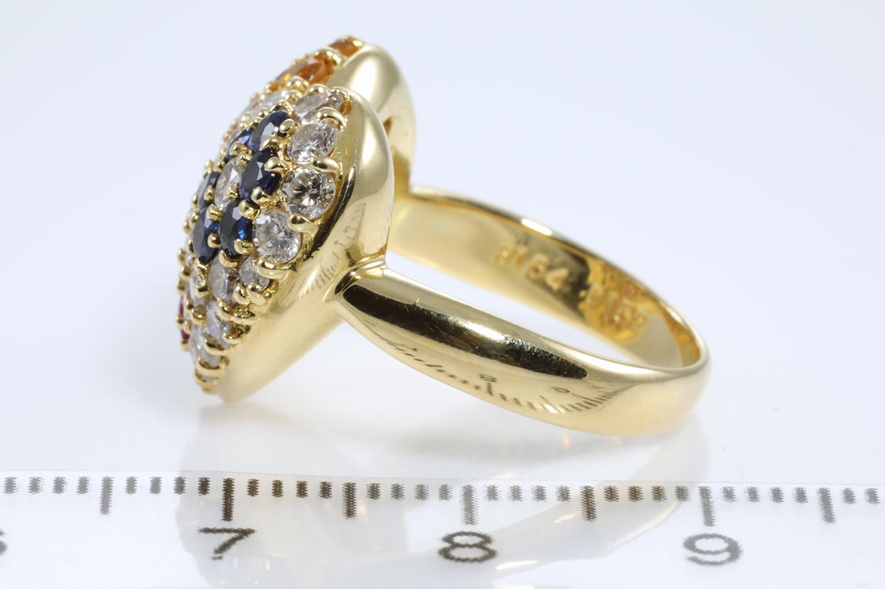 Dress ring with round blue & yellow Sapphires and Rubies totalling 1.64cts and Diamonds totalling 1.52cts (Estimated grading: I-J SI-P1). 18ct yellow gold. Ring size: L1/2. Weight: 9.1g. (Pre-Owned)