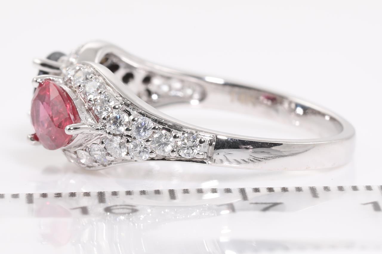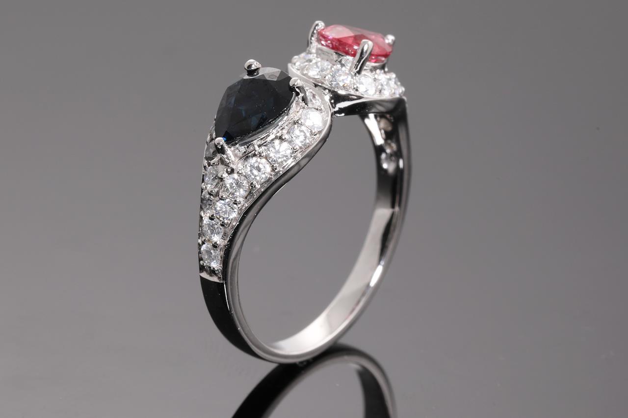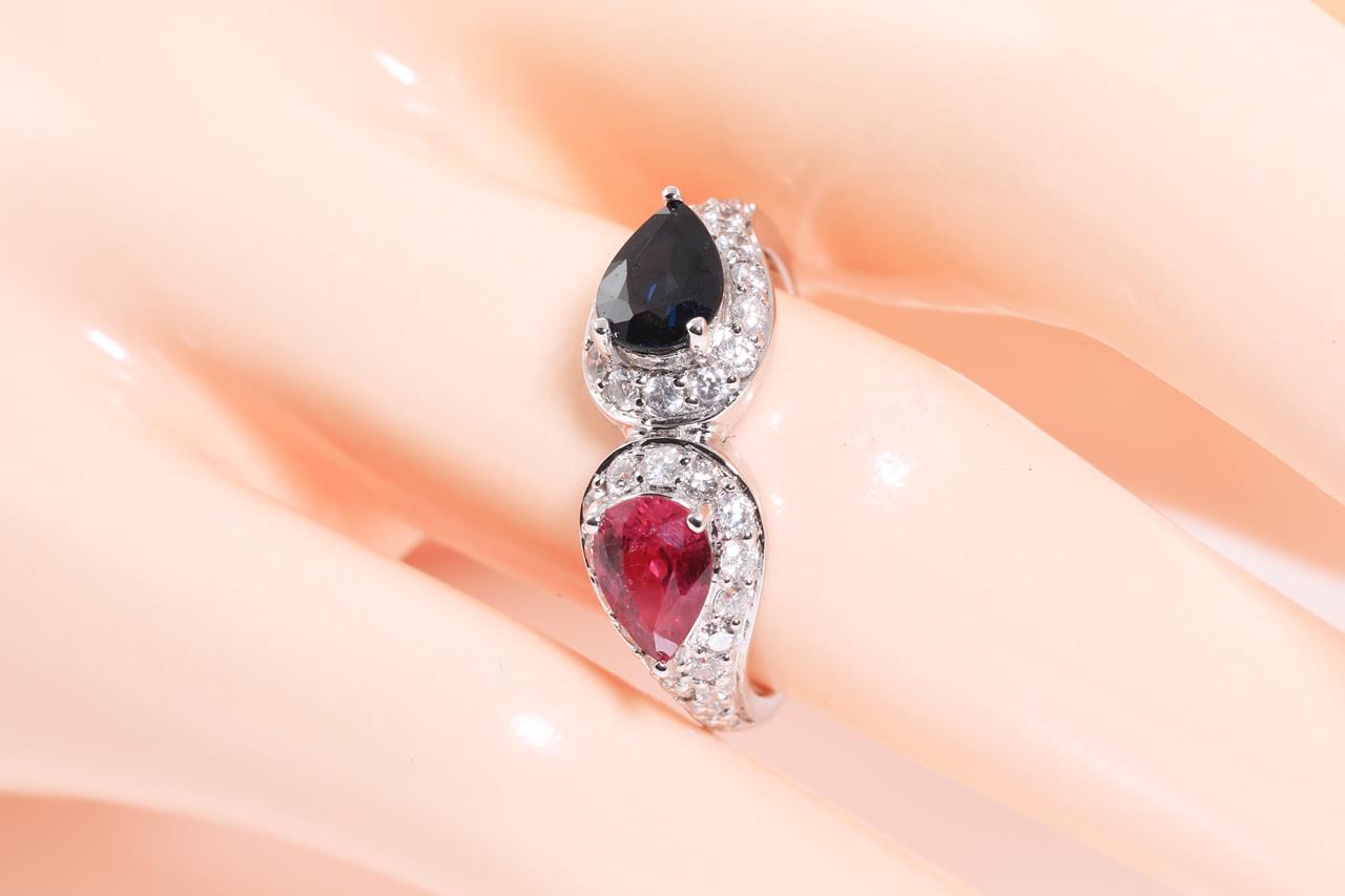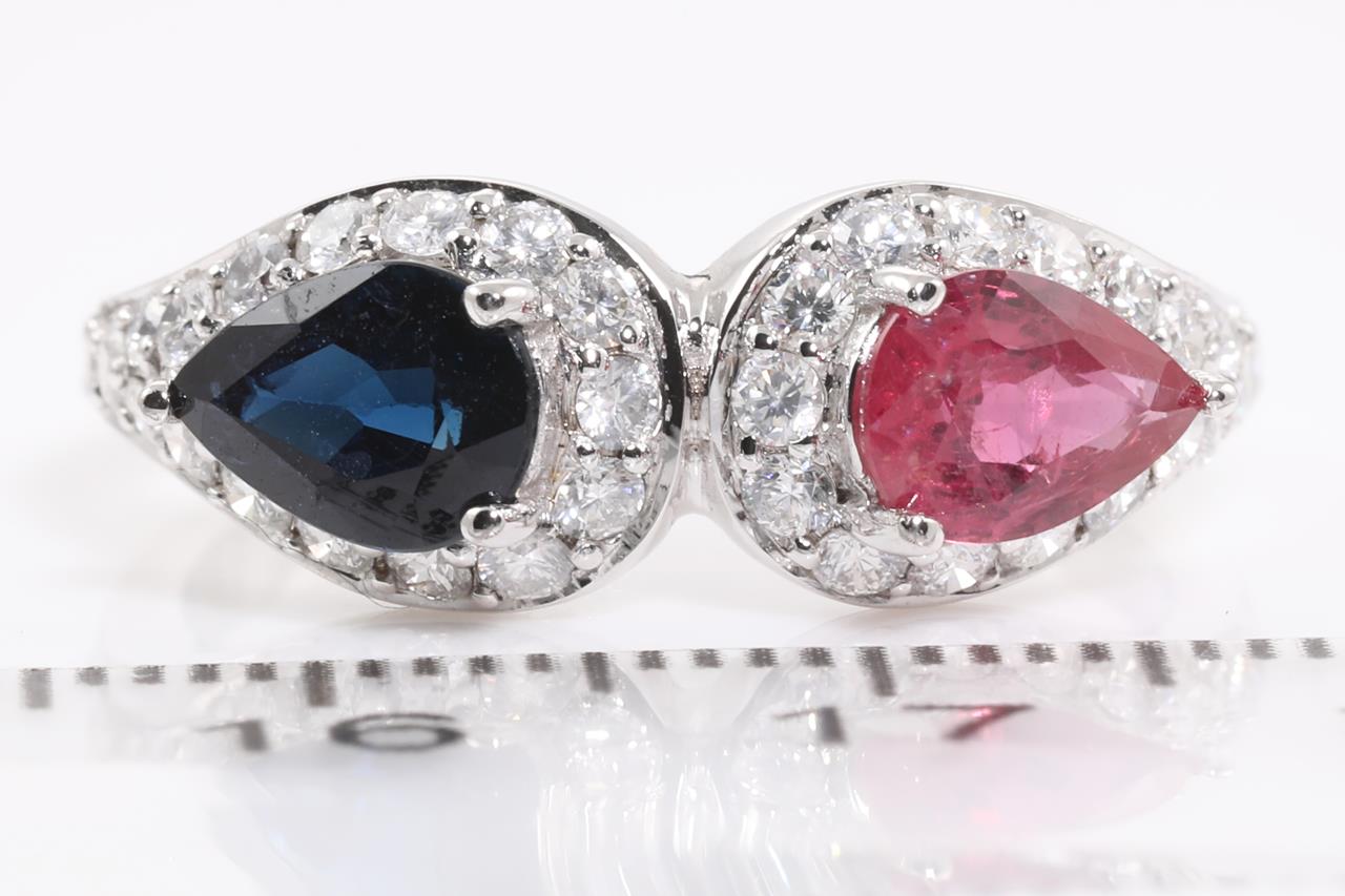 Sapphire, Ruby and Diamond Ring with pear shape blue Sapphire of approximately 0.90ct and pear shape Ruby of approximately 0.85ct and round Diamond totalling approximately 0.66cts (Estimated grading H SI). 14ct white gold. Ring size P 1/2. Weight 3.92g. (Pre-owned)