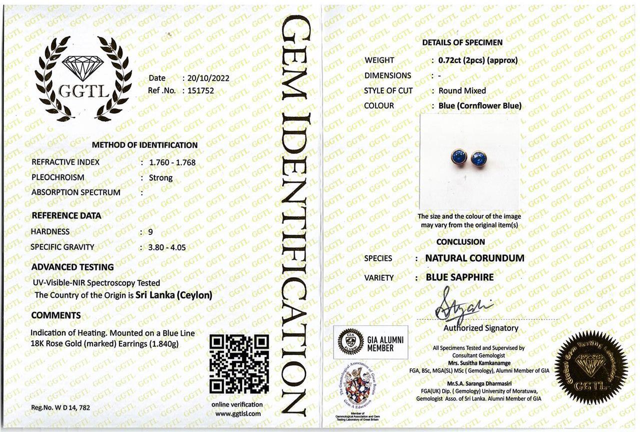 Sapphire stud earrings with round cut Ceylon cornflower blue Sapphire totalling approximately 0.72cts. 18ct rose gold. Weight 1.8g. With GGTL #151752. (As New)
