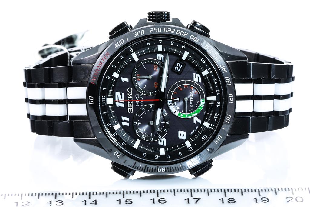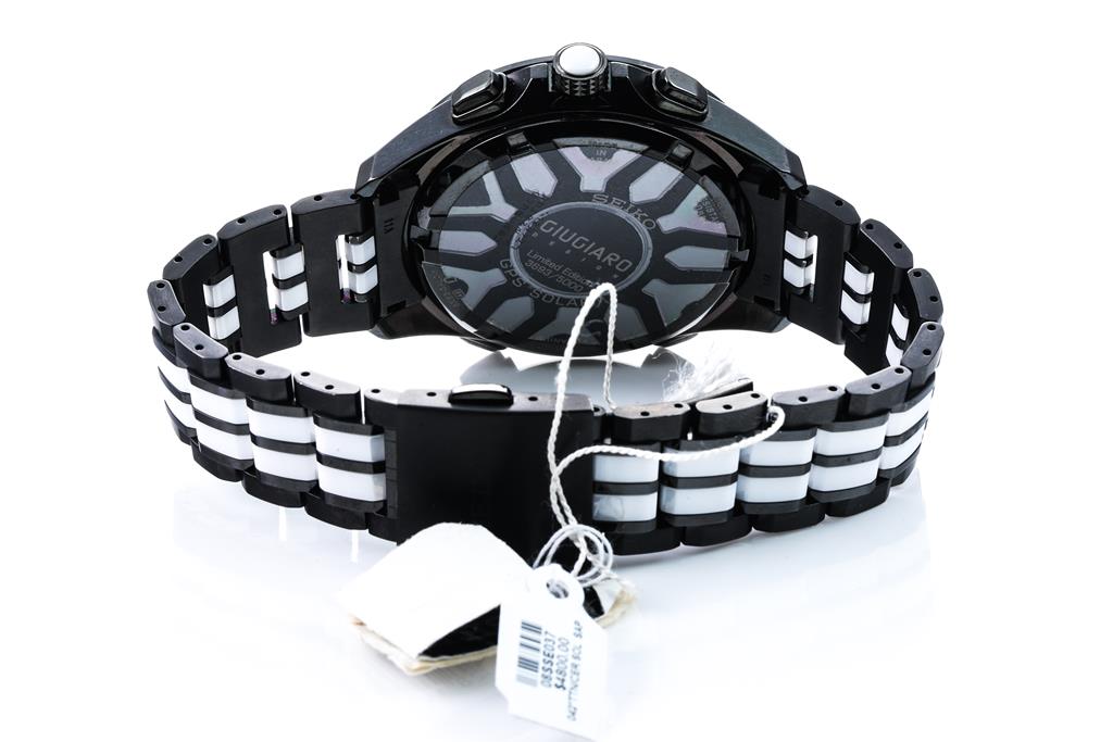 Seiko Astron Giugiaro Design Limited Edition of 5000 ceramic and titanium solar GPS mens watch. Black chronograph dial, date, case diameter: 44mm, wrist size: 20cm, Swiss made. Ref# SSE037J1. With Seiko ceramic and titanium bracelet and clasp. With Certificate of Authenticity, spare Seiko leather bracelet and Seiko box. 3 month FSA warranty. (As New, Note: minor scratches on case and bracelet)
