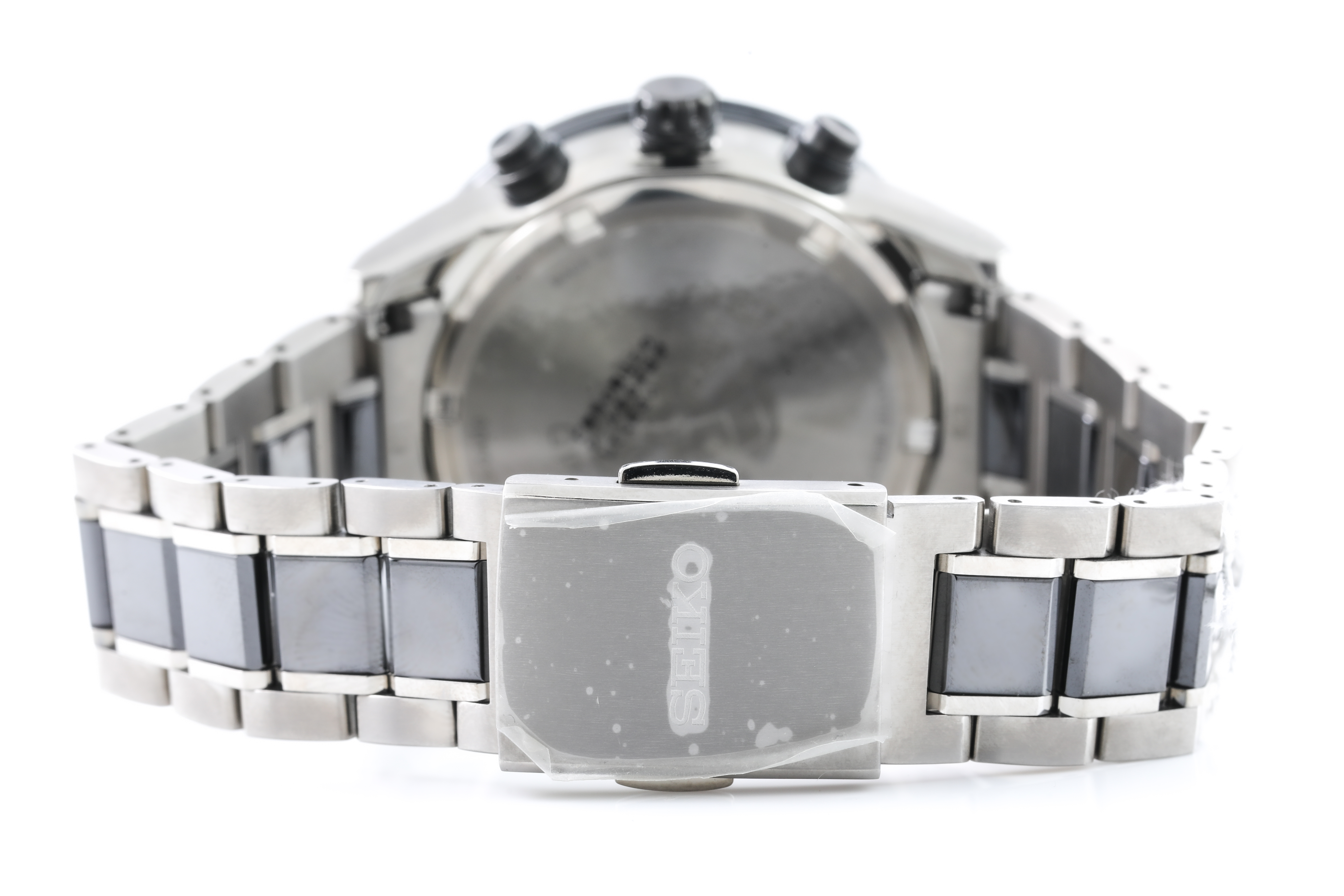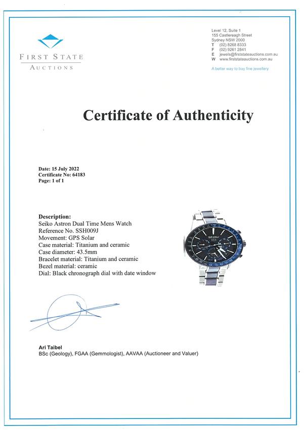 Seiko Astron Dual Time titanium and ceramic GPS Solar mens watch. Black dial, date, case diameter: 43.5mm, wrist size: 20cm, Made in Japan. Ref# SSH009J. With Seiko ceramic and titanium bracelet and clasp. With Certificate of Authenticity and Seiko box. 3 month FSA warranty. (As New, Note: minor scratches due to being display stock)