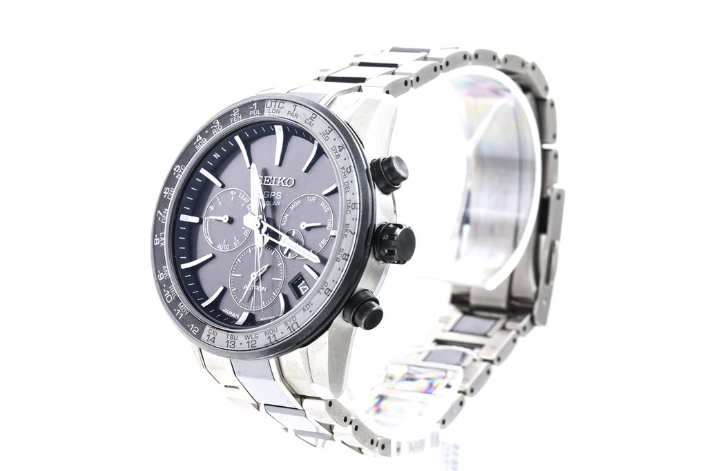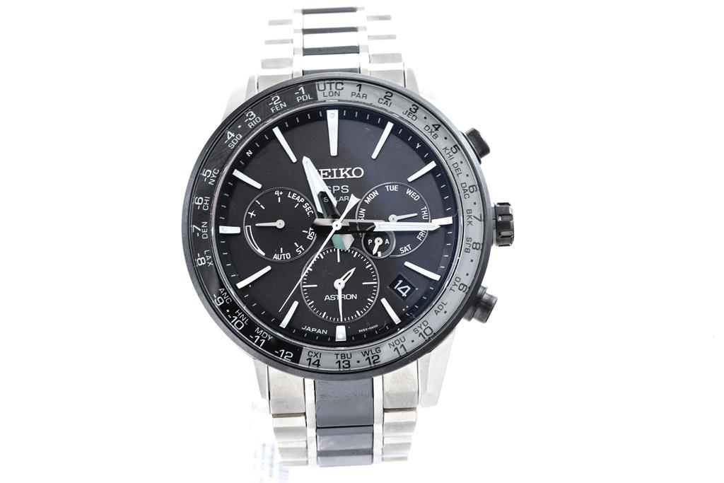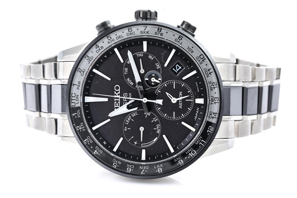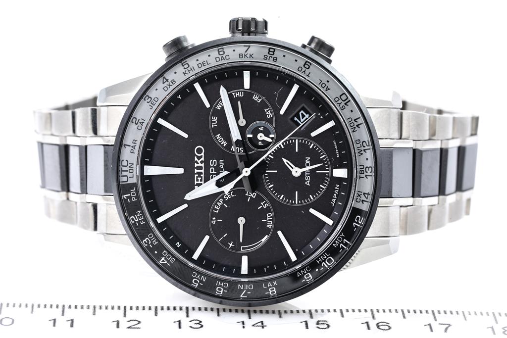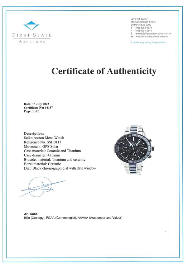 Seiko Astron ceramic and titanium GPS solar mens watch. Black chronograph dial, date, case diameter: 43.5mm, wrist size: 20cm, Made in Japan. Ref# SSH011J. With Seiko titanium and ceramic bracelet and clasp. With Certificate of Authenticity. No box provided. 3 month FSA warranty. (As New, Note: minor scratches on case and bracelet due to being display stock)