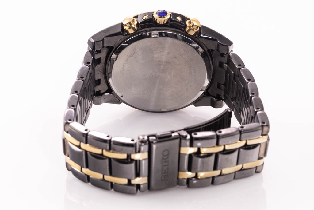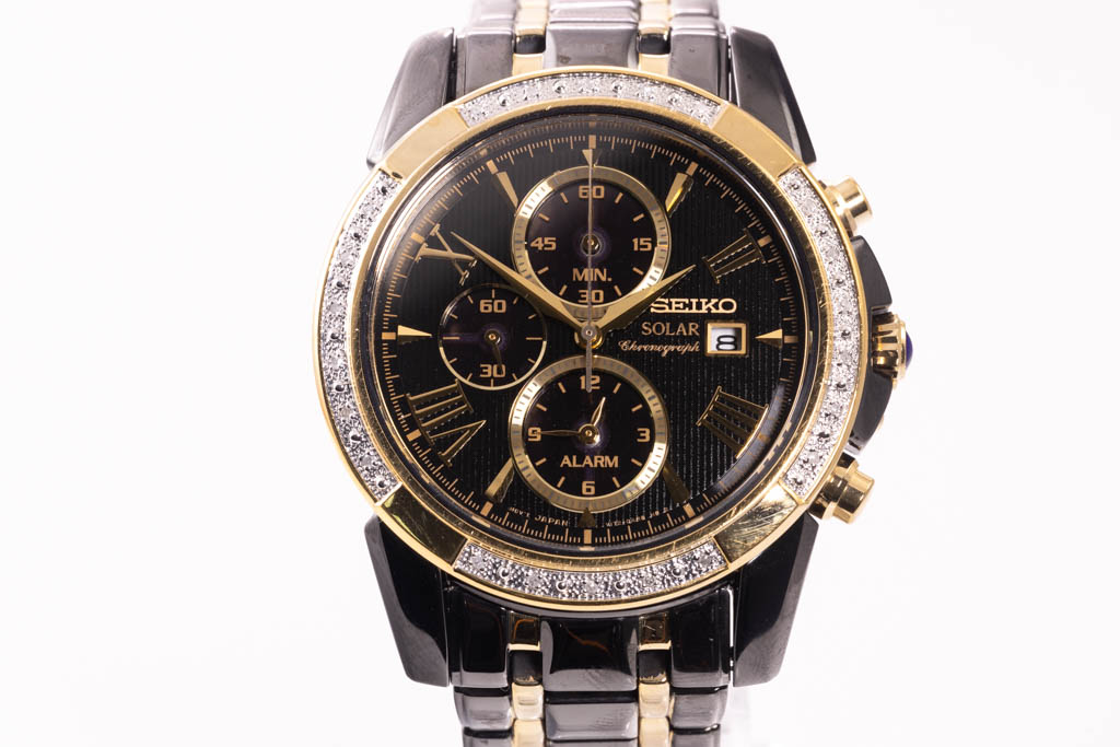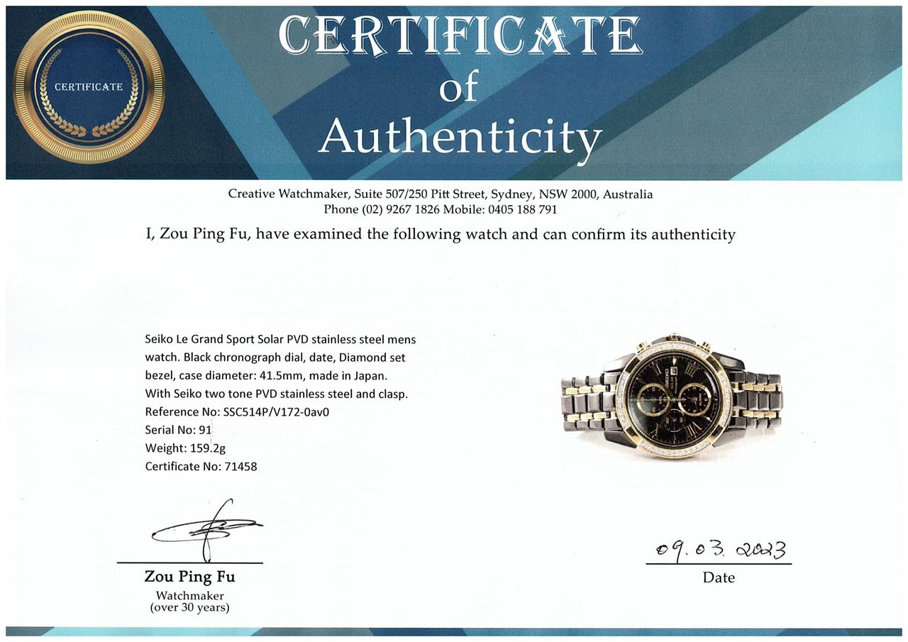 Seiko Le Grand Sport Solar PVD stainless steel mens watch. Black chronograph dial, date, Diamond set bezel, case diameter: 41.5mm, wrist size: 18cm, made in Japan. Ref# SSC514P/V172-0av0. With Seiko two tone PVD stainless steel and clasp. With Certificate of Authenticity. 3 month FSA warranty. (Pre-owned)