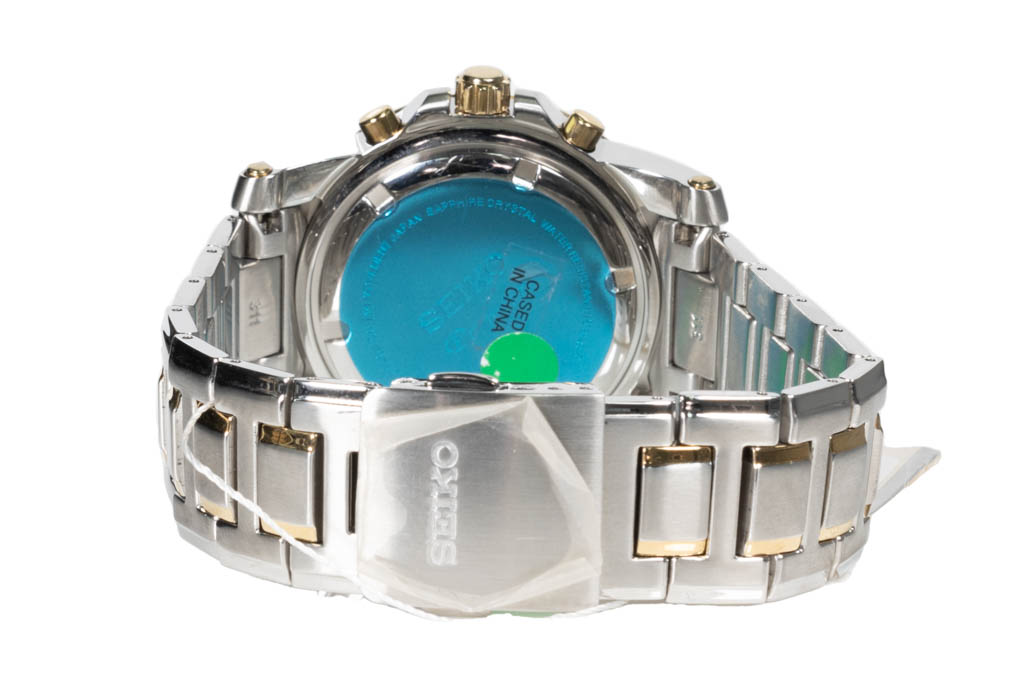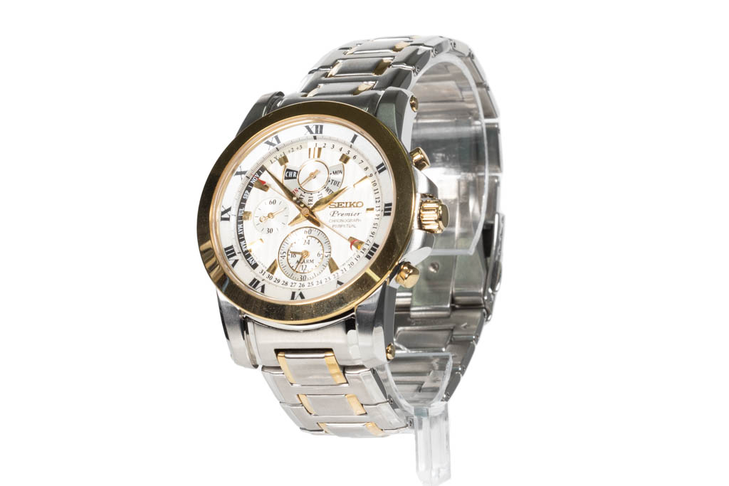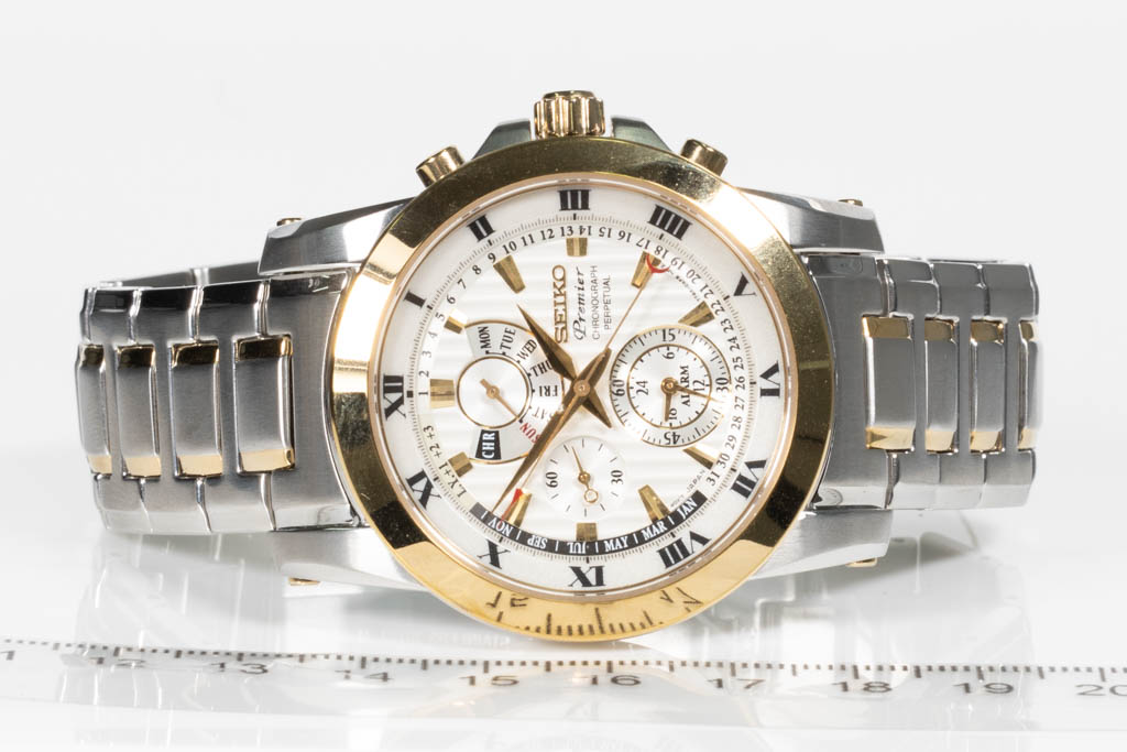 Seiko Premier gold tone and stainless steel quartz mens watch. White chronograph dial, case diameter: 41.5mm, wrist size: 20cm, made in Japan. Ref# SPC162P. With Seiko two tone bracelet and clasp. With Seiko Certificate of Limited Guarantee card and Seiko box. Seiko warranty applies. (As New, minor scratches on case and bracelet due to being display stock)